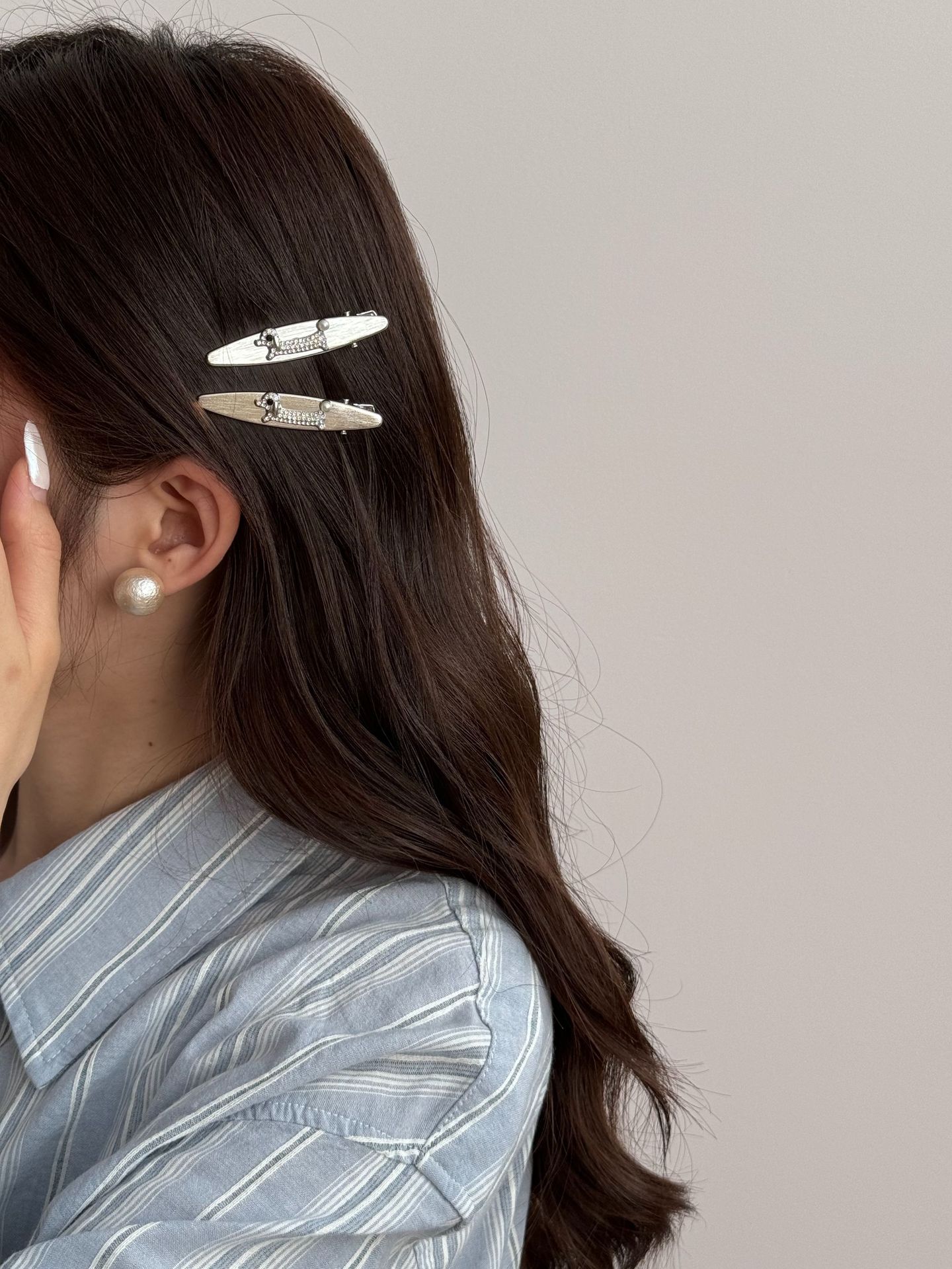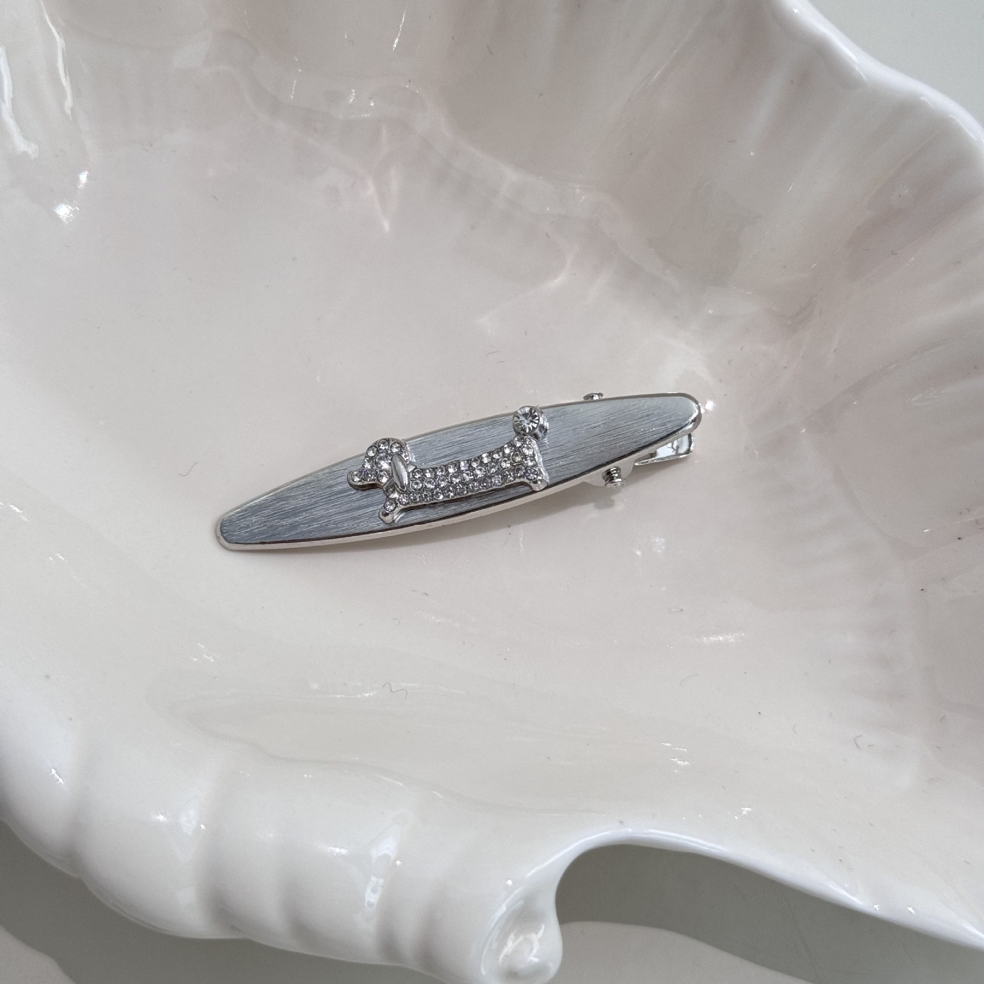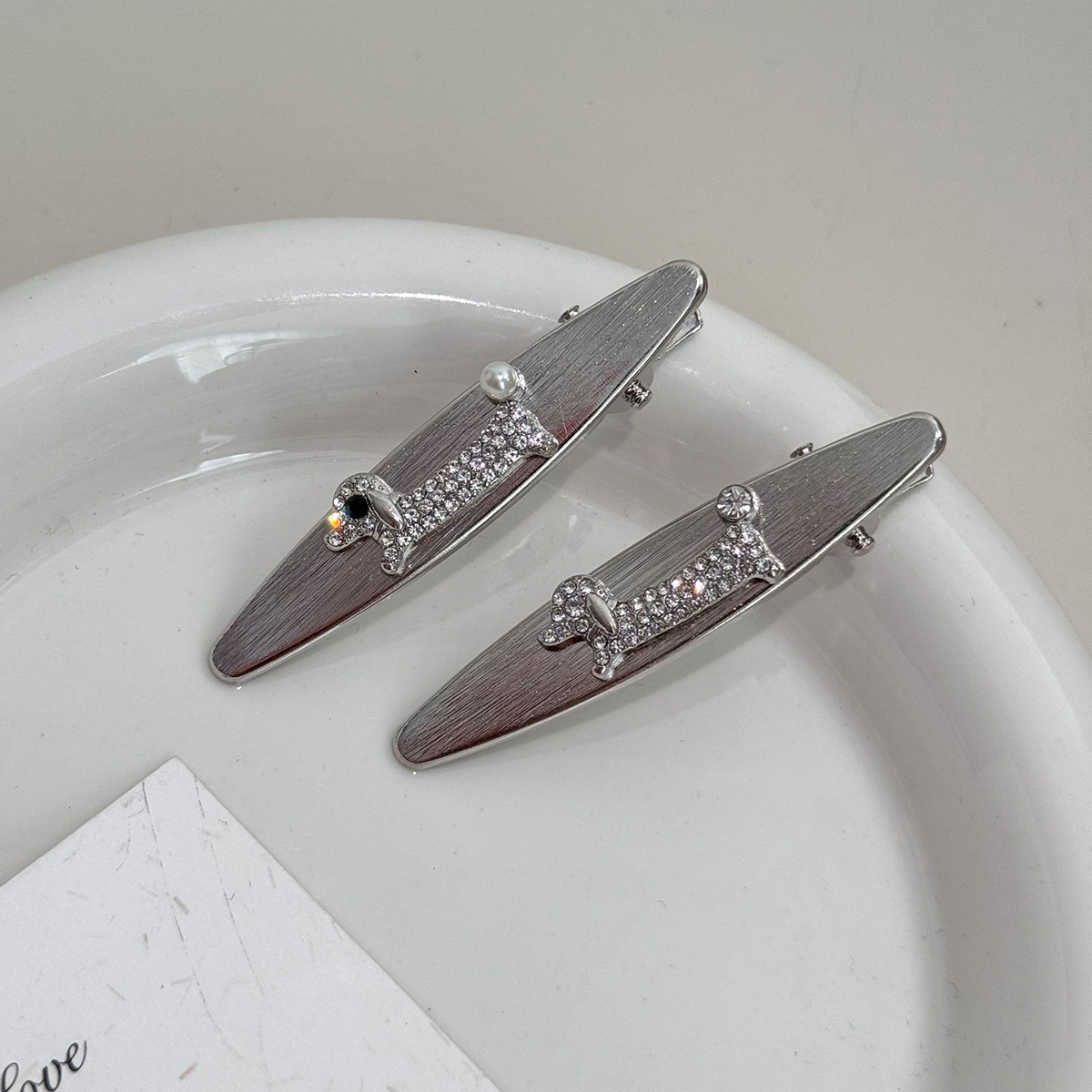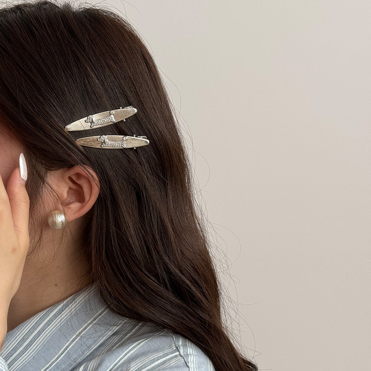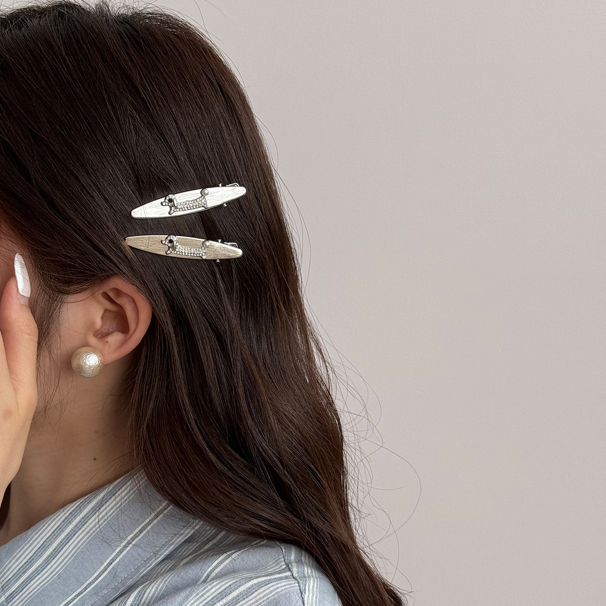 银色高级感小香风珍珠水钻腊肠小狗2025年新款侧边夹子前额碎发夹 投诉