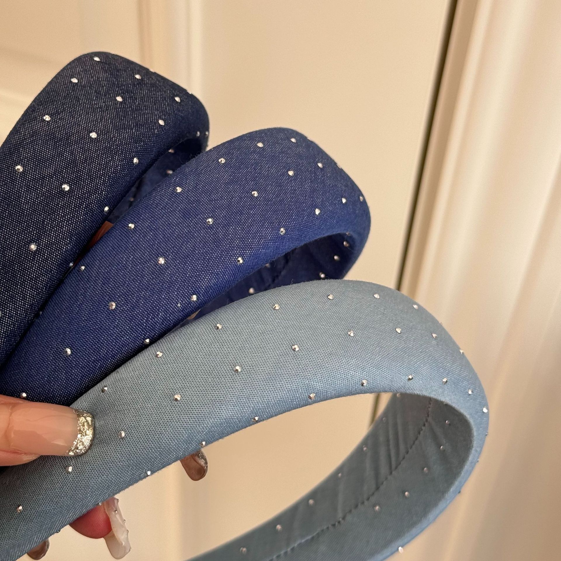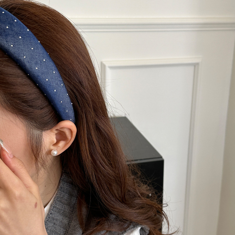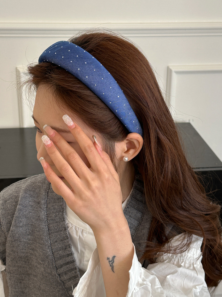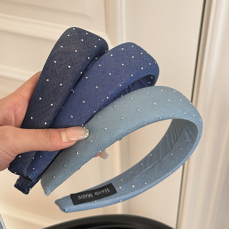 韩版牛仔蓝水钻发箍女宽版时髦高颅顶头箍网红外出百搭发卡发饰品