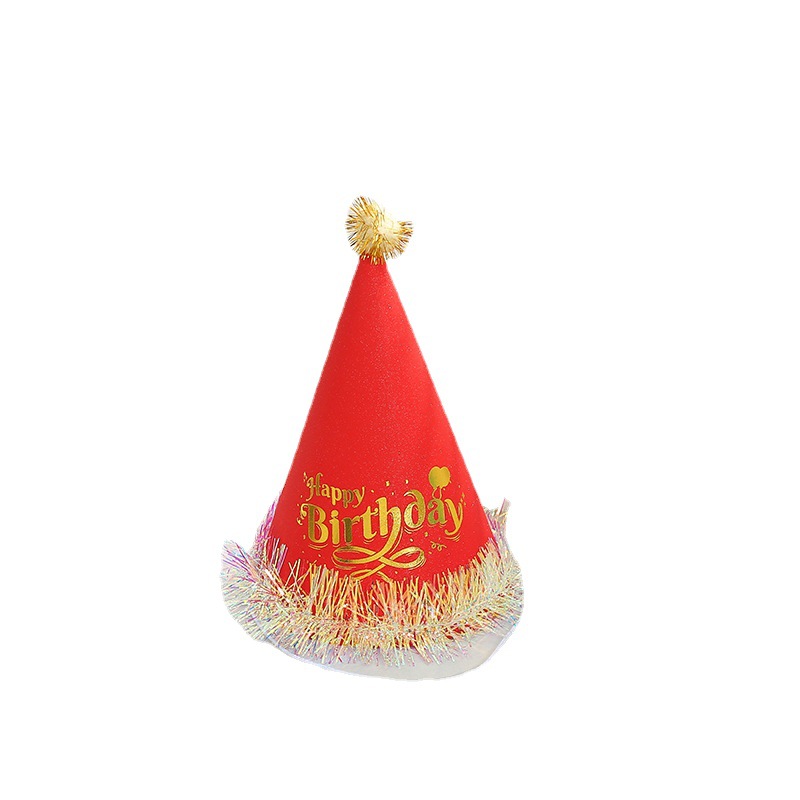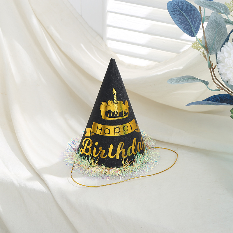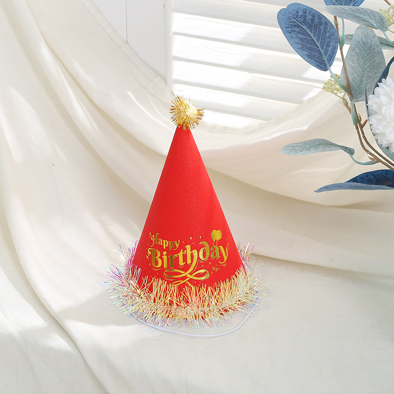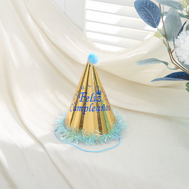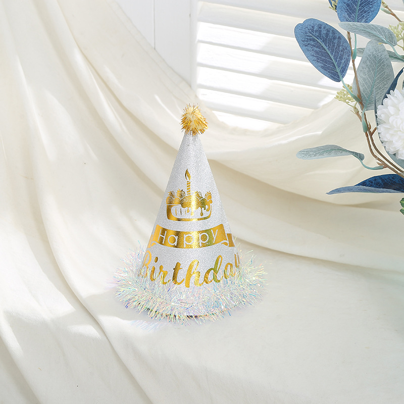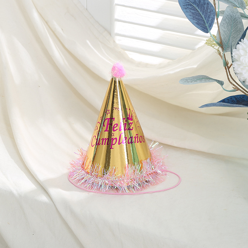 英文烫金印花儿童生日帽可爱毛绒球装饰尖顶帽白卡纸帽厂家批发 English | 投诉