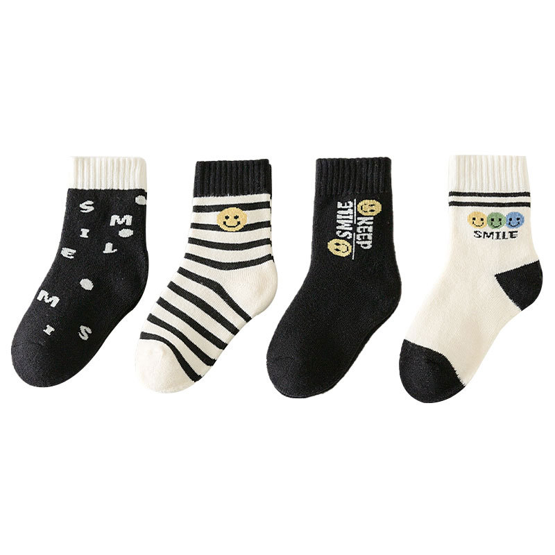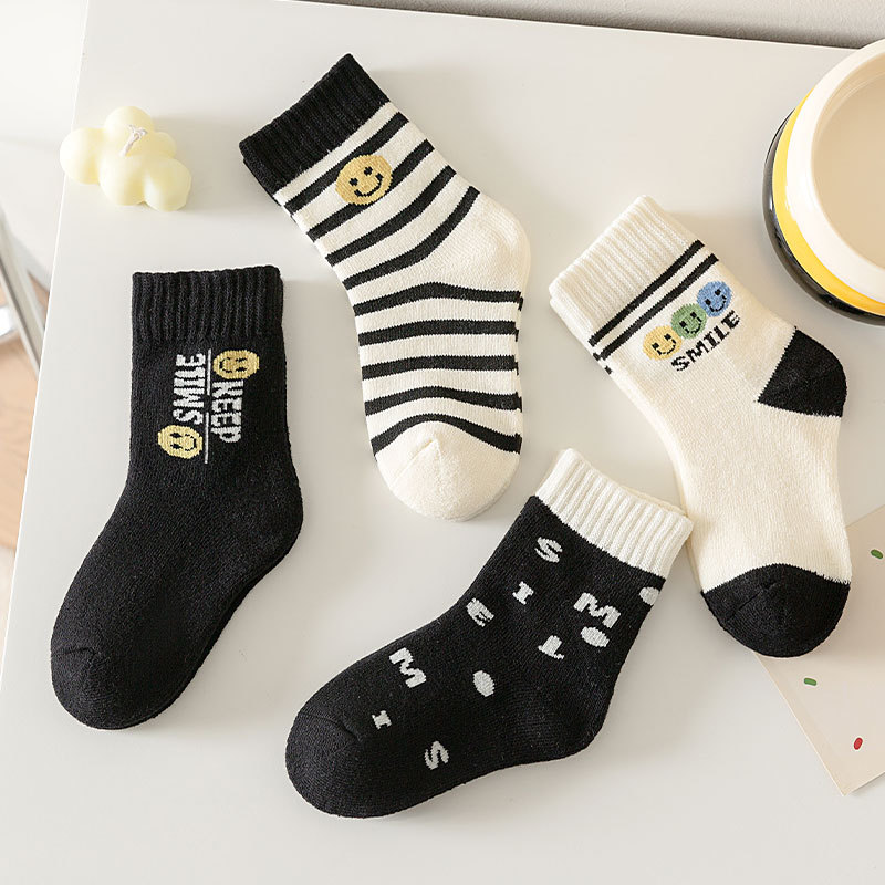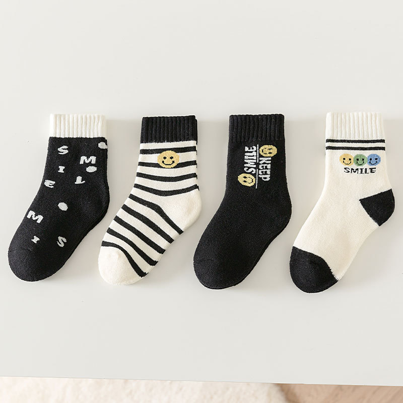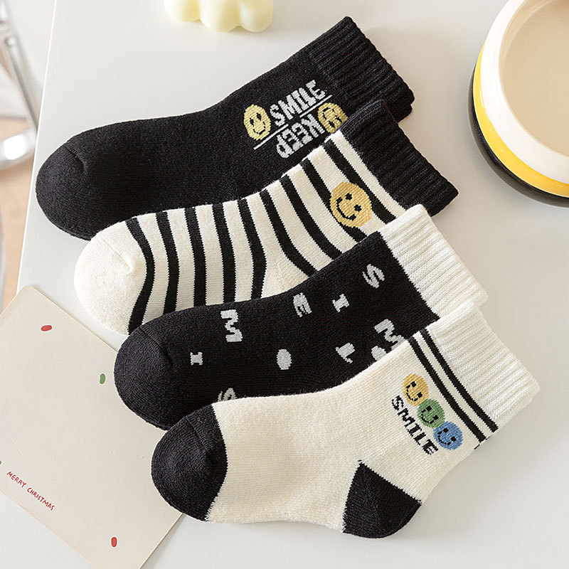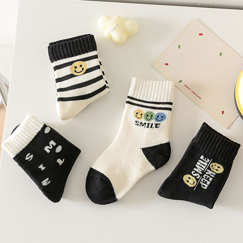 冬季加绒儿童毛圈袜卡通笑脸条纹中筒袜可爱男女童柔软保暖棉童袜