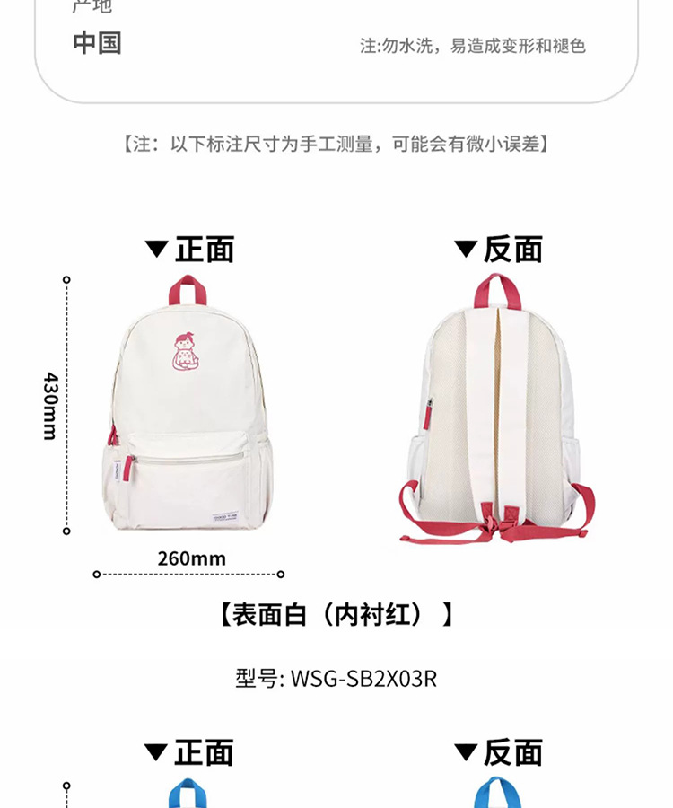 货号: WSG-SB2X03 适用性别: 中性/男女均可 适用学龄: 高中以下 材质: 尼龙+涤纶 功能: 透气,防水,超轻 风格: 童趣可爱 里料质地: 涤纶 品牌: 国誉 图案: 人物 流行元素: 印花,压花,锁扣,其他 颜色: 红色,绿色,蓝色 有可授权的自有品牌: 是 上市年份季节: 2024年夏季 适用场景: 学校教育 背负系统: 弧形肩带 重量: 1.0 kg/个