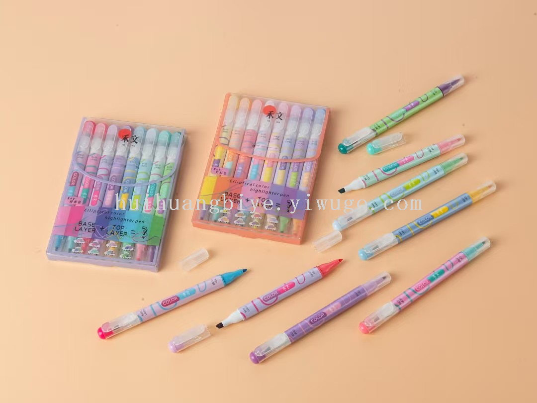 新款椭圆双头荧光笔叠色高颜值学生套装彩色重点标记笔6色套装