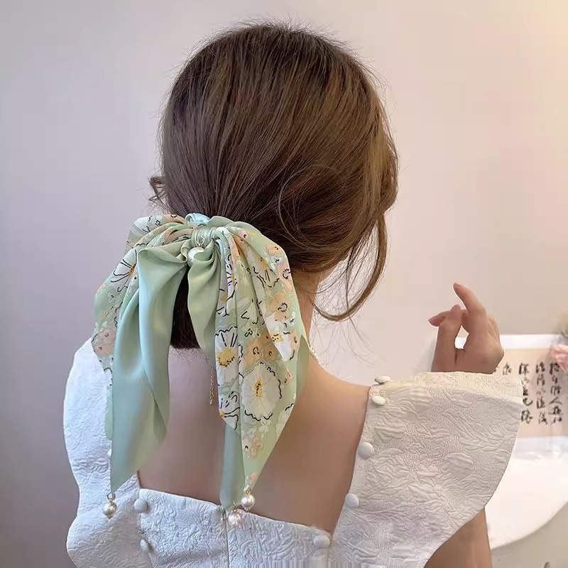 夏季清新蝴蝶结飘带发圈珍珠吊坠扎马尾发饰2025新款法式丝巾头绳