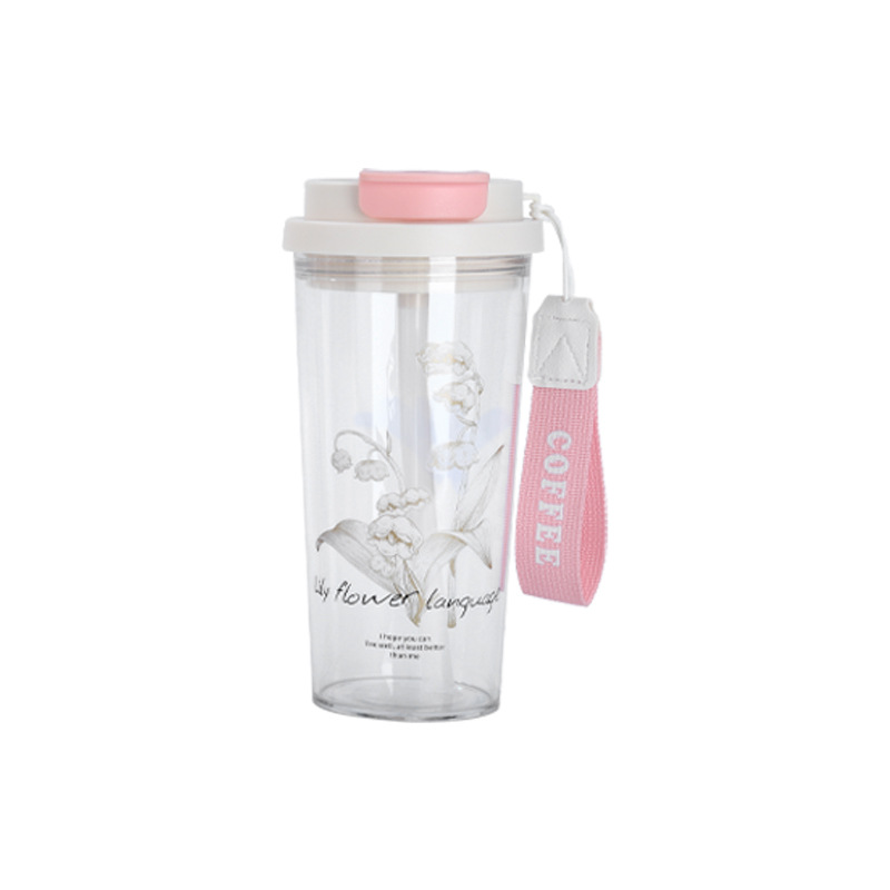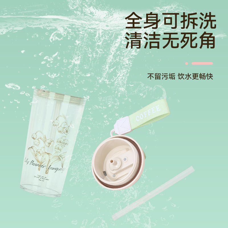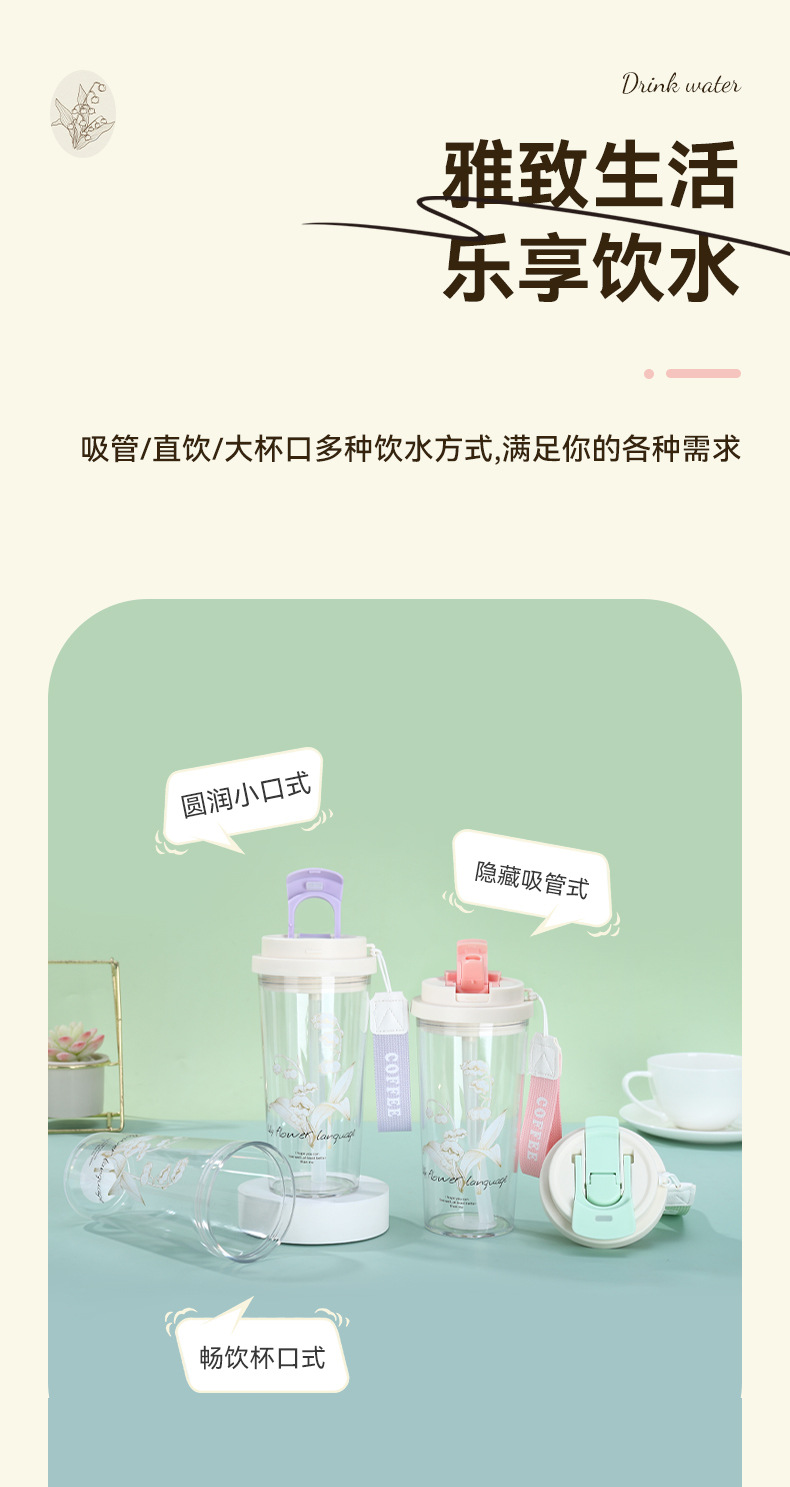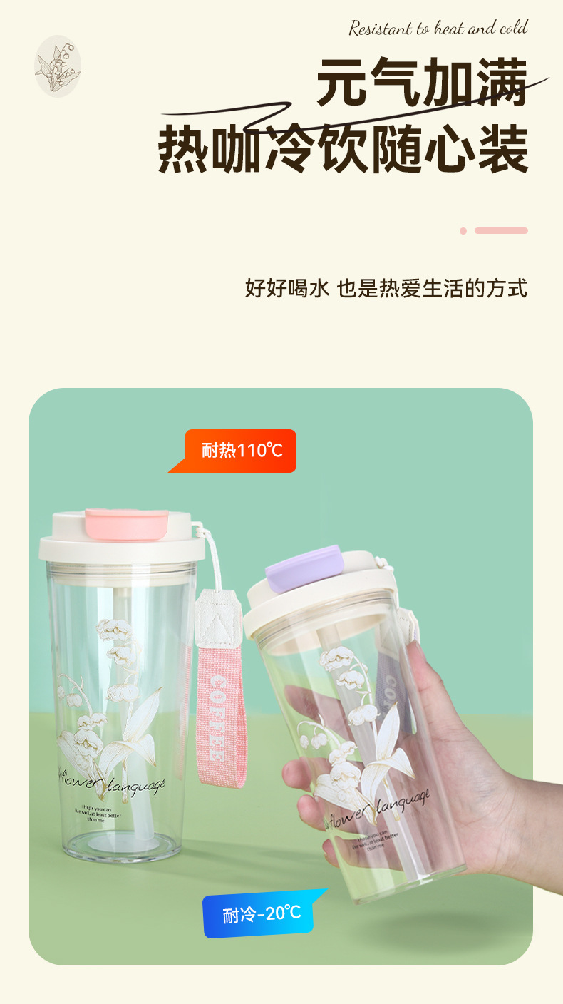 新款铃兰花塑料咖啡杯耐高温简约带提绳双饮杯户外便携随行吸管杯