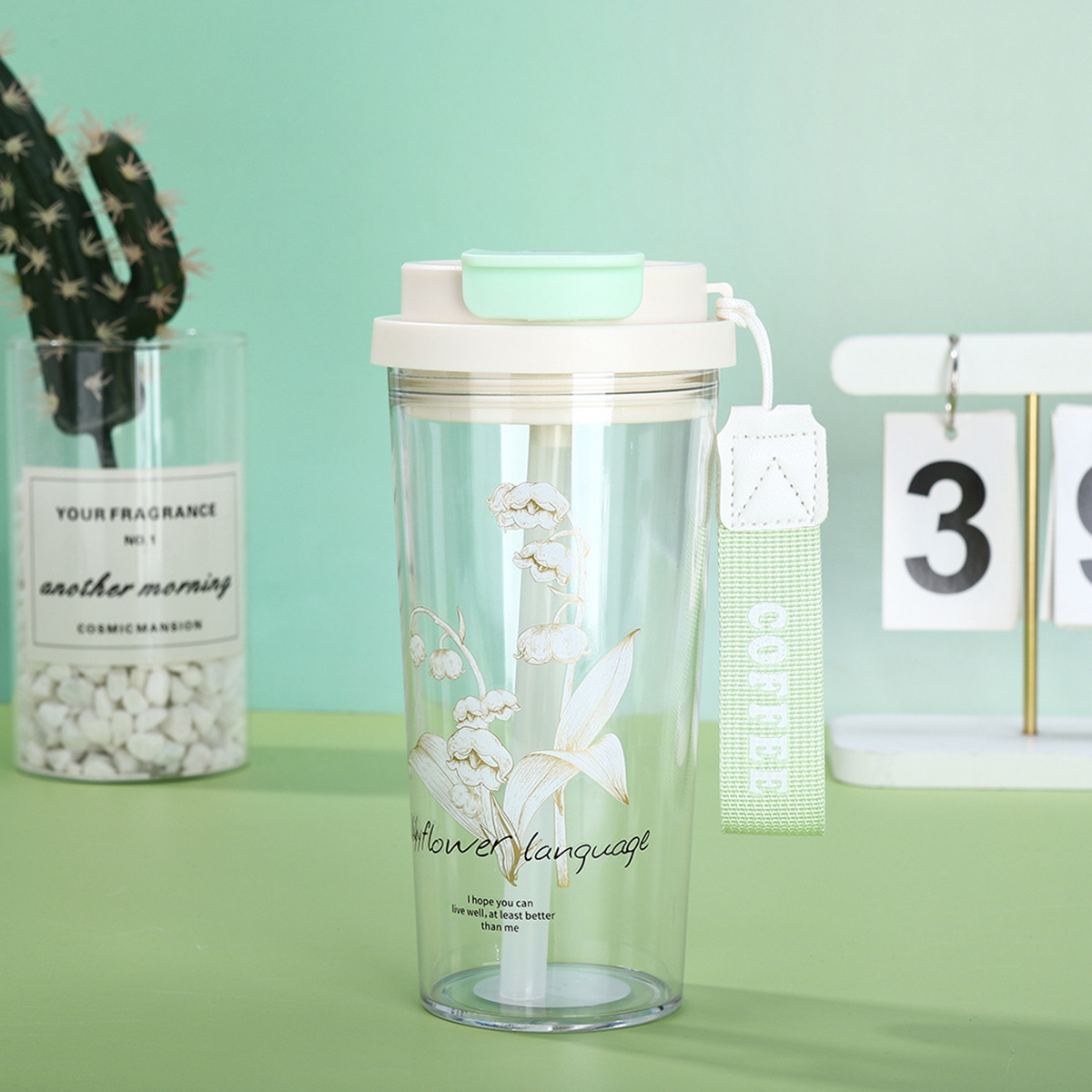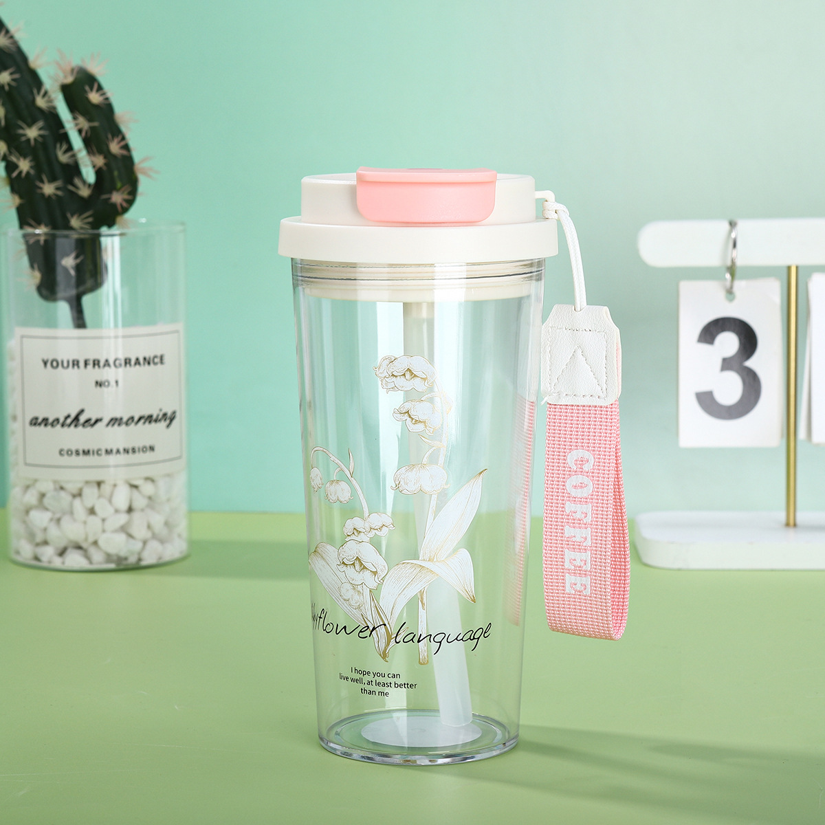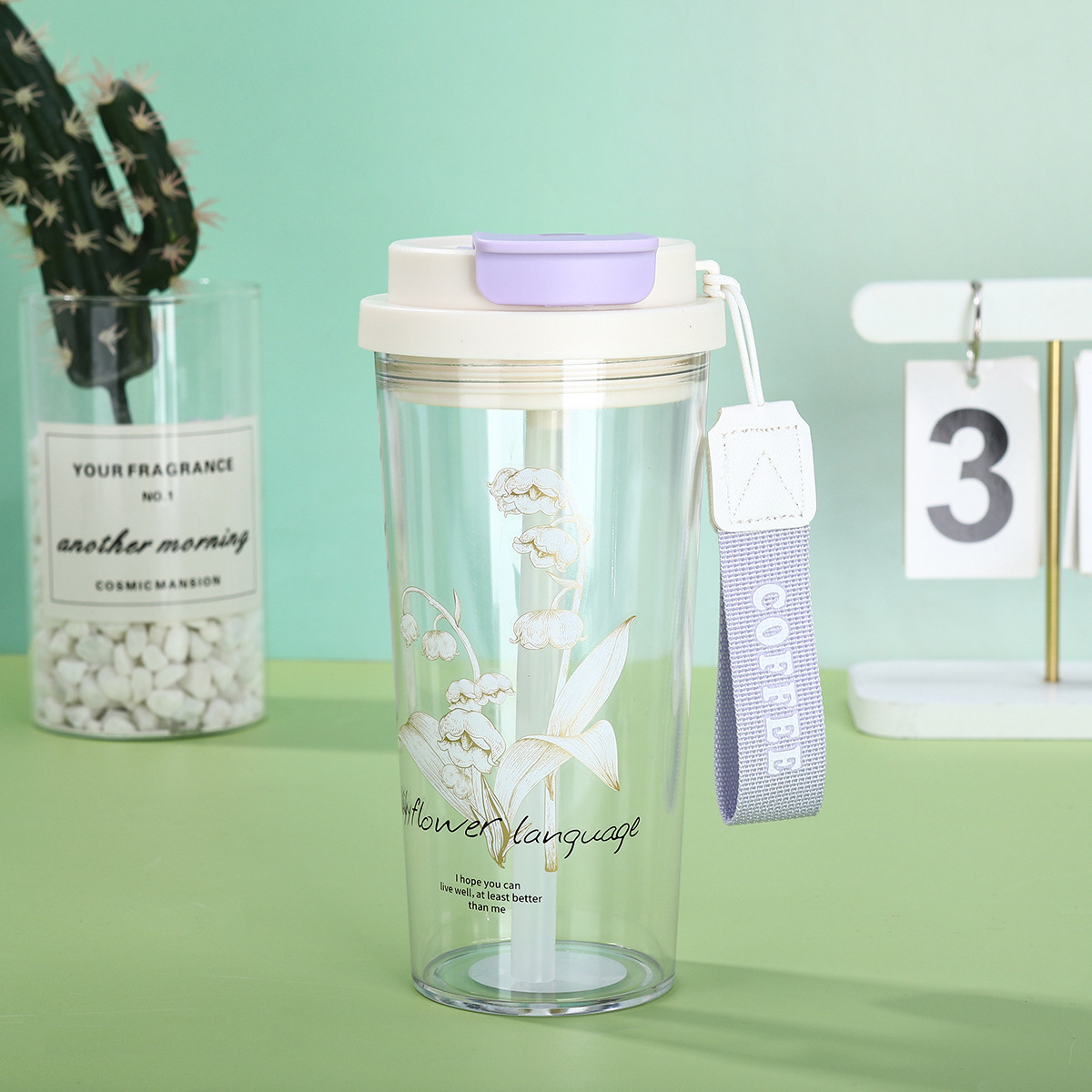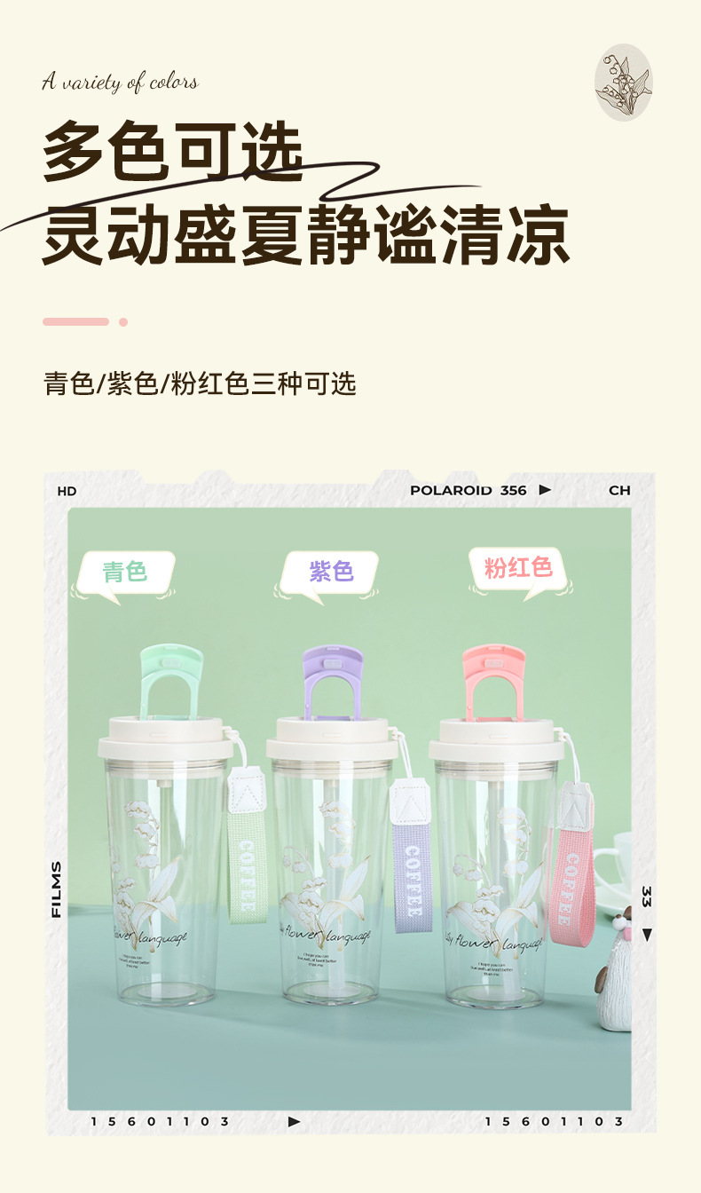 新款铃兰花塑料咖啡杯耐高温简约带提绳双饮杯户外便携随行吸管杯