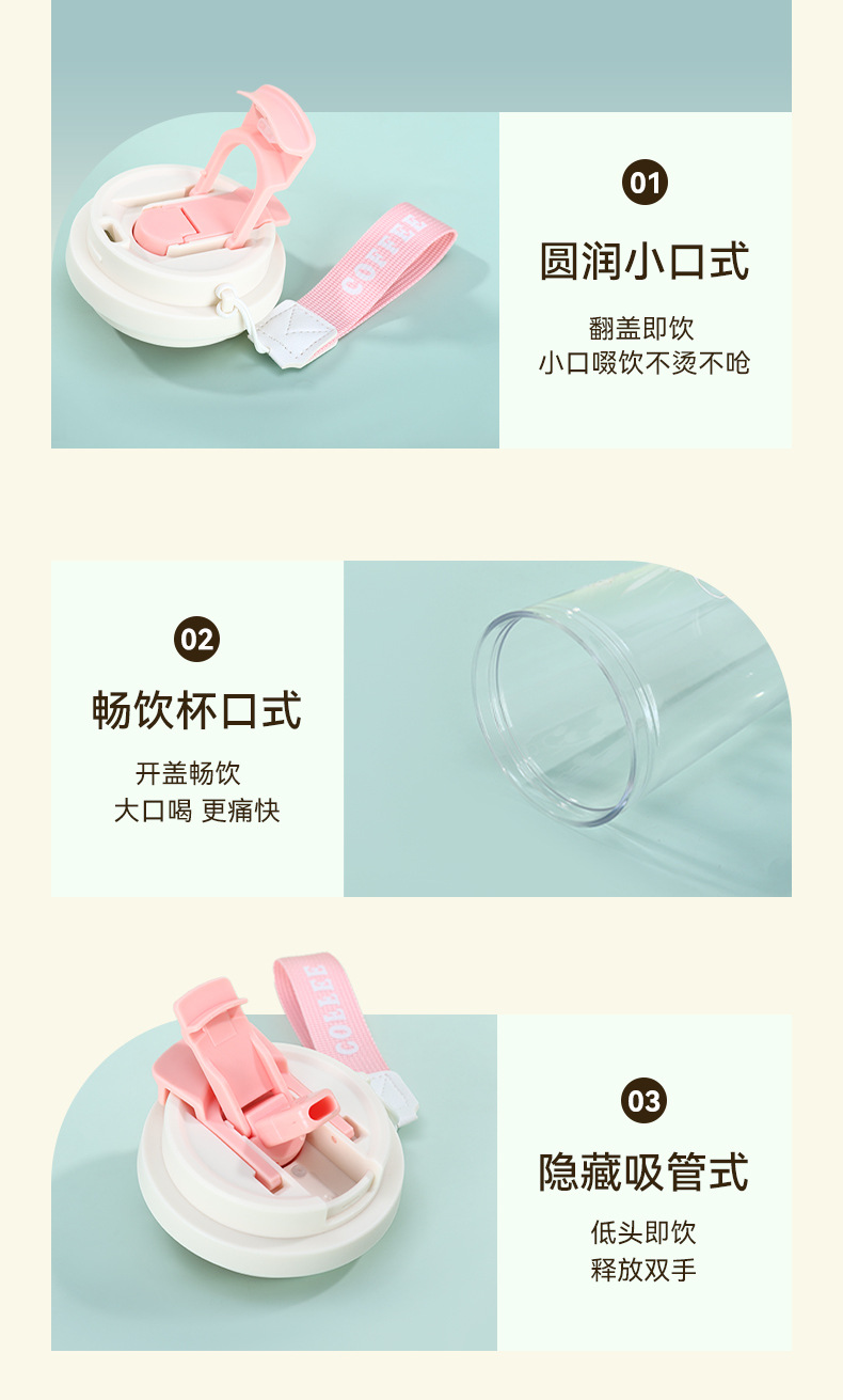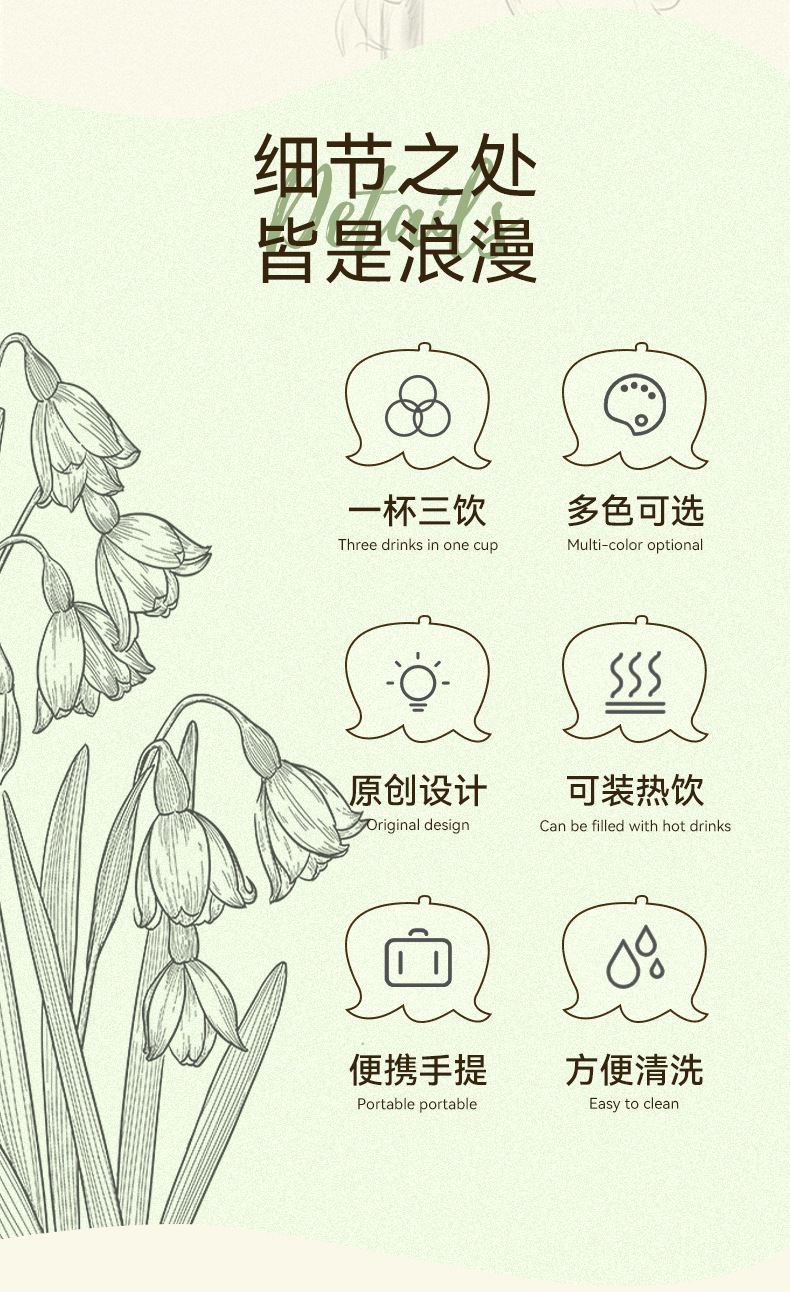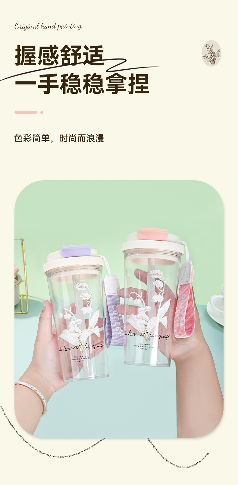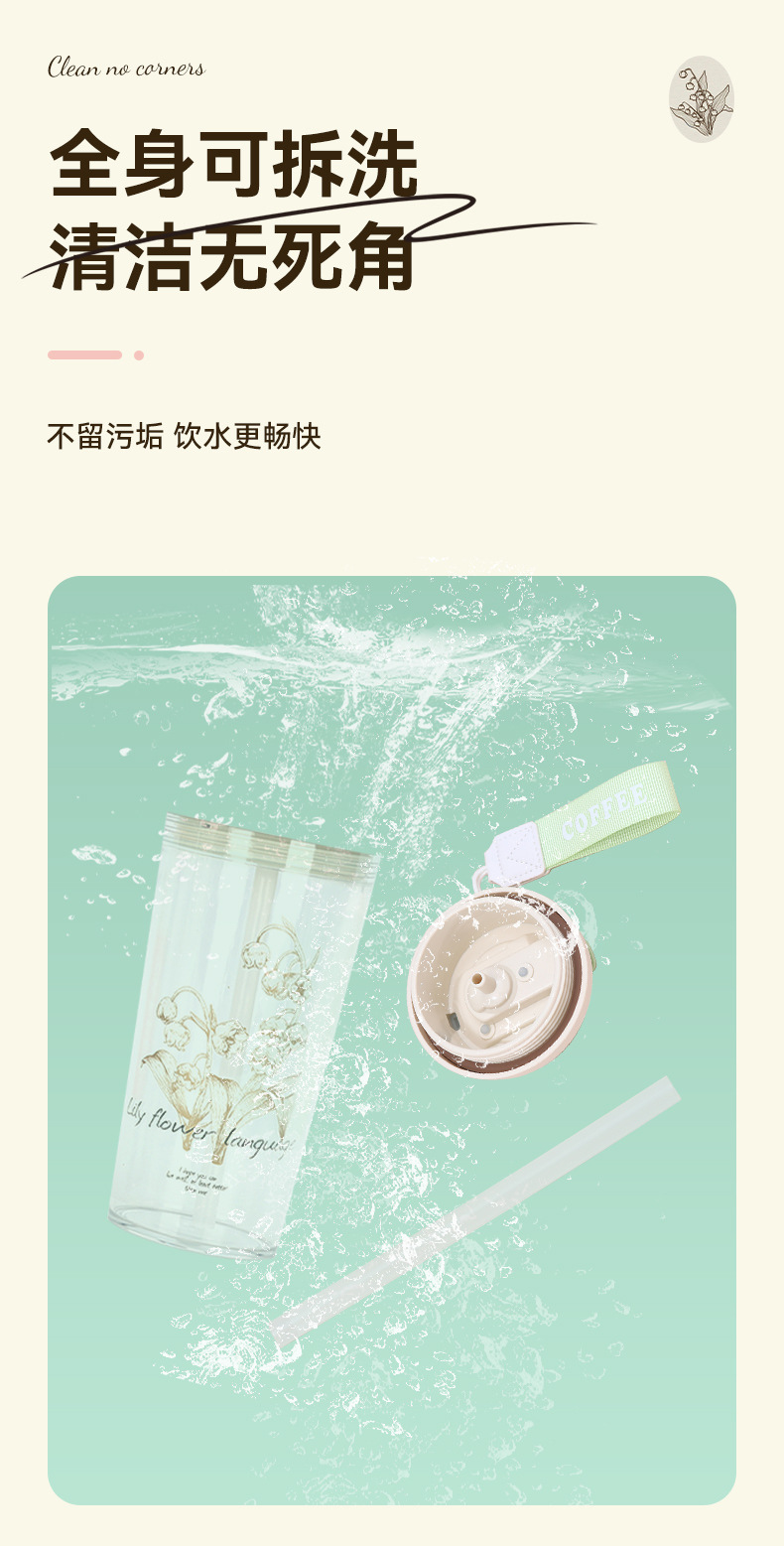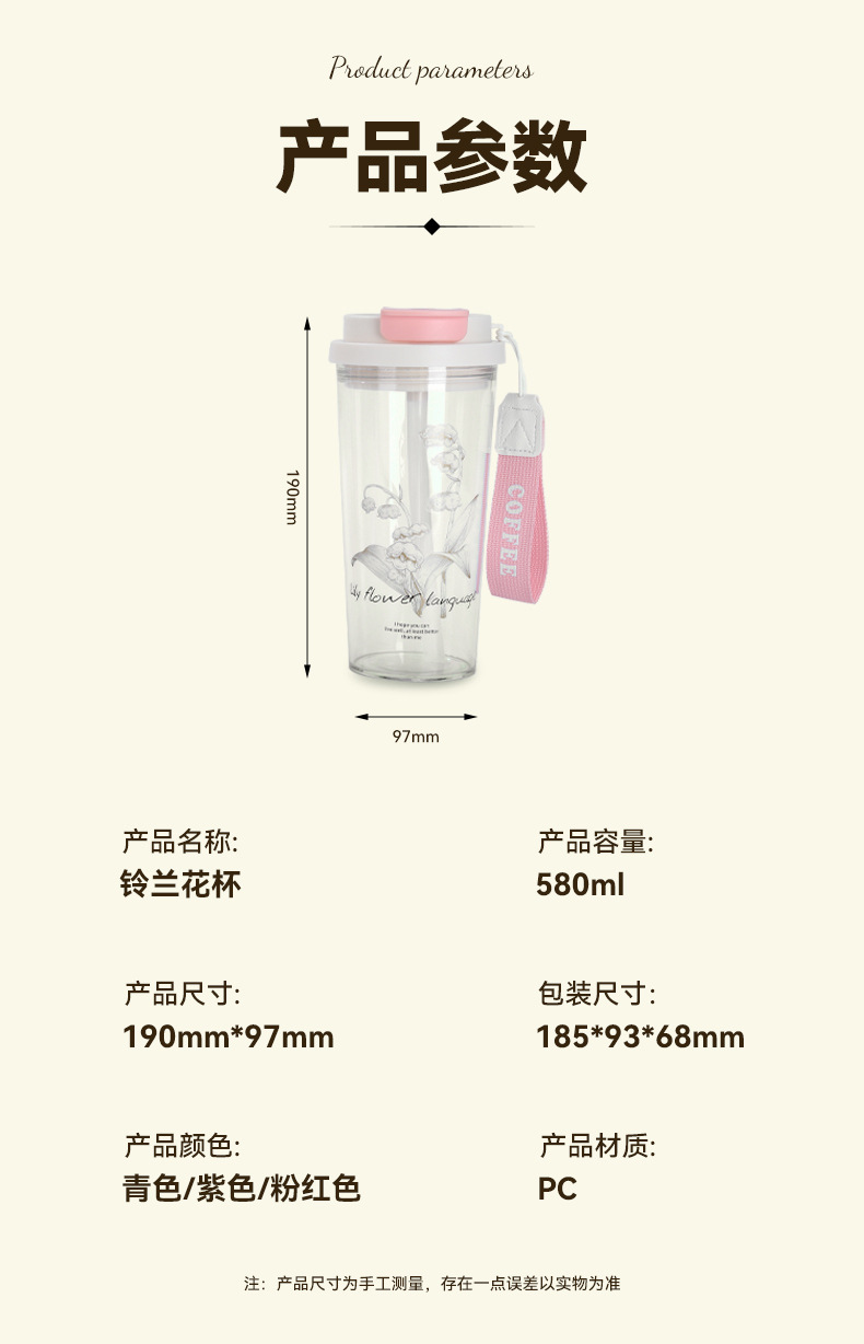 新款铃兰花塑料咖啡杯耐高温简约带提绳双饮杯户外便携随行吸管杯 投诉