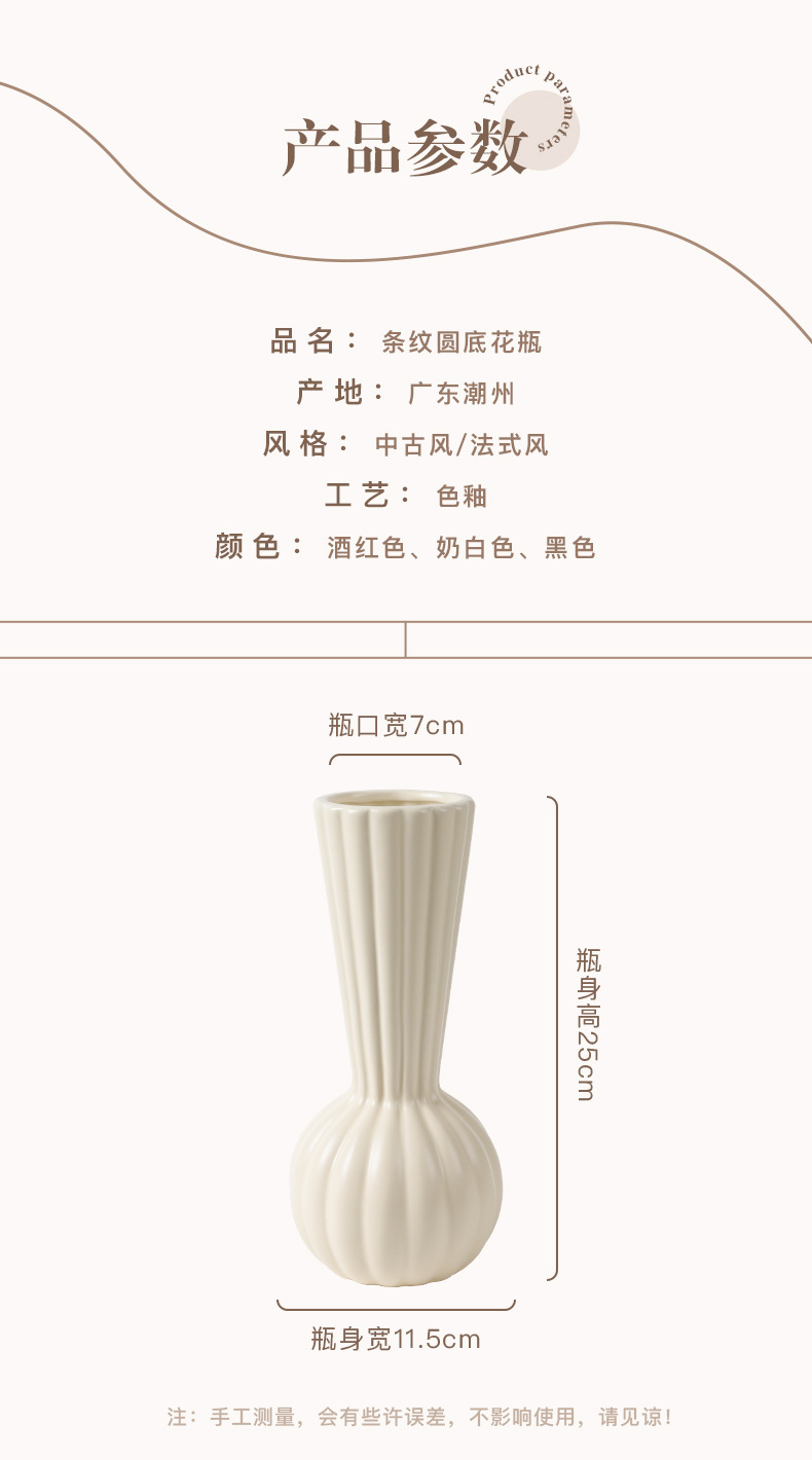 货号: 条纹圆底高颈瓶 材质: 玻璃 加工定制: 是 表面工艺: 上釉 包装: 普通包装 风格: 中古风 工艺: 色釉 是否专利货源: 否 尺寸: 亮光黑色,亮光酒红,哑光奶白 重量: 0.01 kg/件