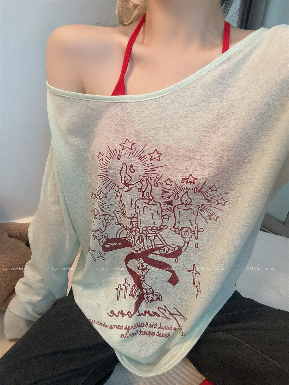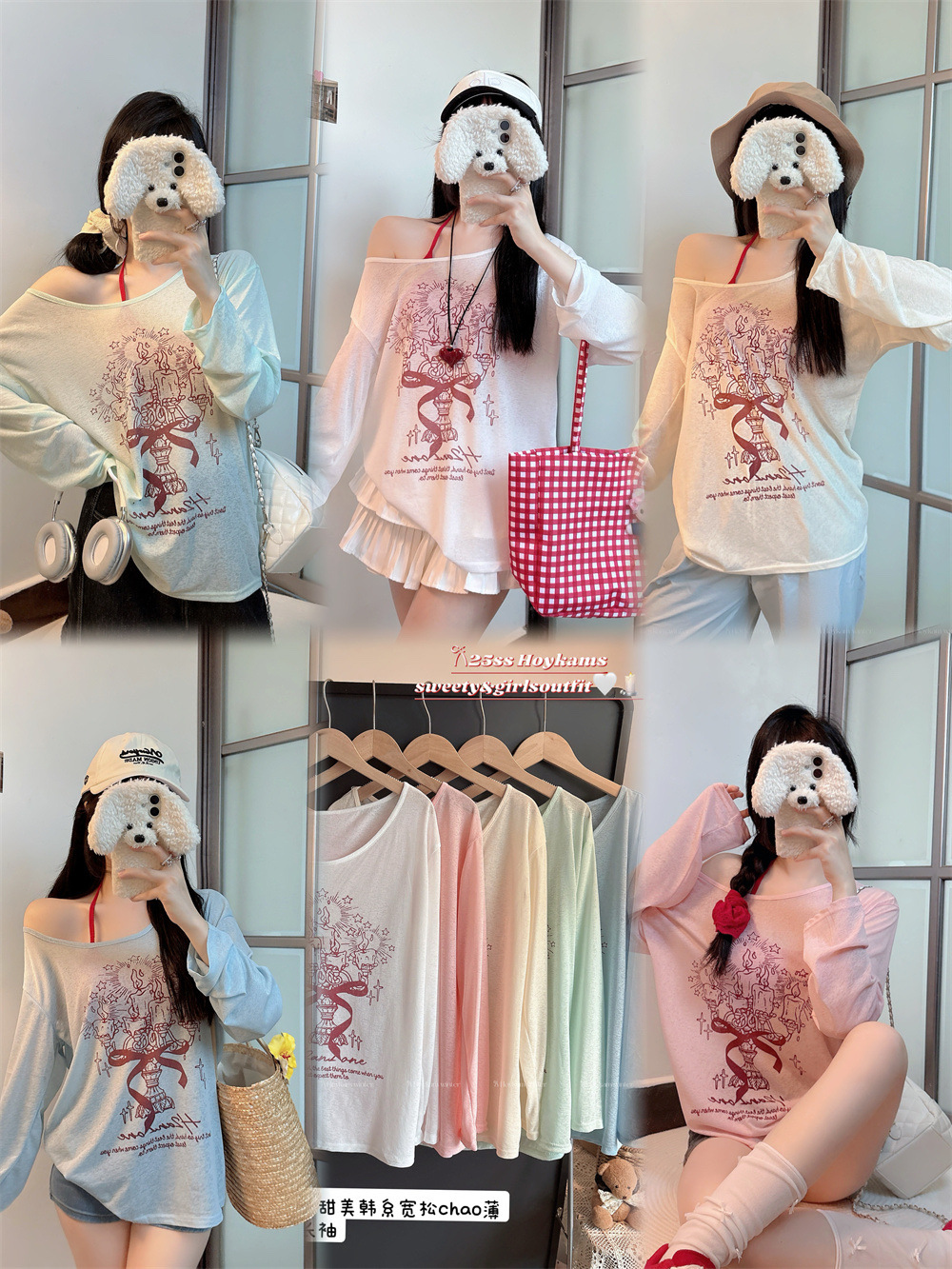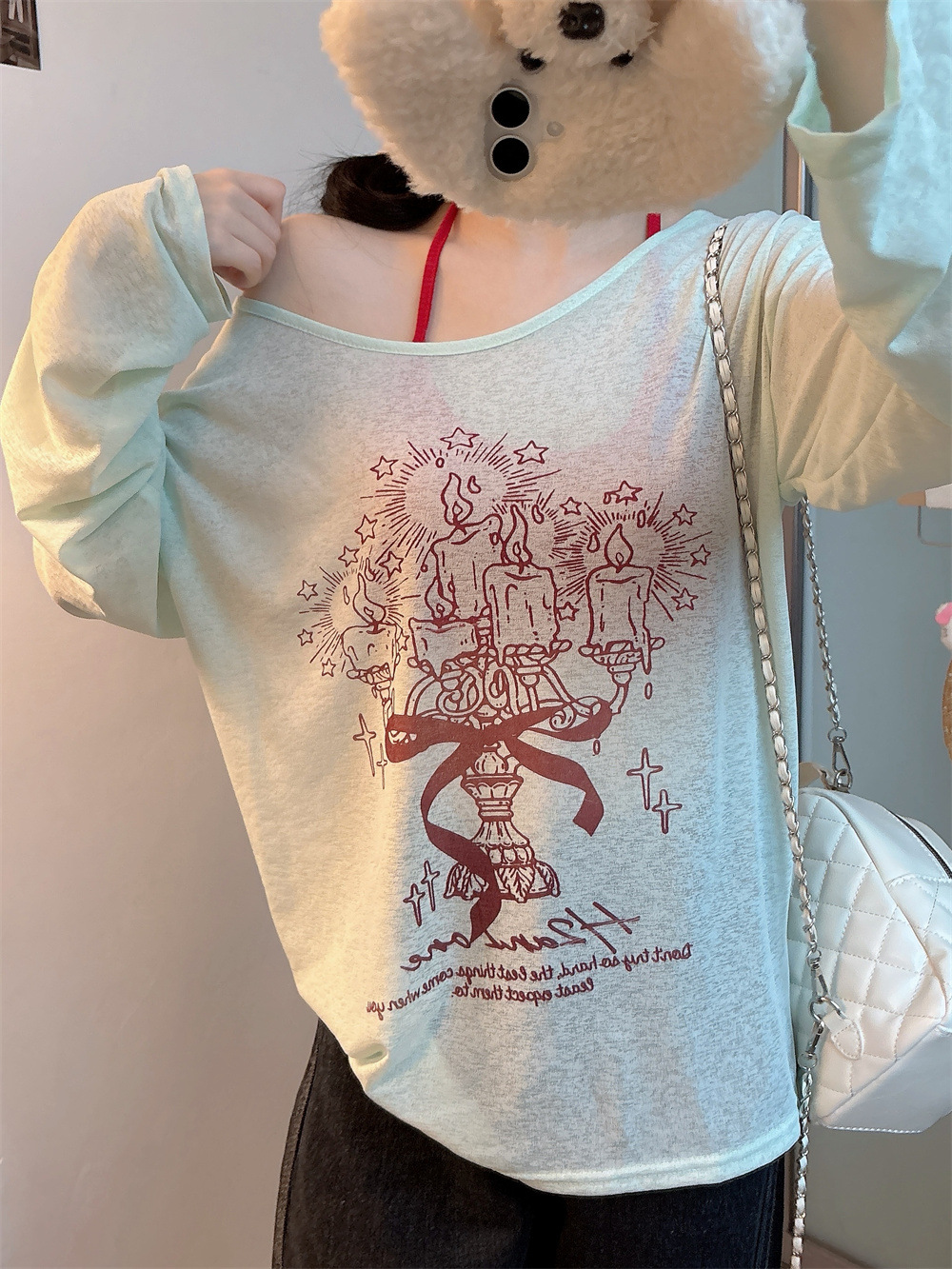 8212#涂鸦印花斜肩长袖T恤夏季薄款白色防晒罩衫宽松慵懒休闲上衣 English | 投诉