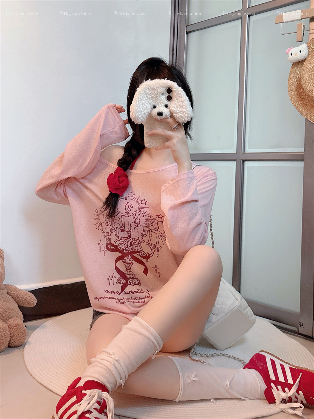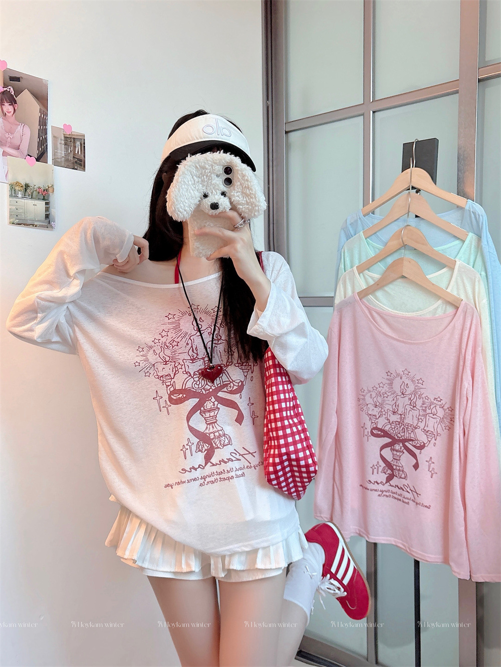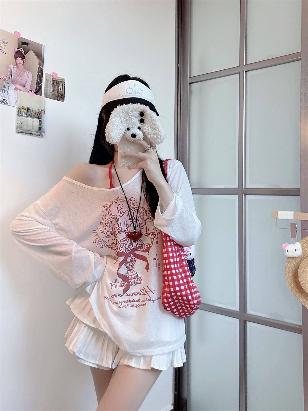 8212#涂鸦印花斜肩长袖T恤夏季薄款白色防晒罩衫宽松慵懒休闲上衣 English | 投诉
