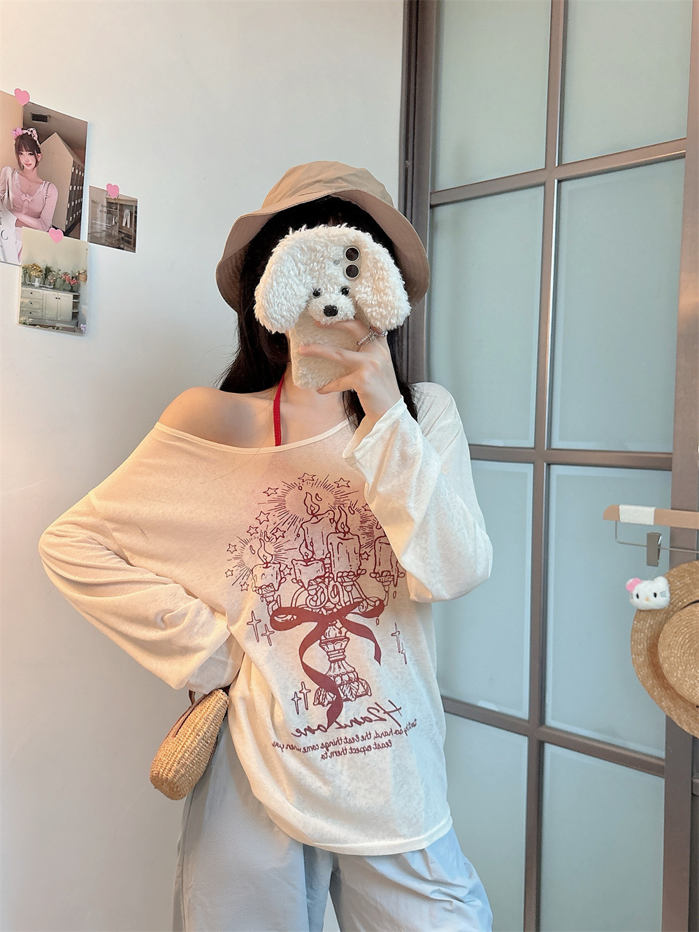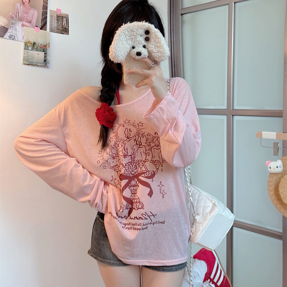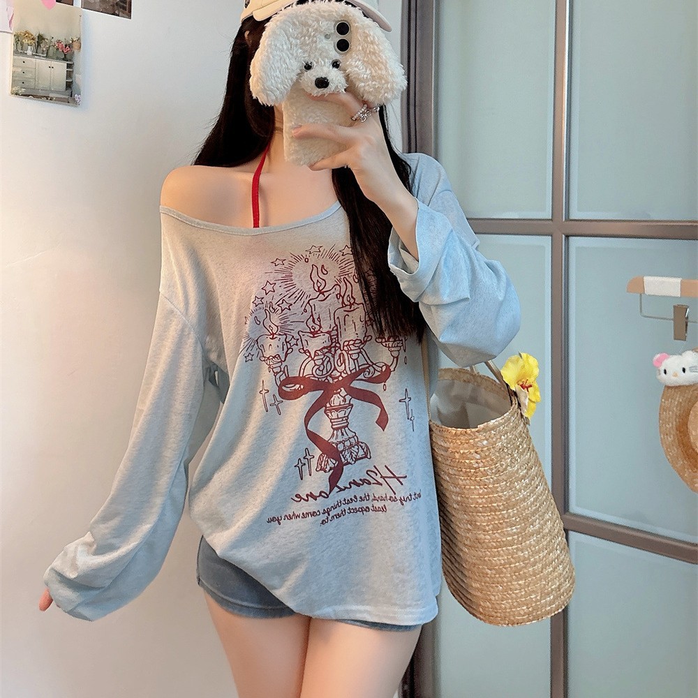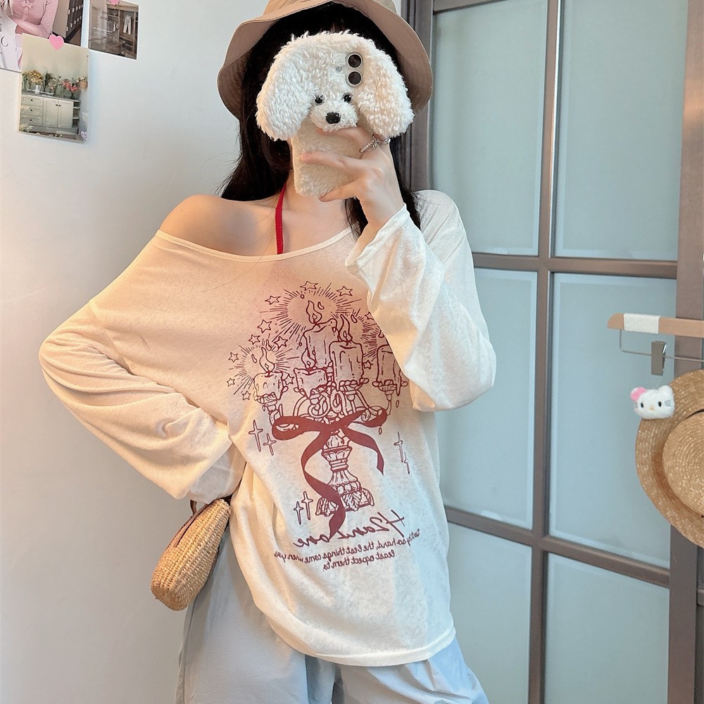 8212#涂鸦印花斜肩长袖T恤夏季薄款白色防晒罩衫宽松慵懒休闲上衣