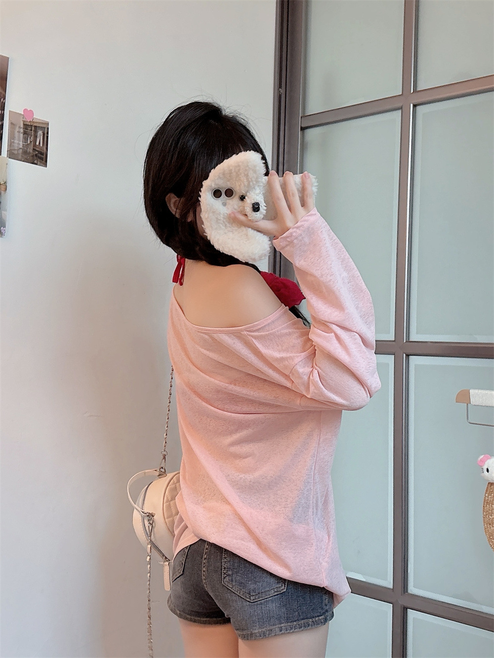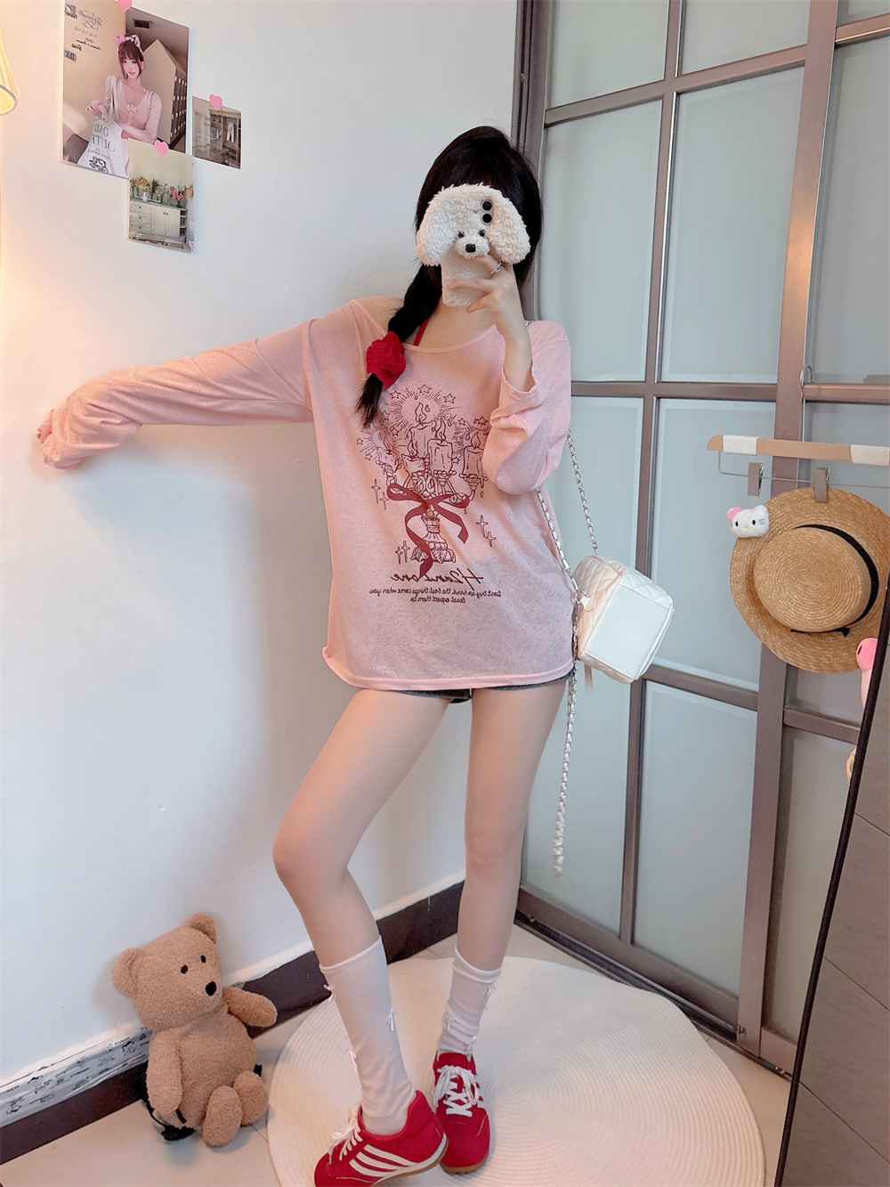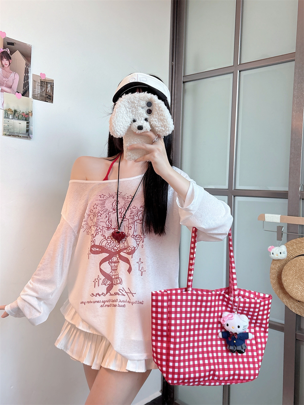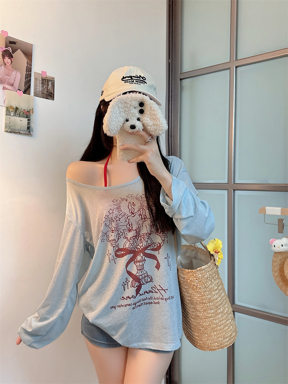 8212#涂鸦印花斜肩长袖T恤夏季薄款白色防晒罩衫宽松慵懒休闲上衣