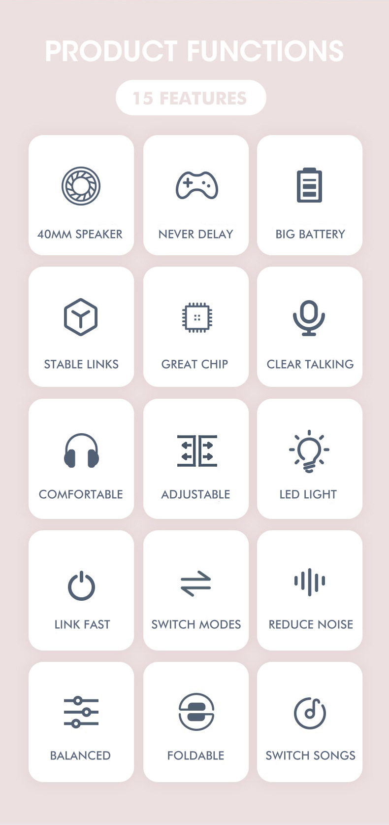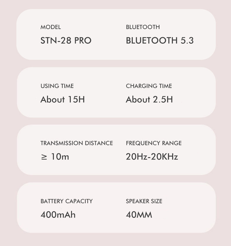 品牌: 中性 传输范围: 10米 功能: 支持音乐 蓝牙协议: 5.3 使用方式: 头戴式 是否单双耳: 双边立体声 颜色: 粉红色,绿色,蓝色,紫色 主要下游平台: wish,速卖通,独立站,LAZADA, 主要销售地区: 欧洲,南美,东南亚,北美,东北亚,中东 有可授权的自有品牌: 是