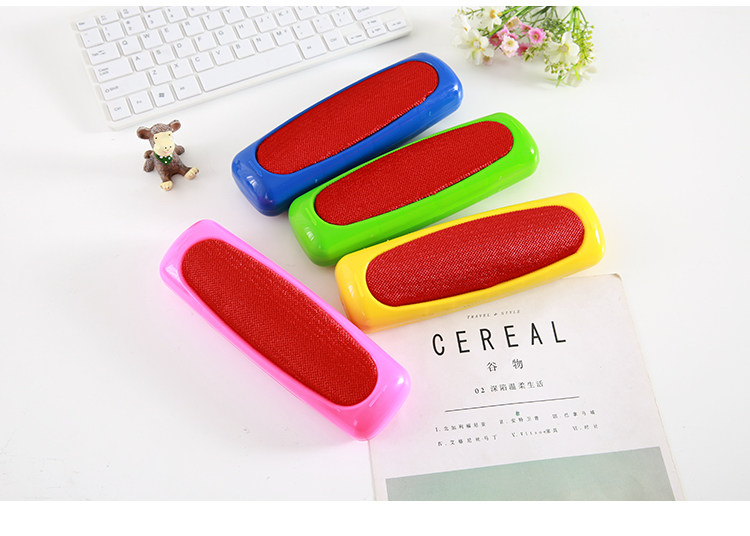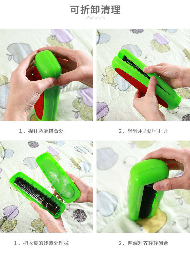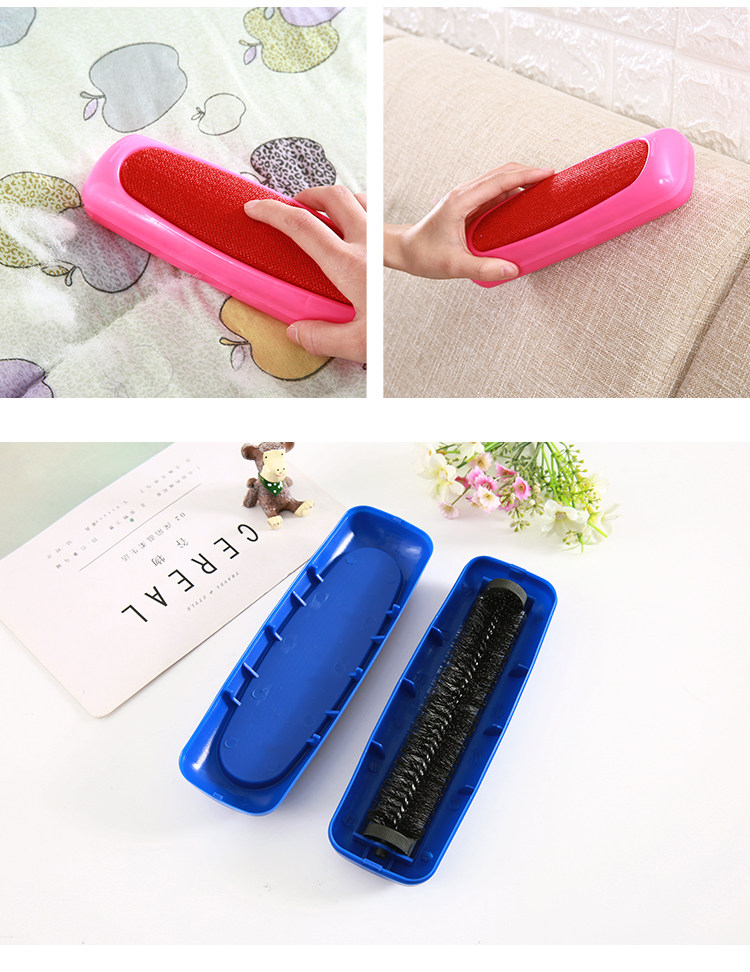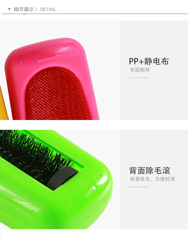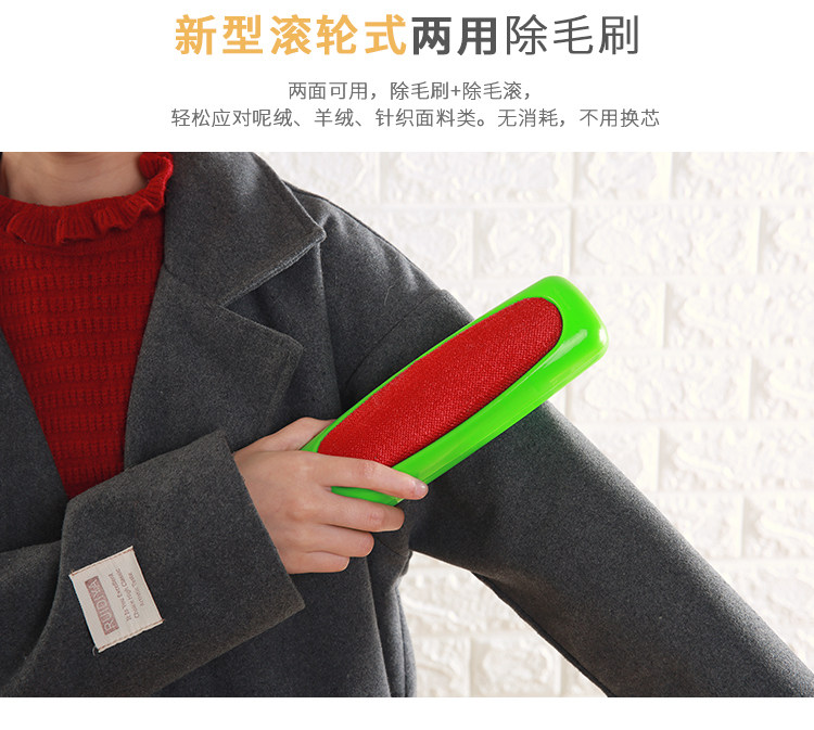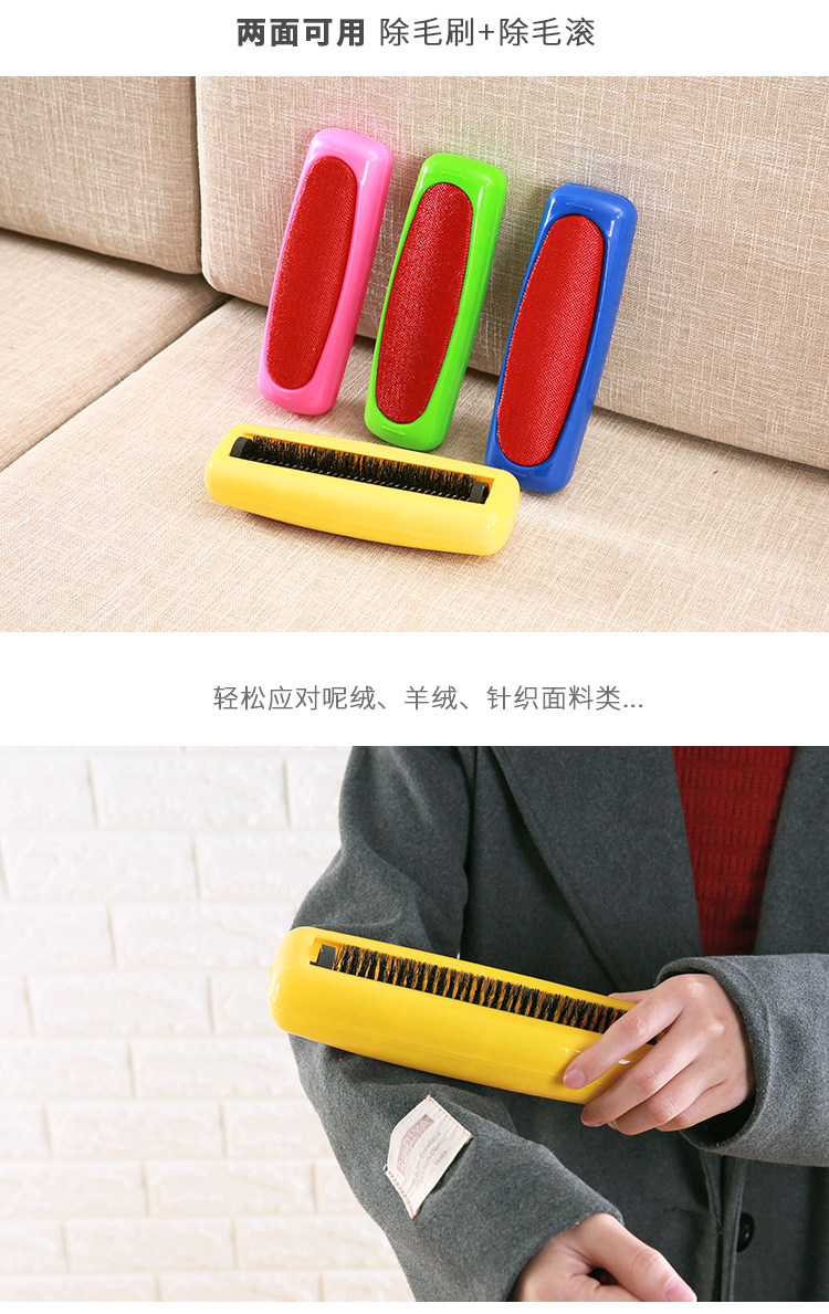 此款产品一面为抗磨静电刷布,可吸附各种衣服服装面料中的毛绒毛屑,使用过洁净如新,非常方便好用!另一面为滚轮猪须鬃毛刷,采用现代工艺制作而成,可吸附各种米粒物大小的杂质,如瓜子果皮,香烟烟头,饼干,以及小孩掉在床上沙发上坐垫上的各种杂质杂物,均可吸收!是居家自用的一个非常好的帮手,也是生活中必不可少的日用品!