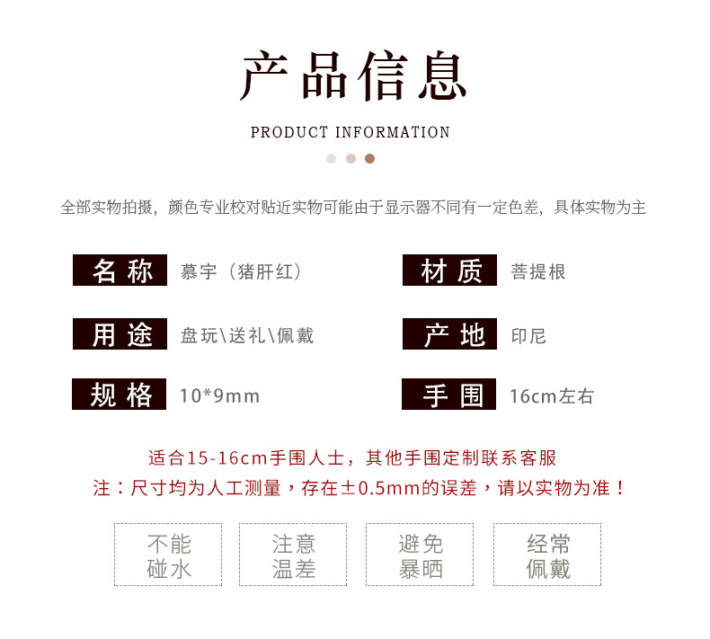 有可授权的自有品牌: 是 颜色: 慕宇【溏心老料单圈】 是否专利货源: 否 材质: 菩提根 尺寸: 10*9mm 风格: 中式 工艺: 手工,打磨 货号: 菩提单圈 专利号: 否 是否属于礼品: 是,个人礼品 是否跨境出口专供货源: 是 上市年份/季节: 2024年春季 重量: 0.1 kg/件