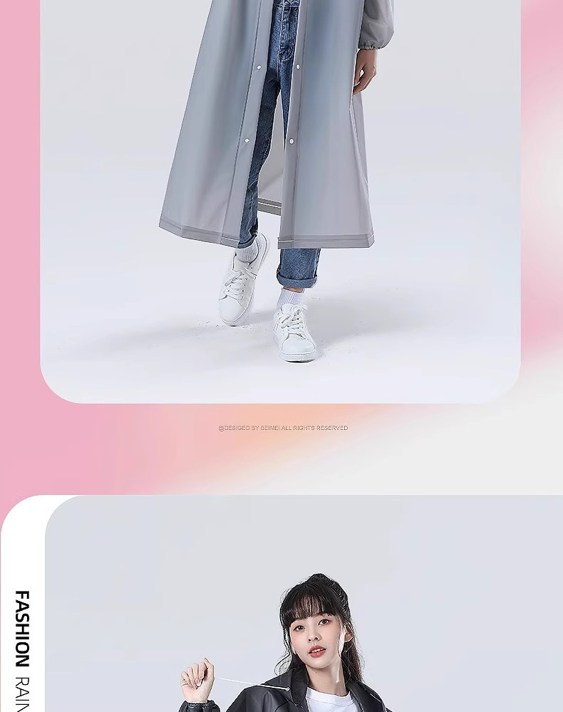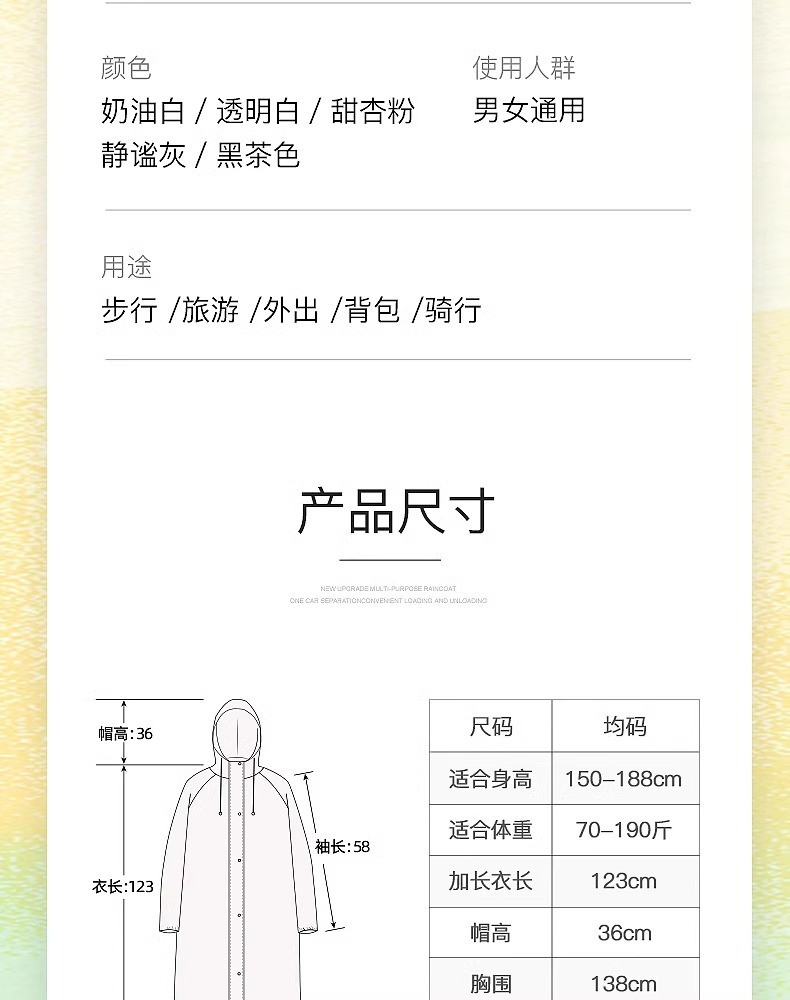 款式: 一次性雨衣 货号: A10024 是否进口: 否 品牌: 杭格 雨具用途: 徒步雨披 是否一次性: 否 雨衣厚薄: 厚款 布料厚度: 105克左右 雨衣布料: EVA 防水胶层: PE胶 适用对象: 成人 适用人数: 1人 包装方式: 袋装 是否专利货源: 否 商品条形码: 其他 加印LOGO: 不可以 加工定制: 否 毛重: 140左右 包装体积: 其他 产地(国内): 浙江省 重量: 0.1 kg/个