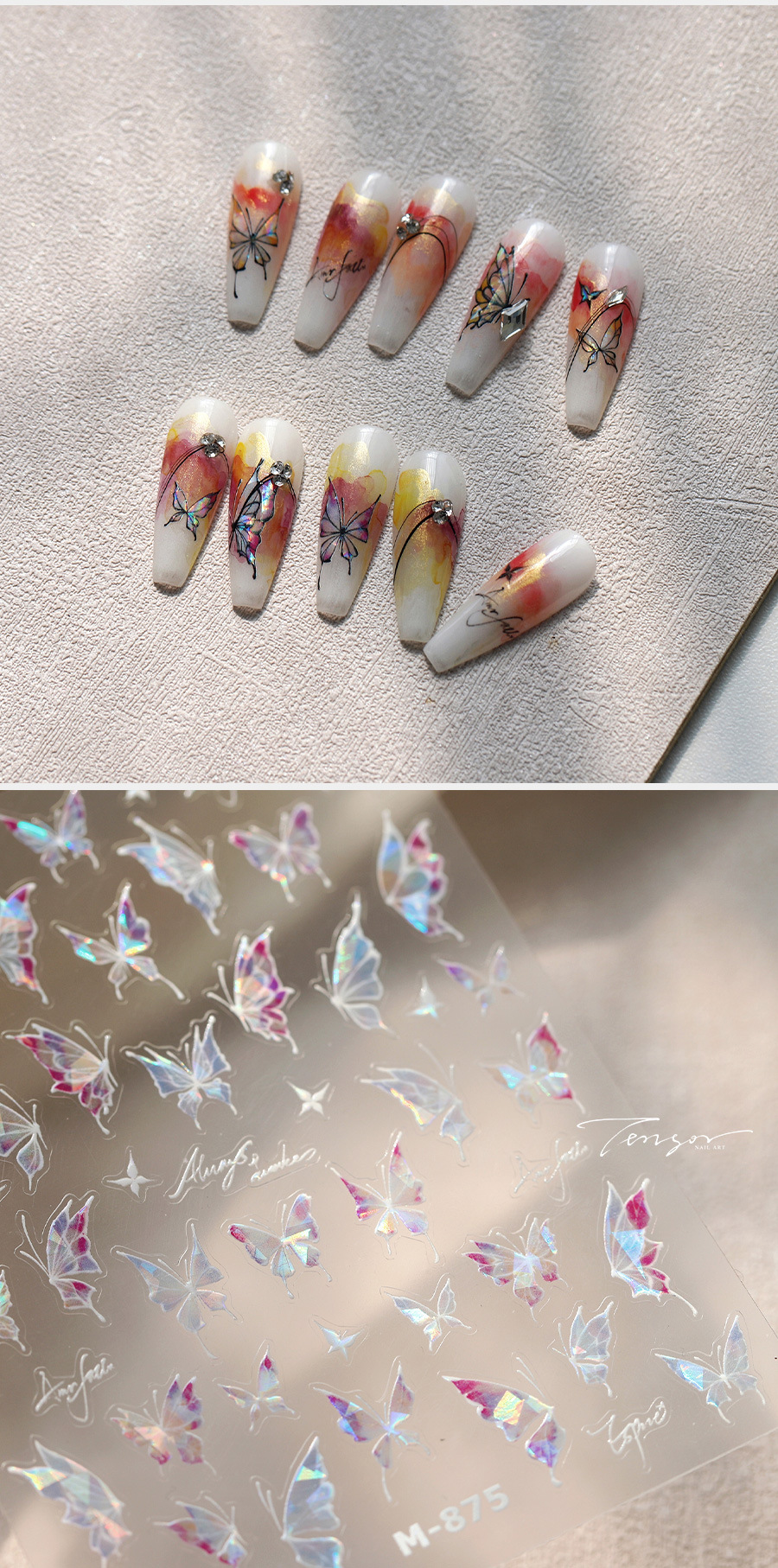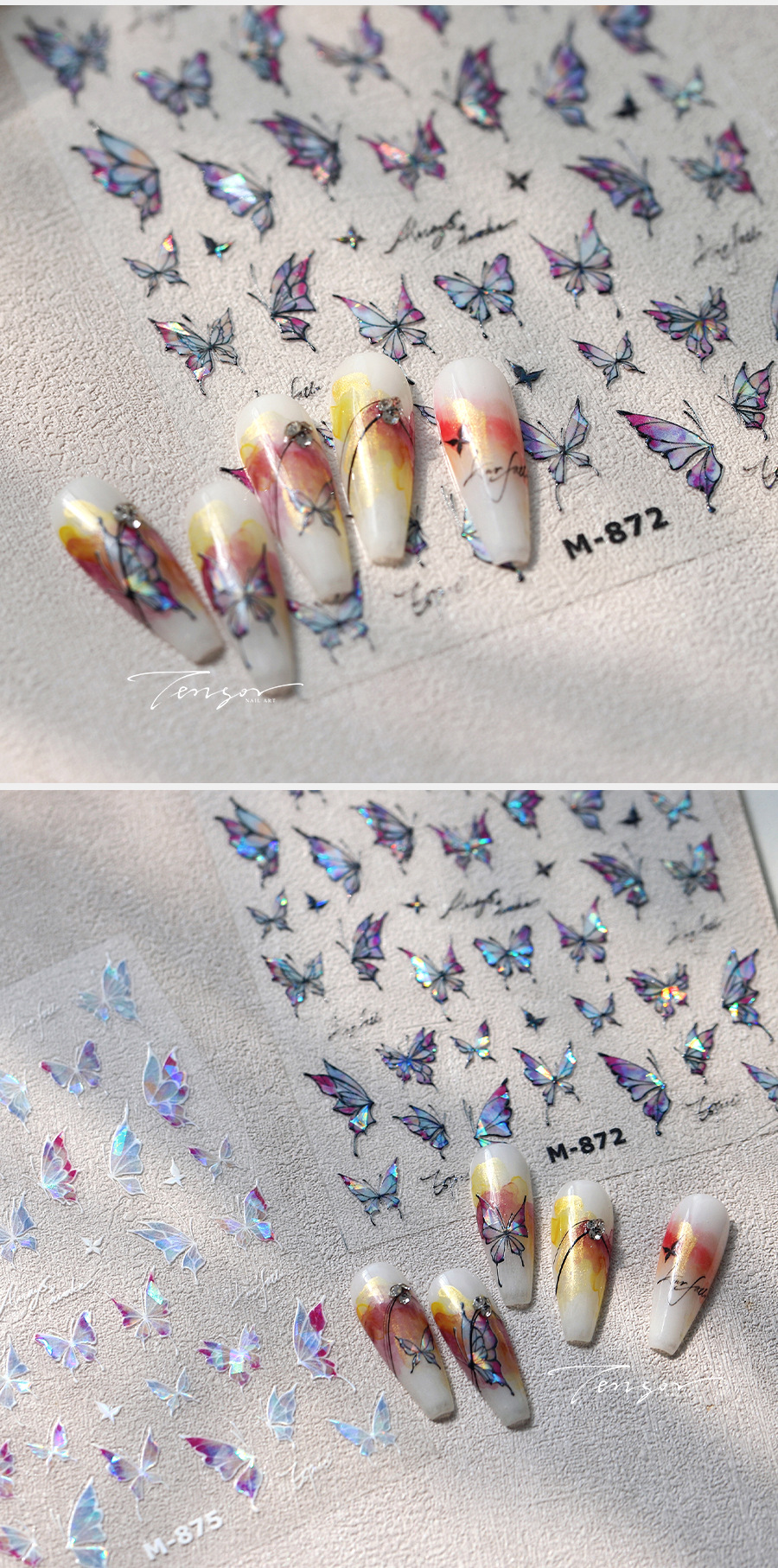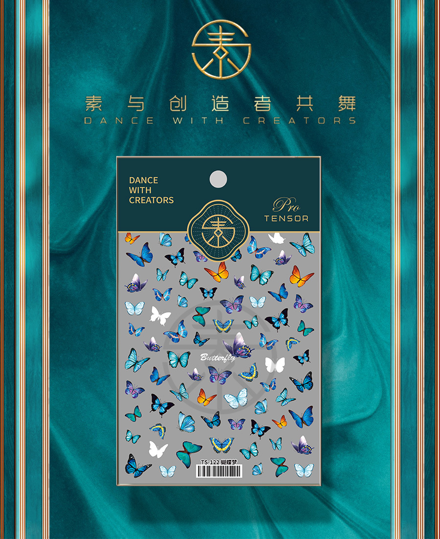 TENSOR新工艺烫金爆款淡雅蝴蝶M-871背胶冰透极光玻璃碎美甲贴纸 English | 投诉