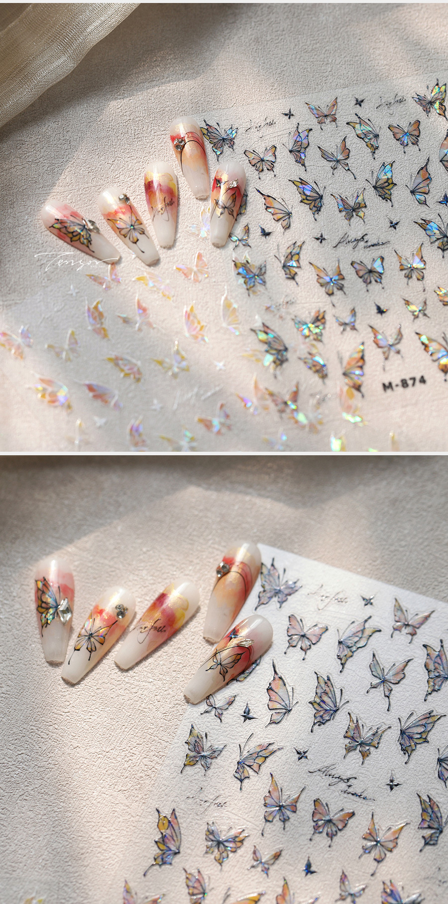 TENSOR新工艺烫金爆款淡雅蝴蝶M-871背胶冰透极光玻璃碎美甲贴纸