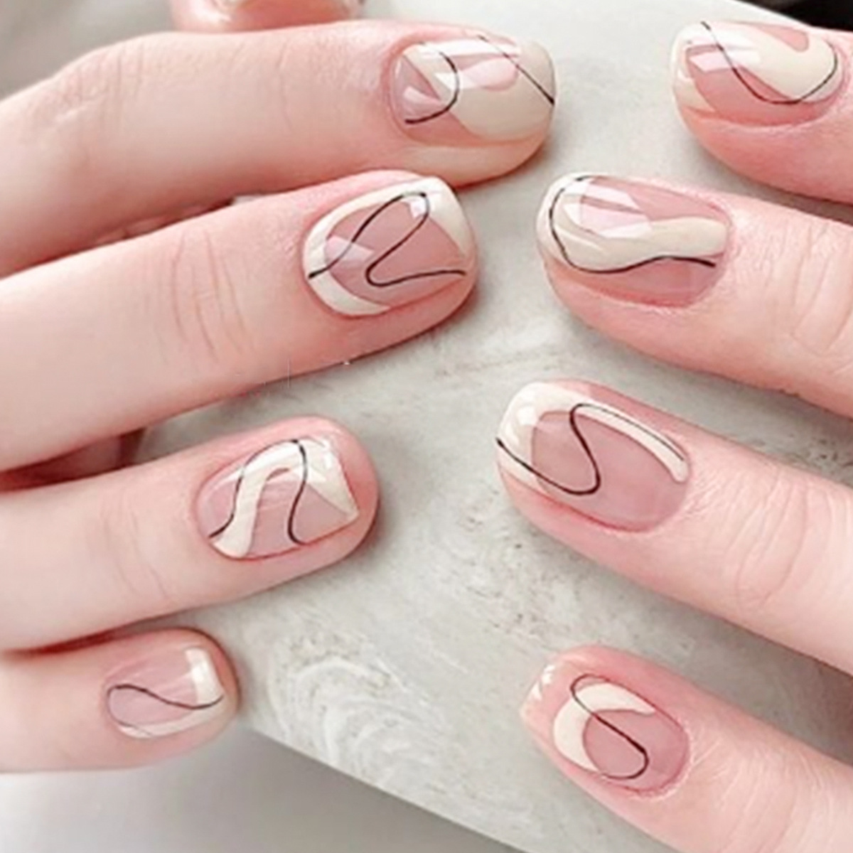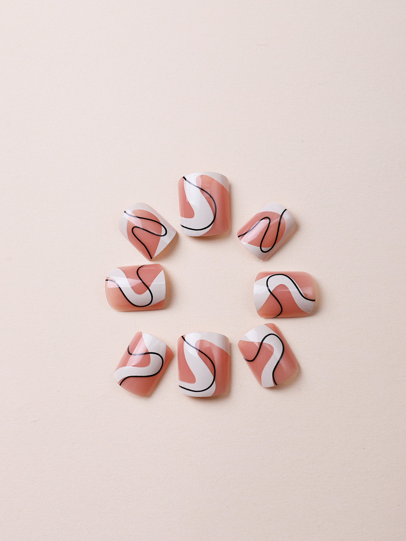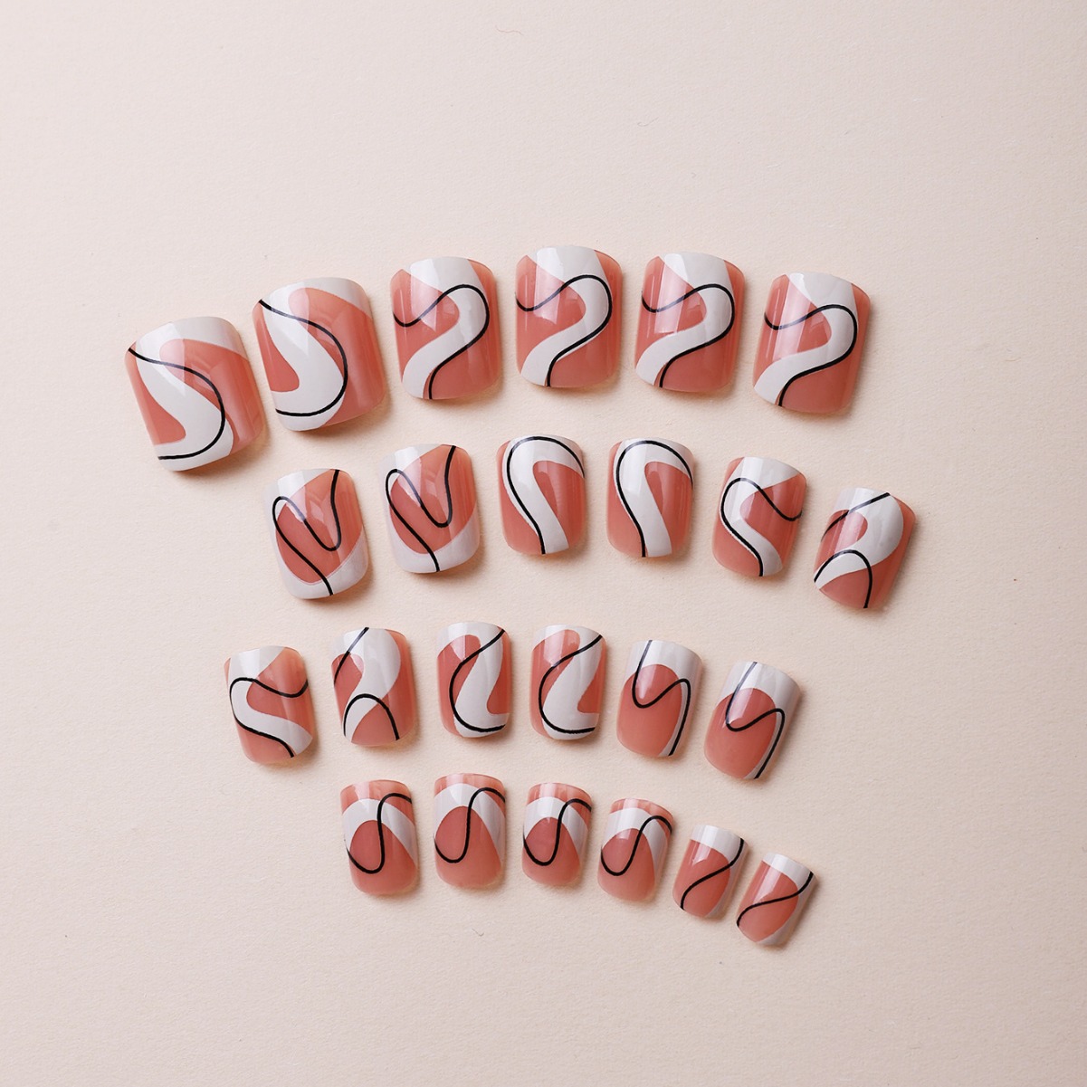 源头工厂直销美拉德穿戴甲杏仁甲黑白线条波浪纹美甲跨境甲片成品