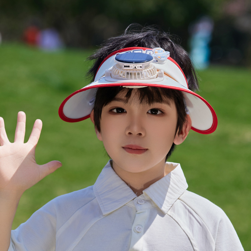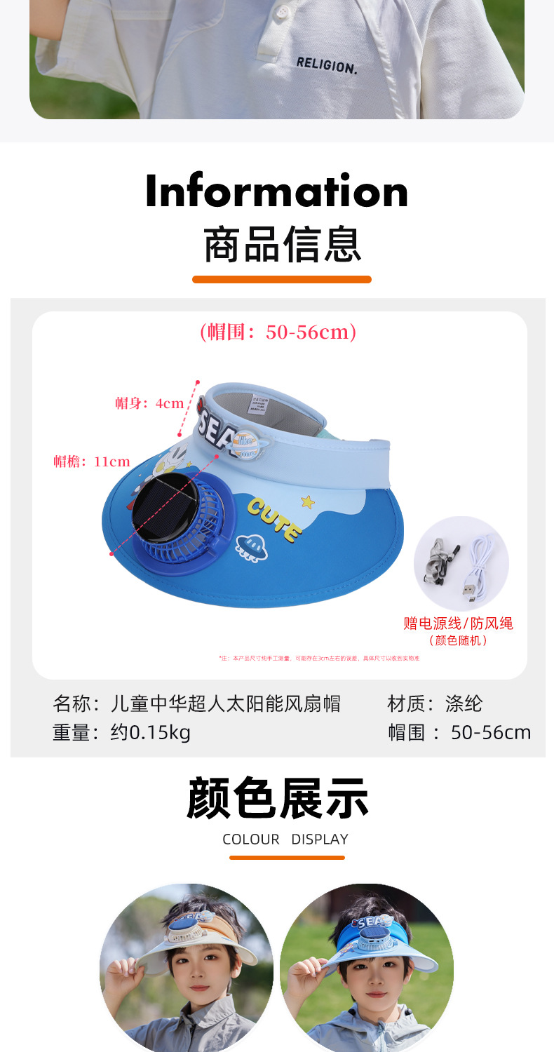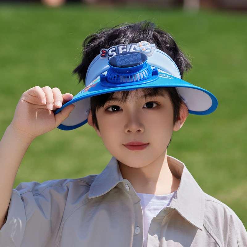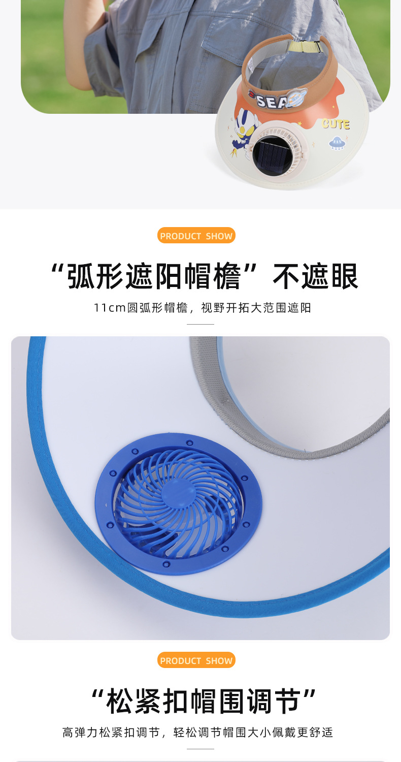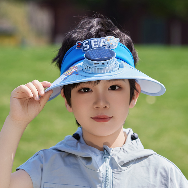 夏季儿童帽子大檐太阳能风扇帽户外出游遮阳防晒帽卡通可爱空顶帽 English | 投诉