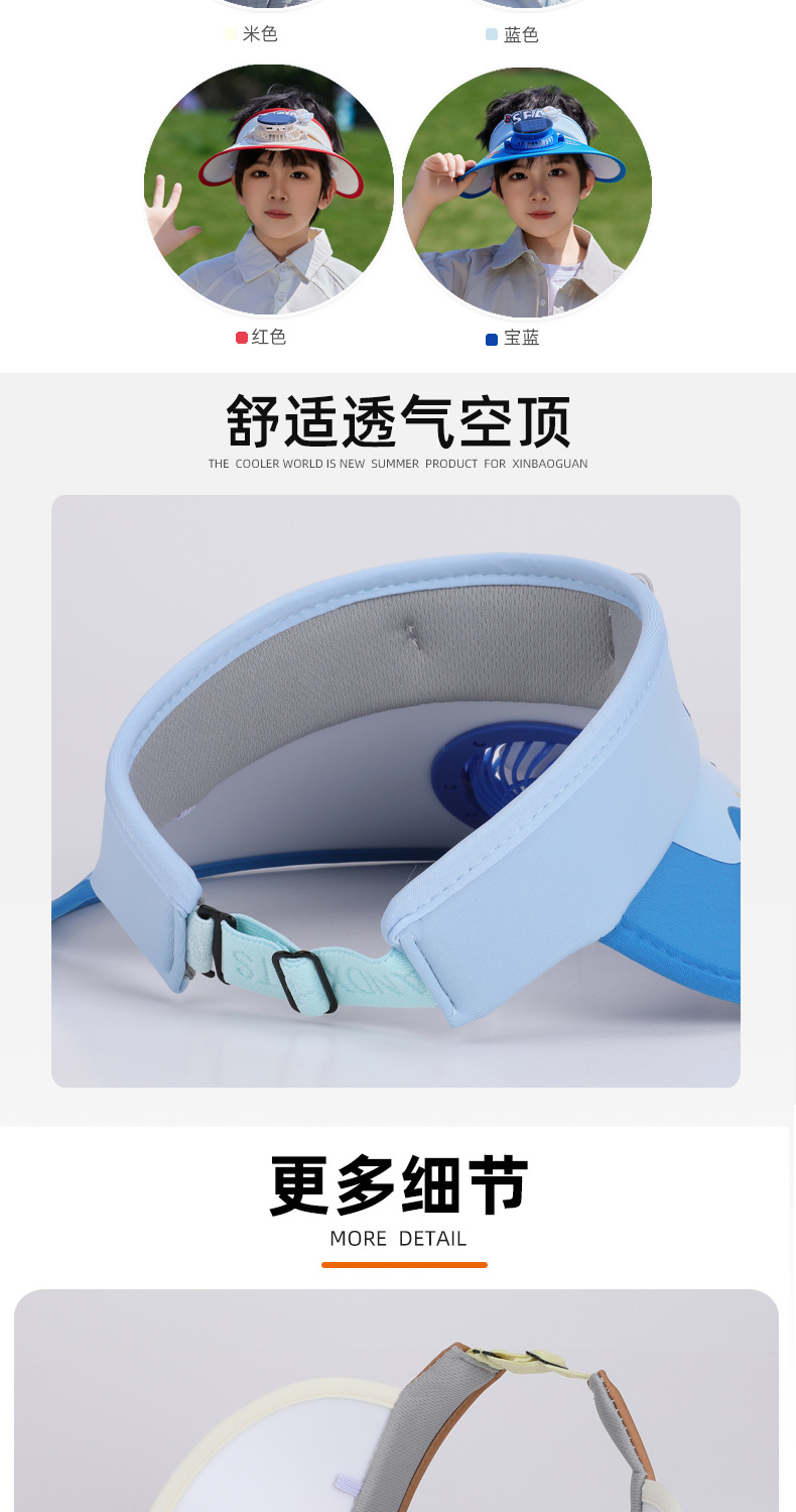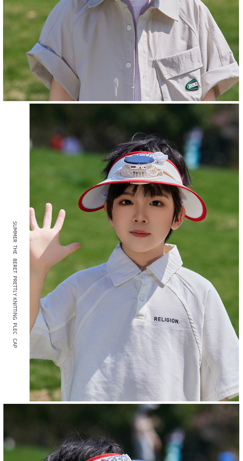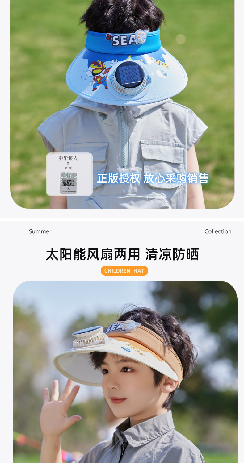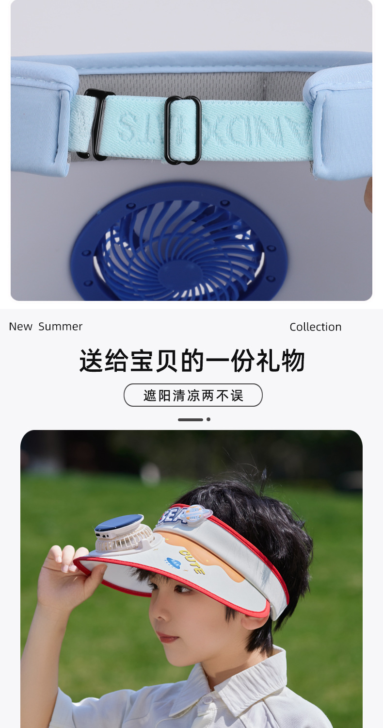 夏季儿童帽子大檐太阳能风扇帽户外出游遮阳防晒帽卡通可爱空顶帽 English | 投诉