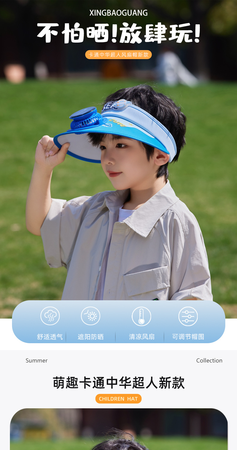 产品类别: 空顶帽 产地: 义乌 适合季节: 夏季 品牌: 馨宝冠 货号: XBG-1201 帽檐款式: 大檐 帽顶款式: 无顶 功能: 防晒,透气,带风扇,遮阳 是否跨境出口专供货源: 是 上市年份/季节: 2025夏季 主面料成分含量: 71%(含)-80%(含) 适用年龄: 4-6岁,8-10岁 面料名称: 涤纶 适合头围: 50-56 主面料成分: 涤纶(聚酯纤维) 款式: 儿童中华超人太阳能风扇帽 风格分类: 清新甜美 处理工艺: 缎档 属性: 大帽檐空顶帽 流行元素分类: 十二星座,字母/数字/文字,形状/图案 重量: 0.1 kg/顶