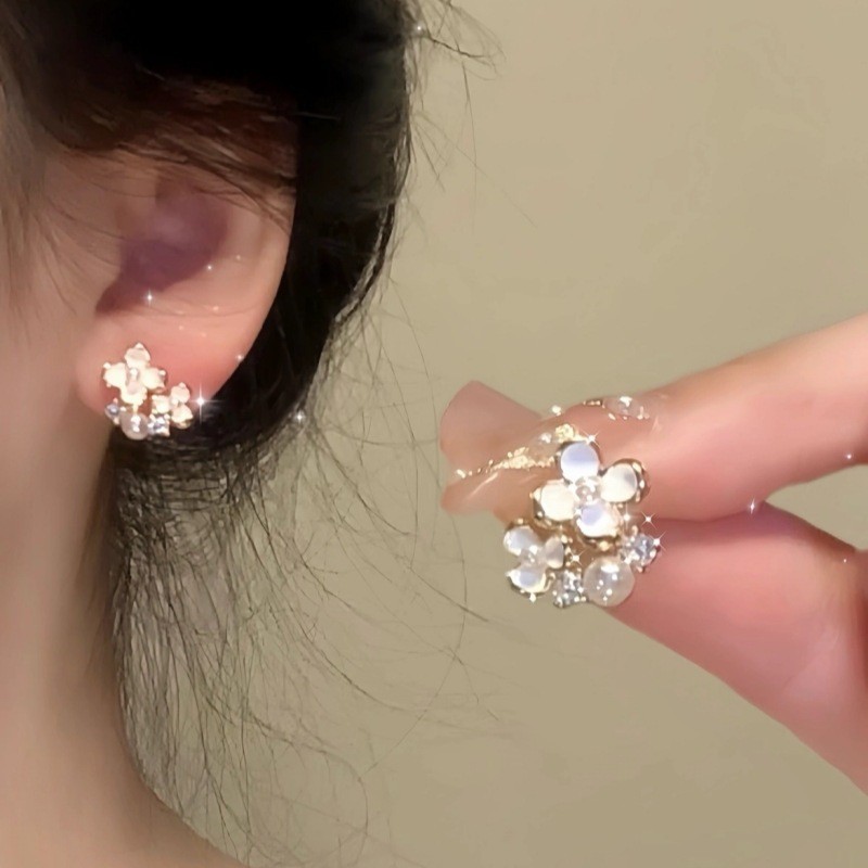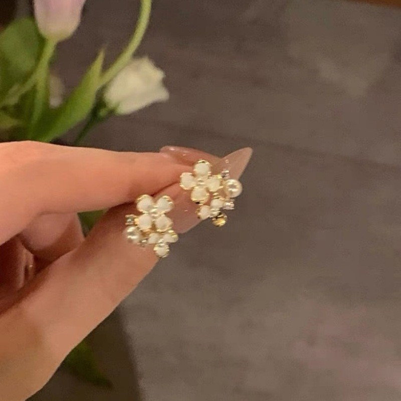氛围感甜美清新白色小花珍珠耳钉小众设计轻奢气质高级感百搭耳饰