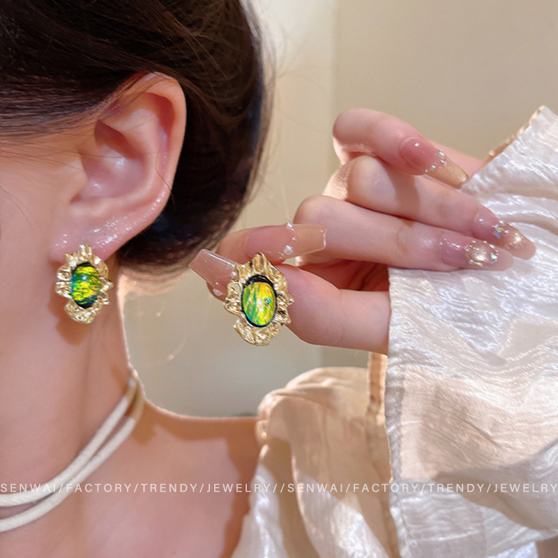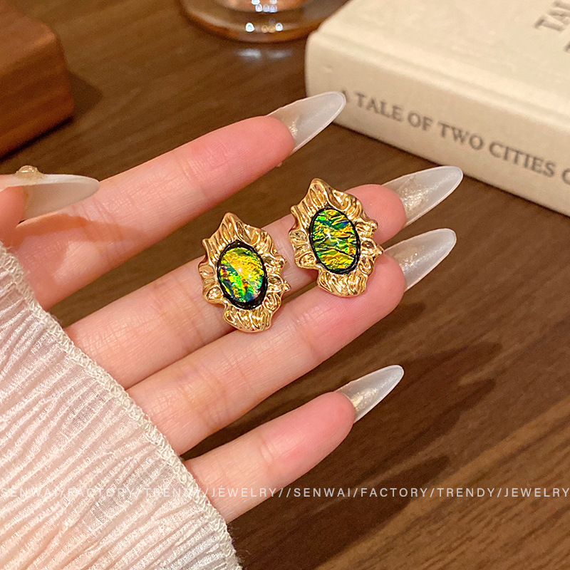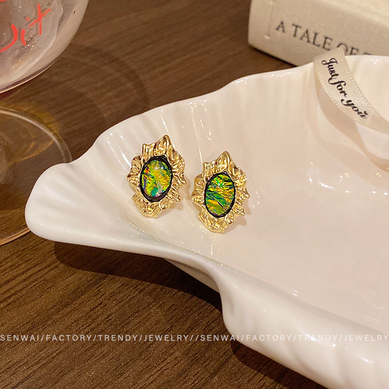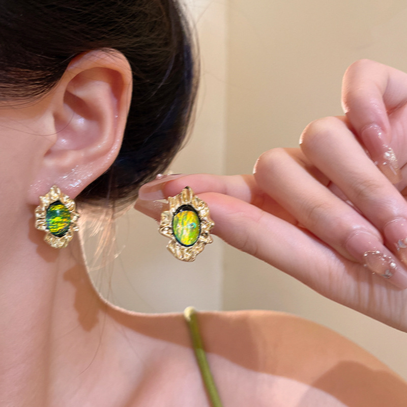 欧美复古新款褶皱金属耳钉女中古风不规则绿色耳环轻奢气质耳饰品