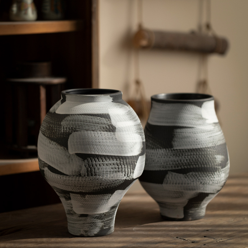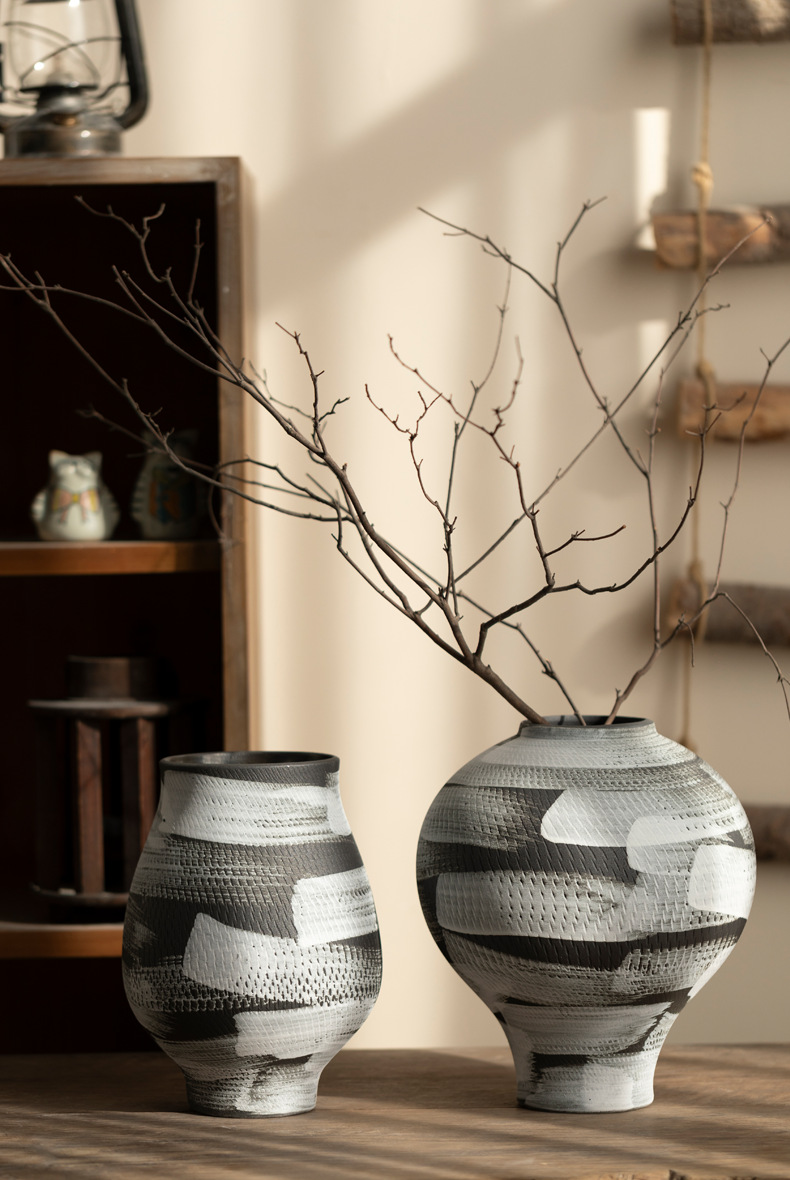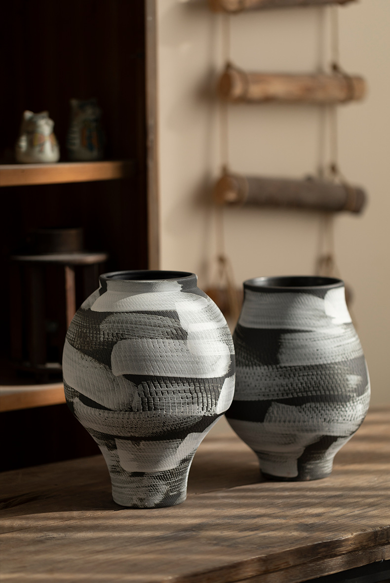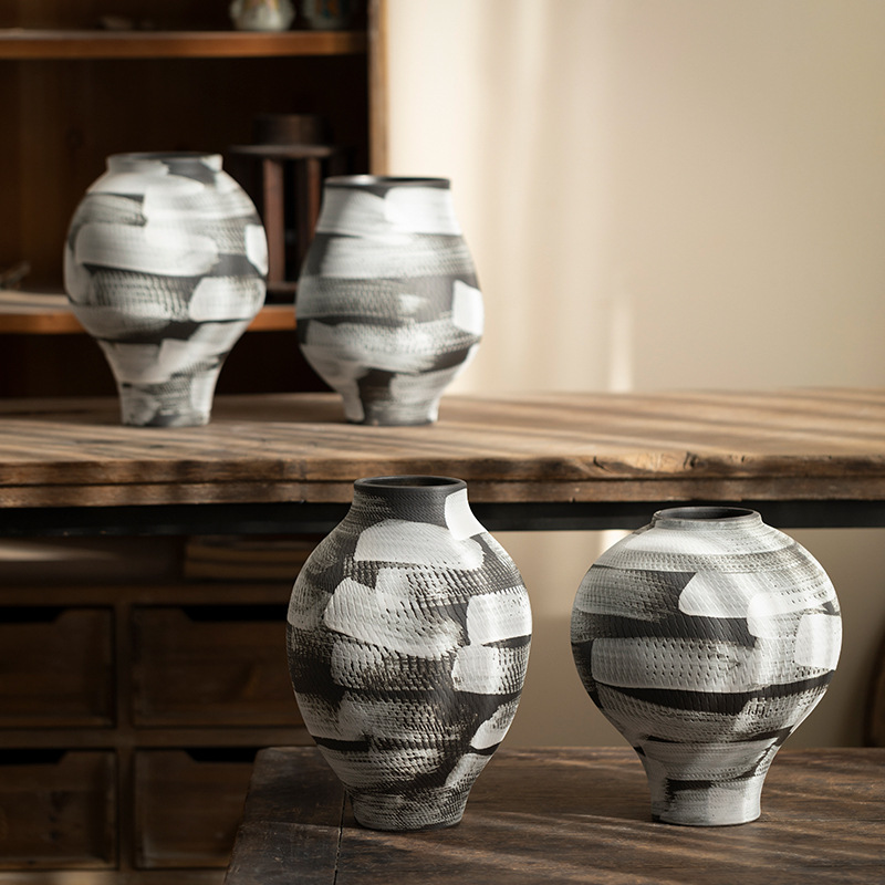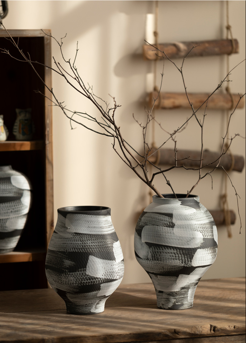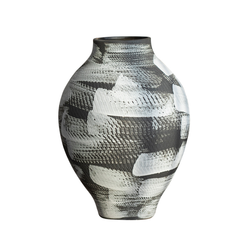 景德镇现代简约花瓶黑白格纹轻奢摆件客厅酒店民宿水培装饰品陶罐
