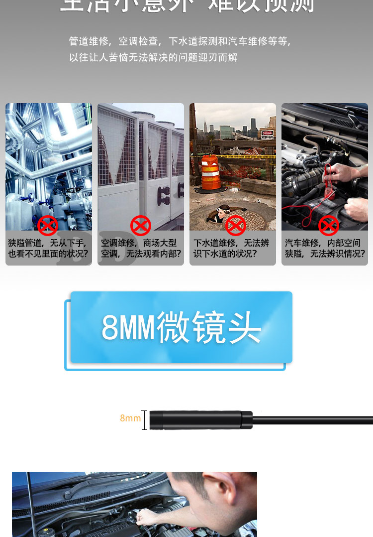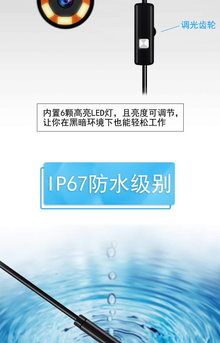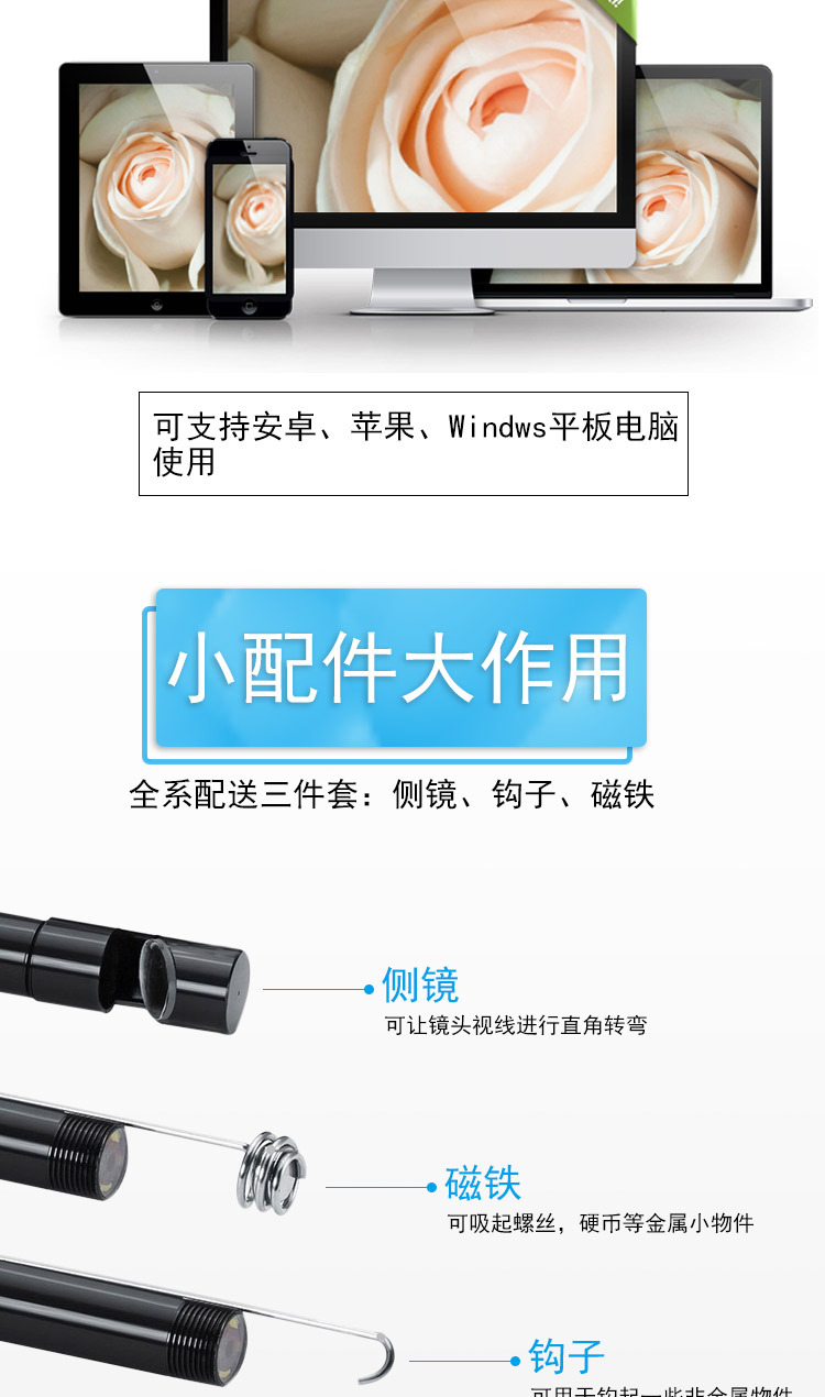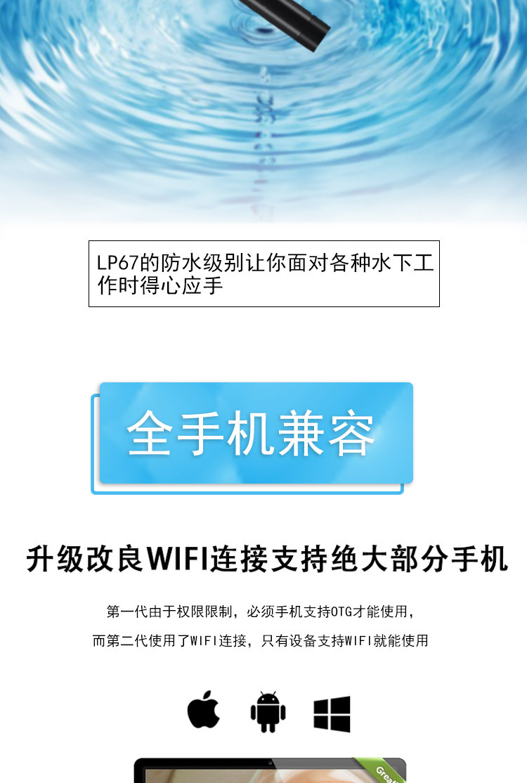 WiFi内窥镜,支持通安卓苹果手机、平板电脑、windows系统电脑,无线传输距离远,性能稳定,在无WiFi的地方, 也可使用(内窥镜自带WiFi无需流量)同时兼容多个手机,画面流畅无卡顿.只需下载APP安装应用程序,便可使用.使用吸盘,便于安装WiFi设备上的电话或其他地方的表面平坦的背面重量轻,便携使用.WiFi设备内置了750mAh的电池,可100minute,通过5V电源充电工作,支持拍照和视频录制手机.
