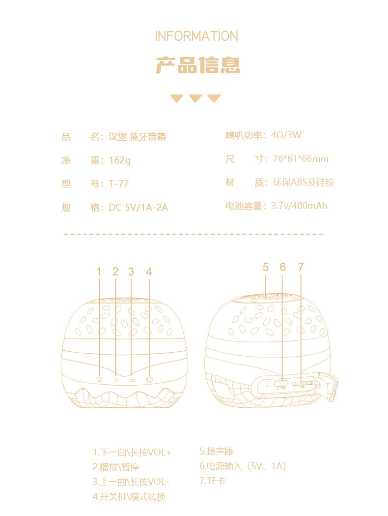 新款汉堡卡通无线蓝牙音响可爱迷你可插卡便携式高颜值伴手礼音响 投诉