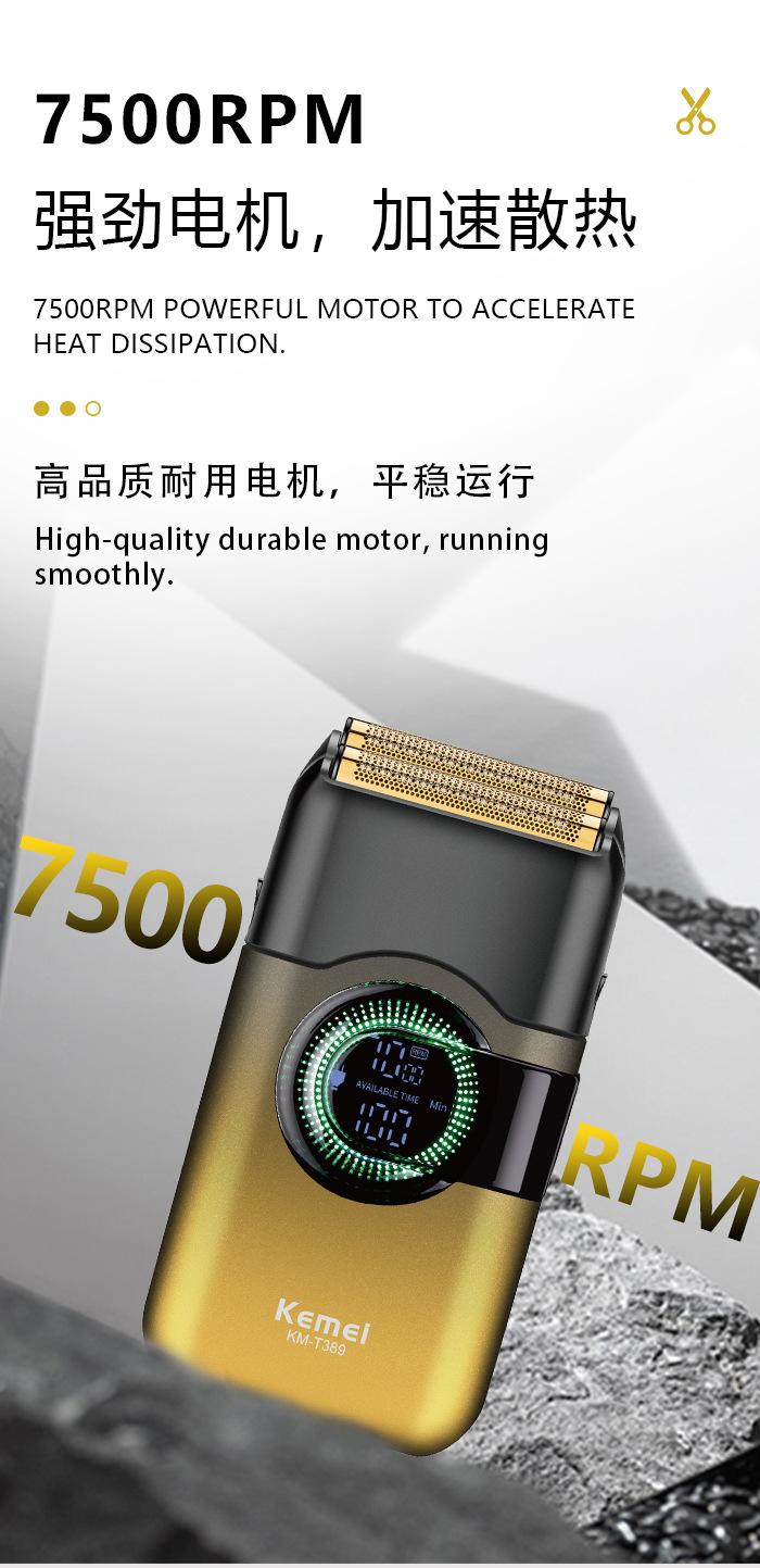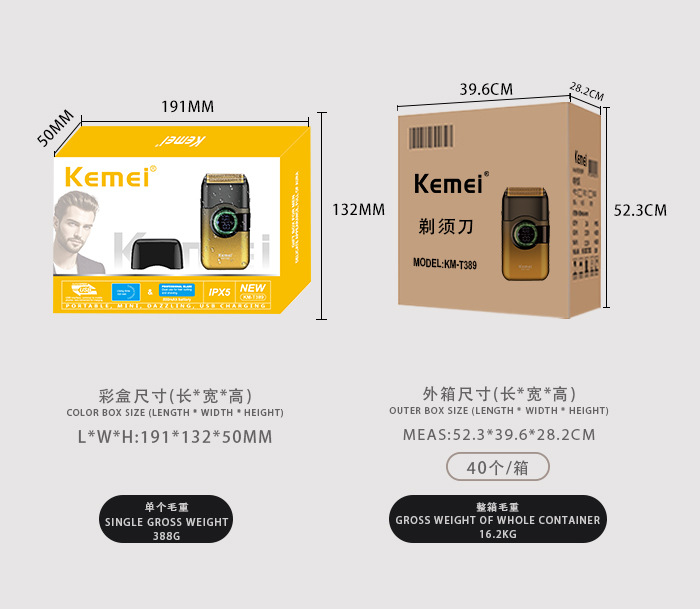 品牌: kemei科美 功能: 全身水洗,LED显示 剃须刀刀头: 往复式2刀头 清洁方式: 刀头可拆卸水洗 续航时间: 100分钟 颜色: KM-T389 电源方式: USB充电 电机类型: 有刷电机 是否有浮动结构: 否 货号: KM-T389 重量: 0.4 kg/套
