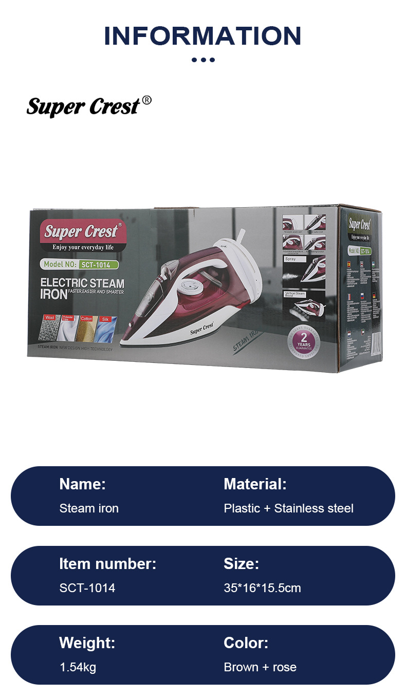 品牌: SUPER CREST 型号: SCT-1014 货号: SCT-1014 调温档位: 二档调温 底板材质: 不锈钢底板 调温方式: 电子调温 有无电线: 有线,无线 额定电压: 220V 额定频率: 详询客服 额定功率: 2000w 重量: 1.54 kg/台