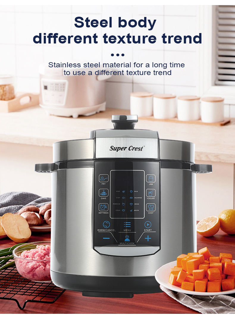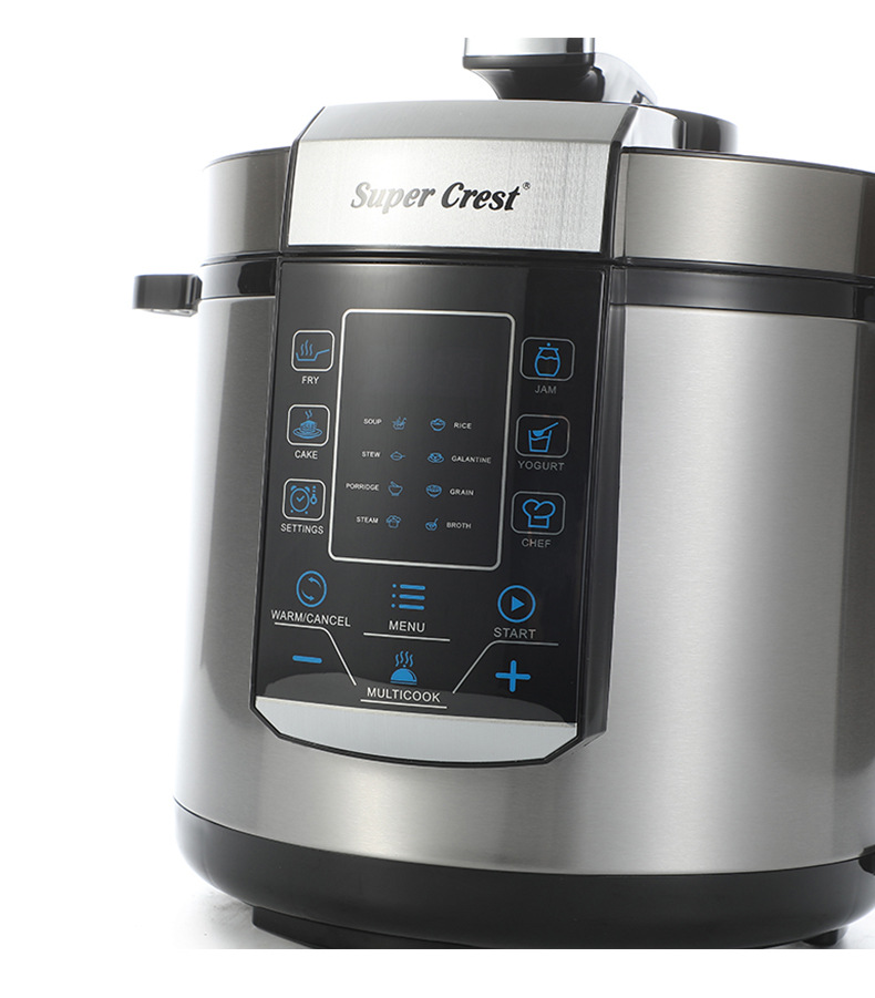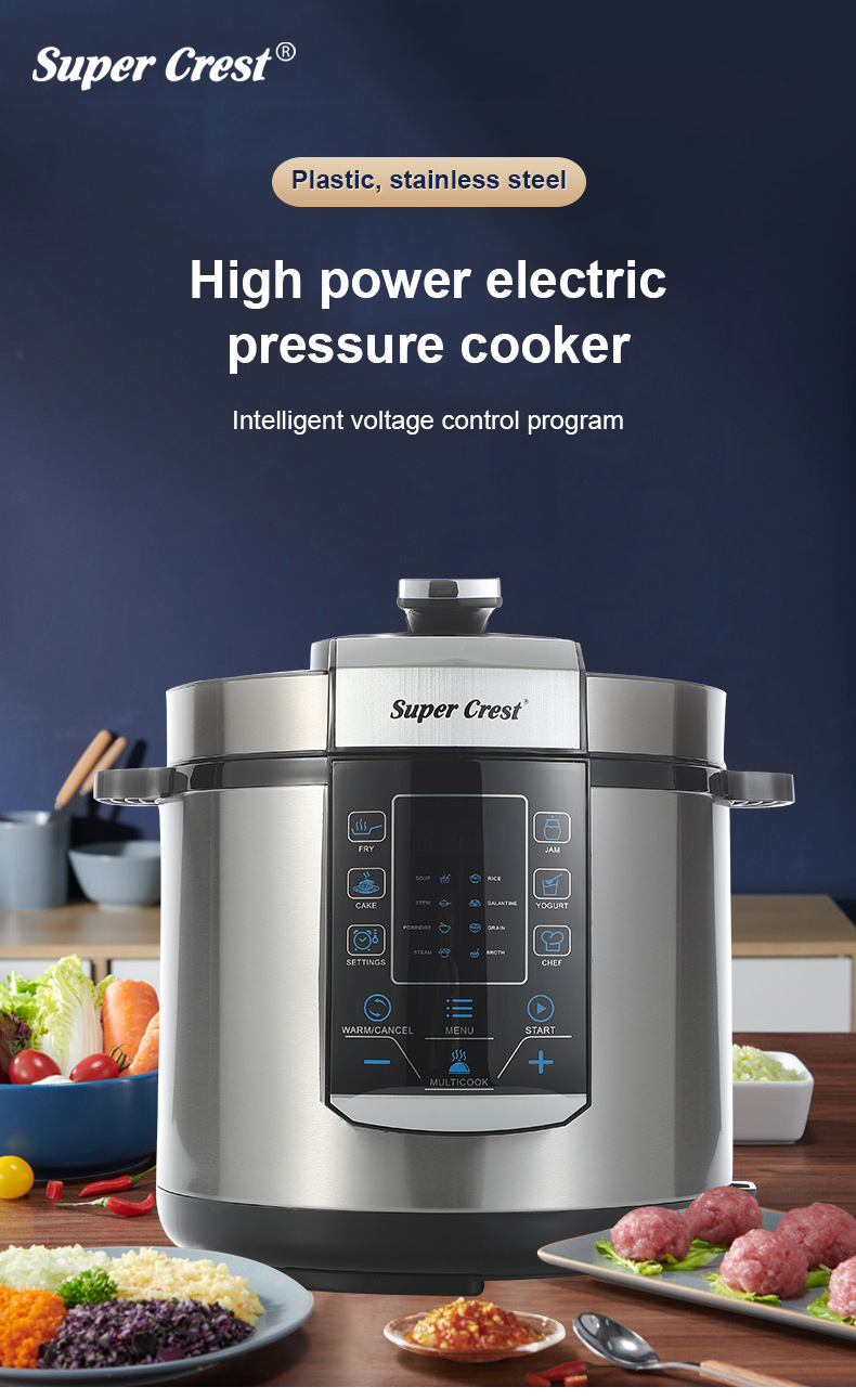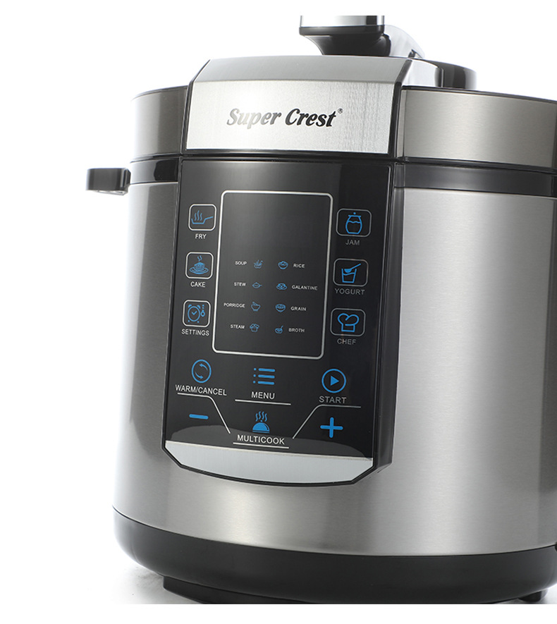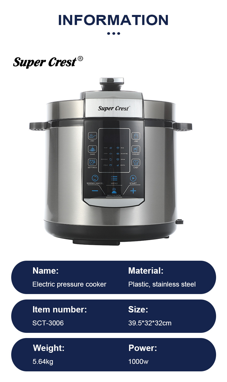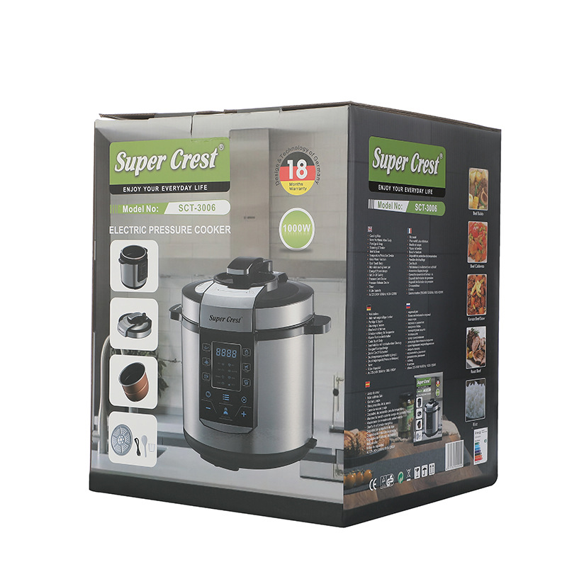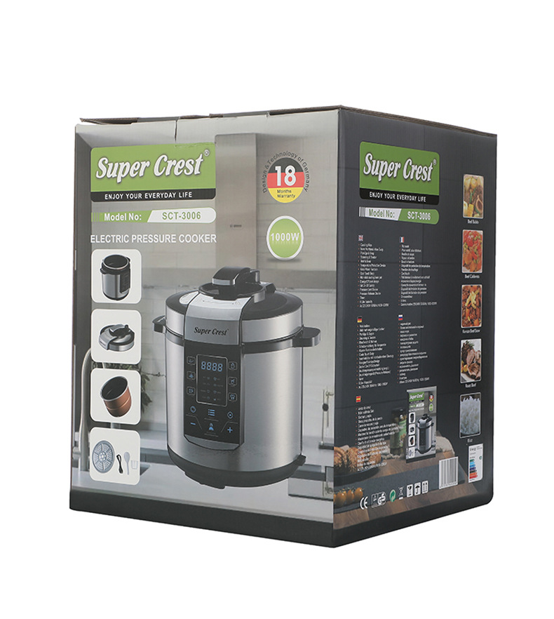 品牌: SUPER CREST 型号: 电压力锅 货号: SCT-3006 容量: 6L 控制方式: 微电脑式 功能: 其他 内胆材质: 不锈钢 额定电压: 220V 额定频率: 50Hz 额定功率: 1000w 重量: 5.64 kg/件