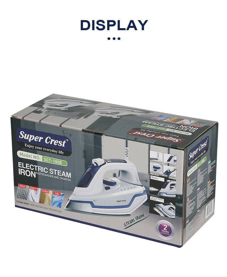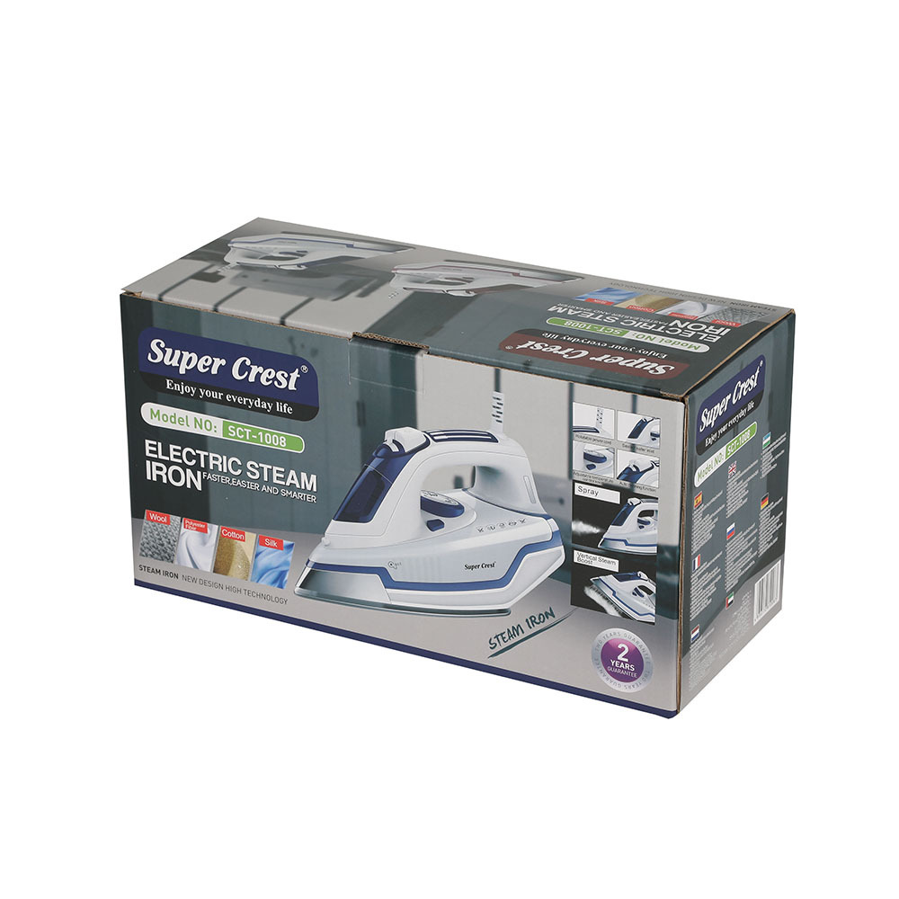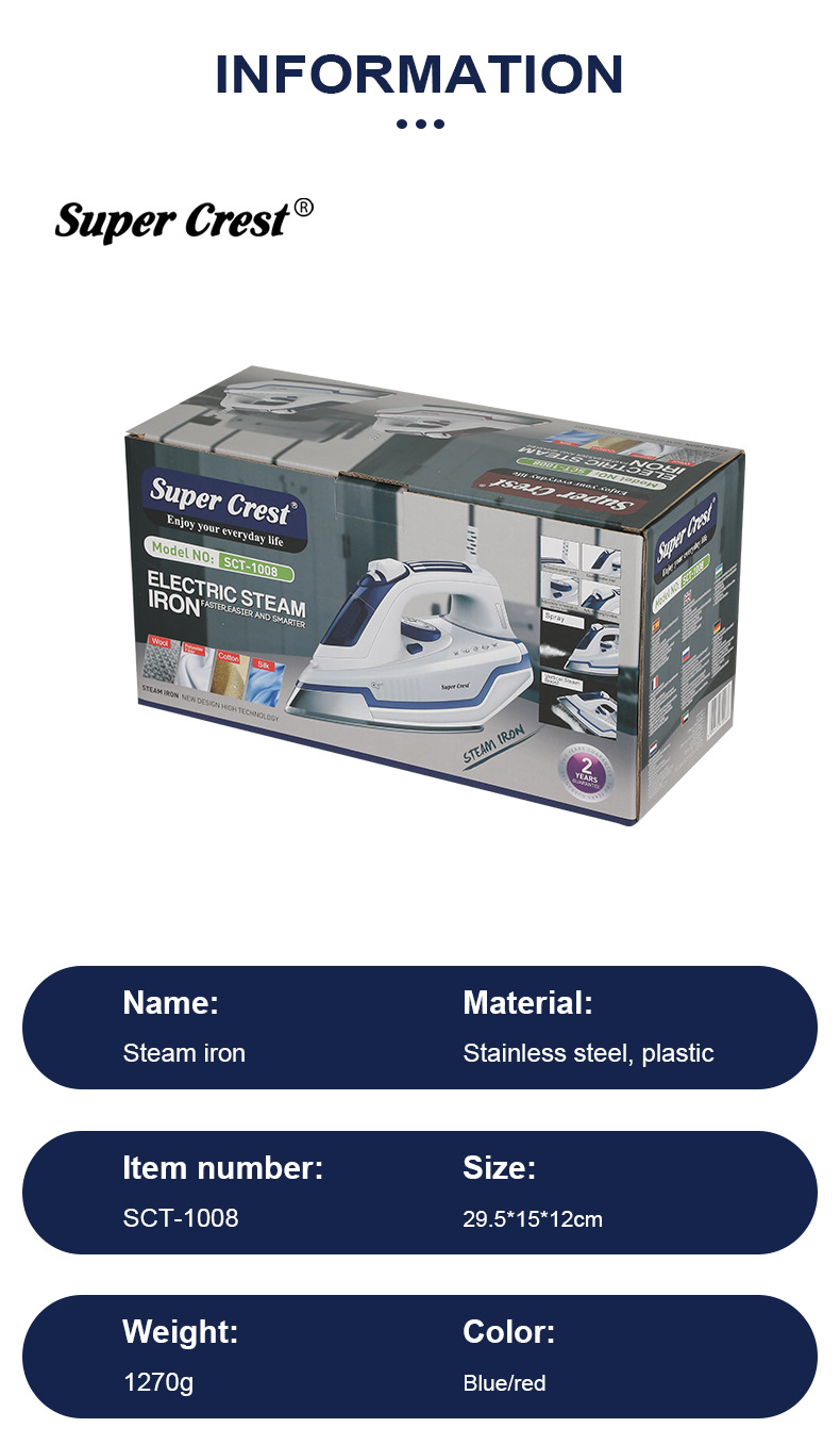 品牌: SUPER CREST 型号: SCT-1008 货号: SCT-1008 调温档位: 五档以上 底板材质: 不锈钢底板 调温方式: 机械调温 有无电线: 有线,无线 额定电压: 220V 额定频率: 50HZ 额定功率: 2400w 重量: 1.6 kg/台