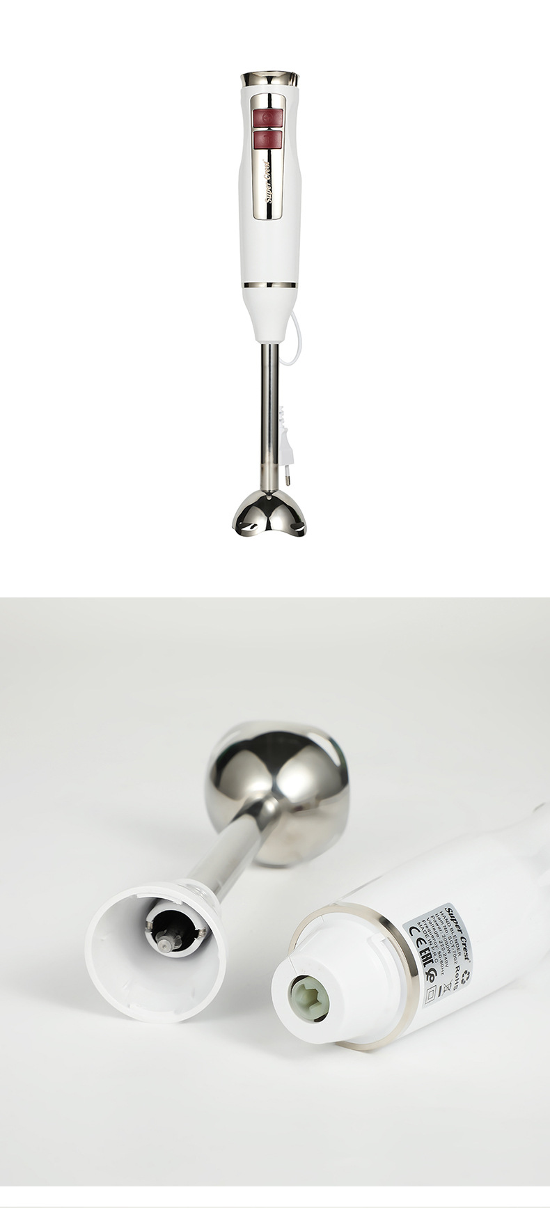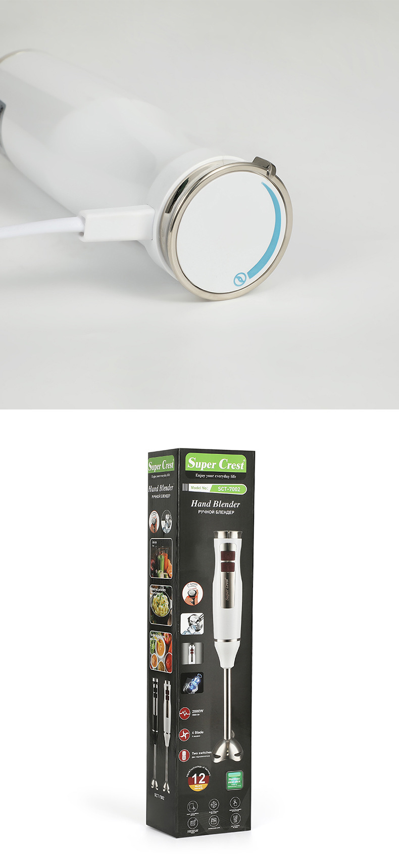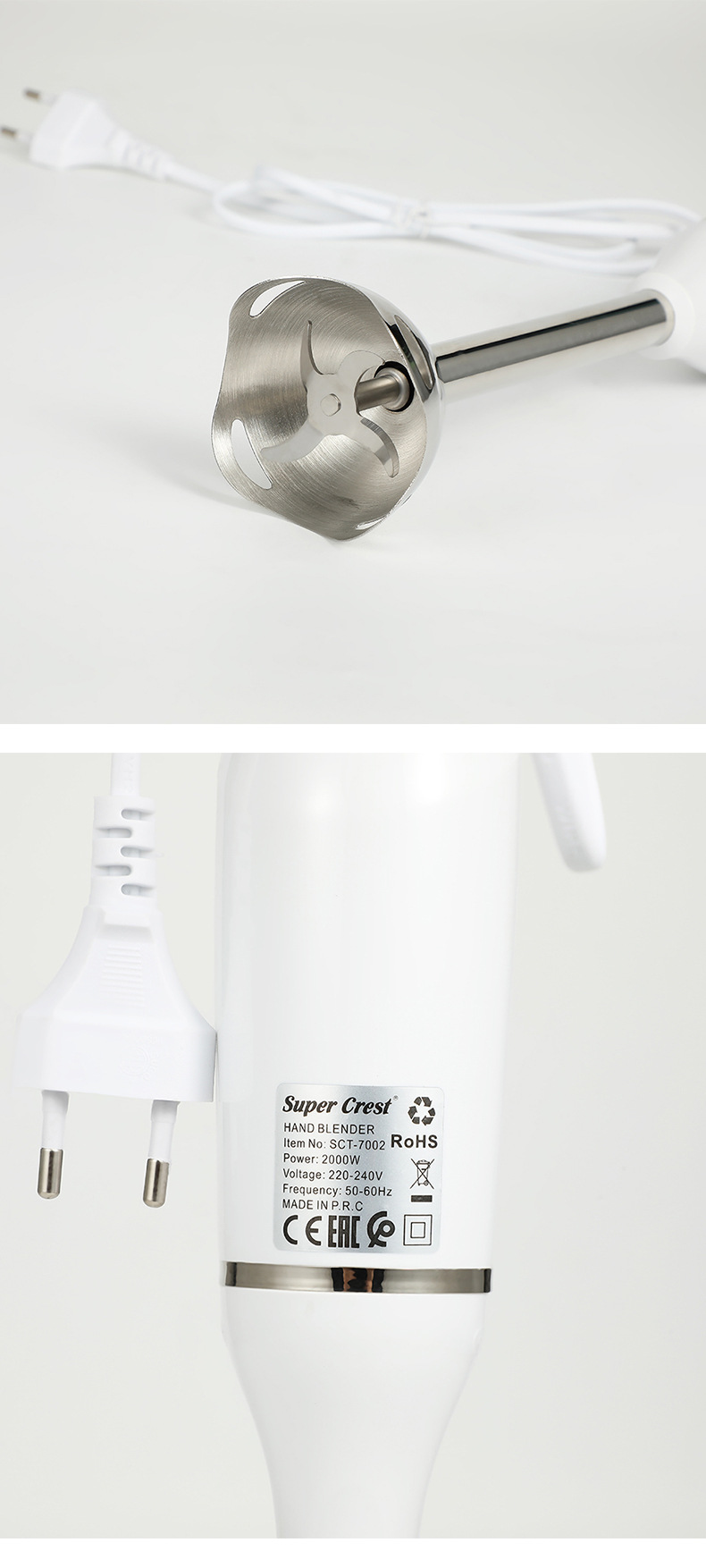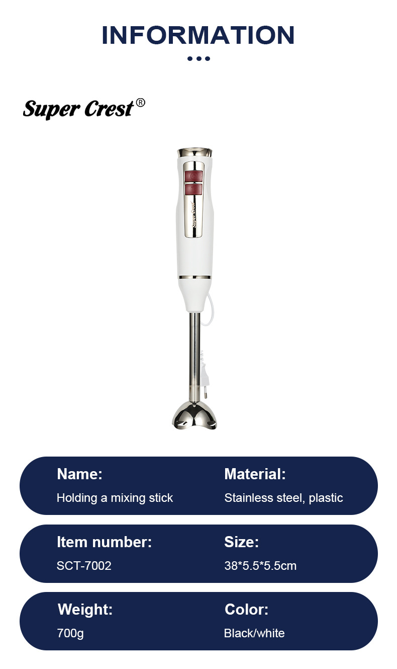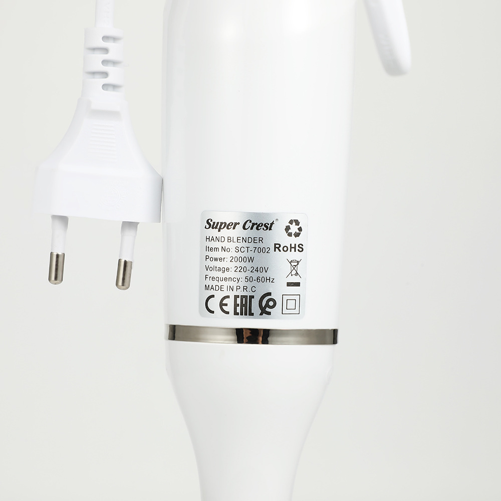 产品类别: 榨汁/搅拌/料理机 容量: 1L以下 3C证书编号: 2016010713909819 功能: 婴儿辅食,绞肉灌肠,快速剥蒜 品牌: SUPER CREST 颜色: 白色,黑色 货号: SCT-7002 调速档位: 2档 额定电压: 111V~240V(含) 电机转速: 10000转以下 重量: 0.7 kg/台