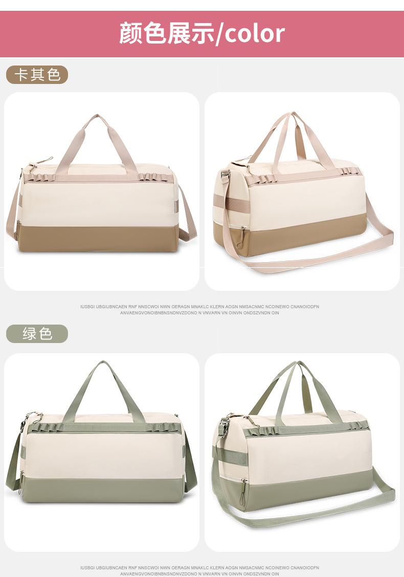 货号: 7072 容量: 20-35L 材质: 尼龙 功能: 干湿分离 品牌: 。 适用性别: 中性/男女均可 里料质地: 涤纶 图案: 纯色 风格: 跨境风潮 颜色: 卡其色,绿色,蓝色,黑色 重量: 0.6 kg/个