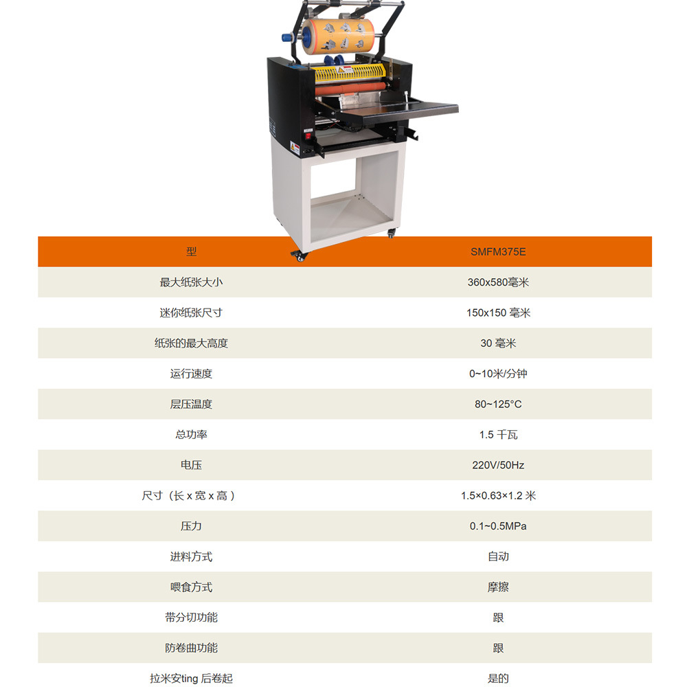 货号: 375E 型号: 375E烫金覆膜机 覆膜宽度: 其他 覆膜速度: 0~10 电热功率: 1.5 覆膜温度: 50-120 适用纸张: 其他 机重: 0.06 外型尺寸: 1500×630×1200 品牌: 莘创 重量: 70.0 kg/台