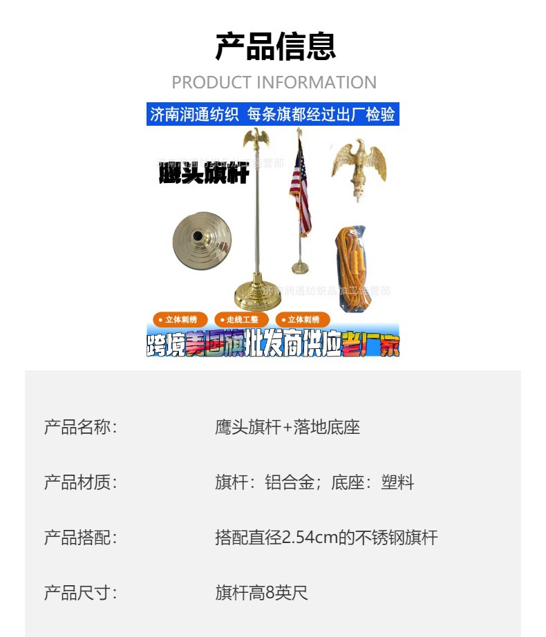 品牌: 润通 货号: 02 材质: 平纹尼 旗帜种类: 国旗 旗面面料: 牛津布 旗杆材料: 不锈钢 是否专利货源: 否 适用节日: 父亲节,万圣节,复活节,其他 重量: 0.5 kg/个