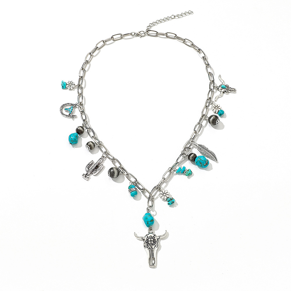 • 产品名称:欧美跨境西部牛仔复古民族风仿松石合金牛头羽毛CCB串珠项链女