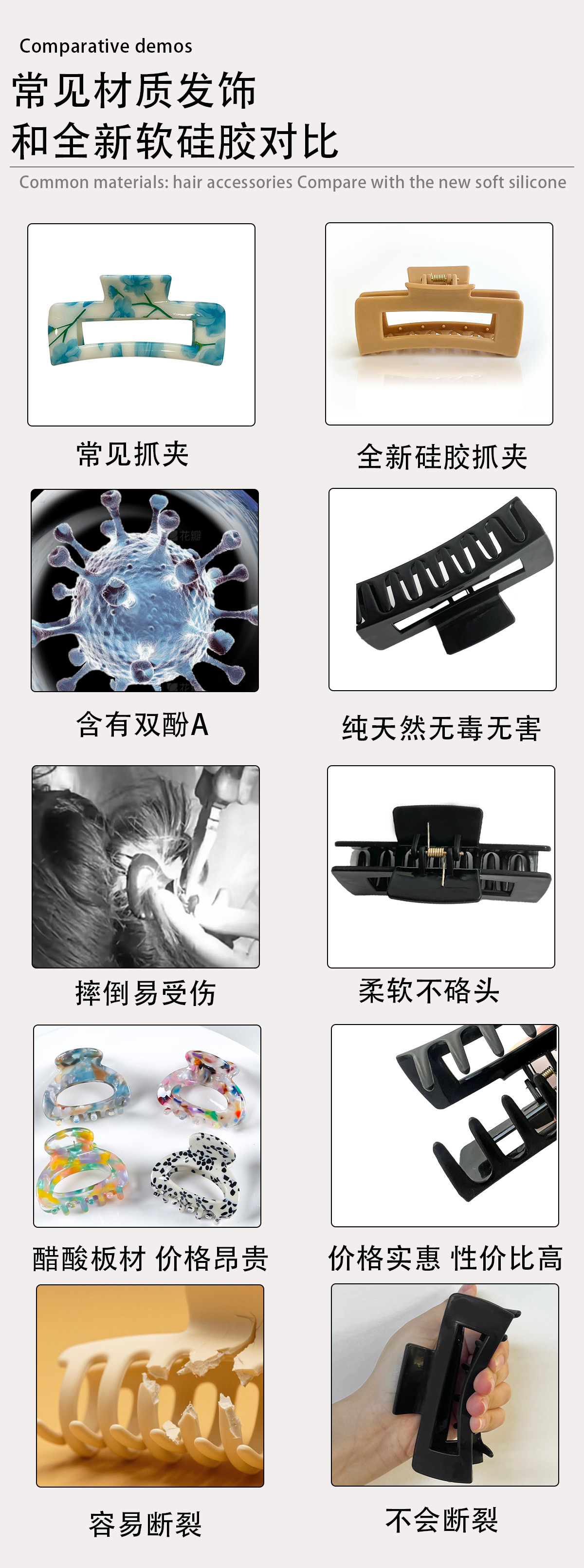 材质: 软胶 货号: ZH99 品牌: 无 样式: 女式 处理工艺: 烤漆 发夹分类: 抓夹 产地: 义乌 有可授权的自有品牌: 否 是否跨境出口专供货源: 是 流行元素: -1 上市年份/季节: 2025年春季 风格: 仙女风 风格分类: 清新甜美 主要销售地区: 南美,东南亚,北美,东北亚,中东,其他 适用人群: 男女通用 流行元素分类: 自然 重量: 0.5 kg/个