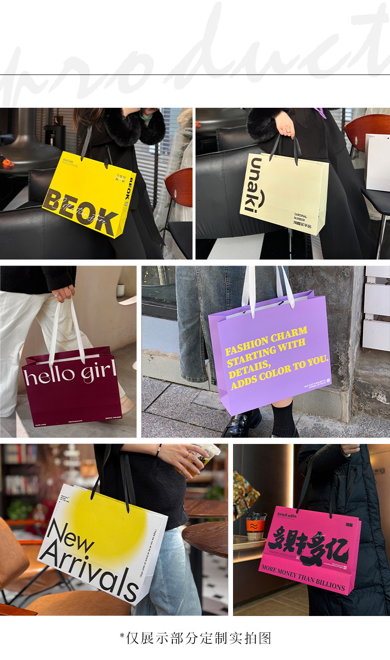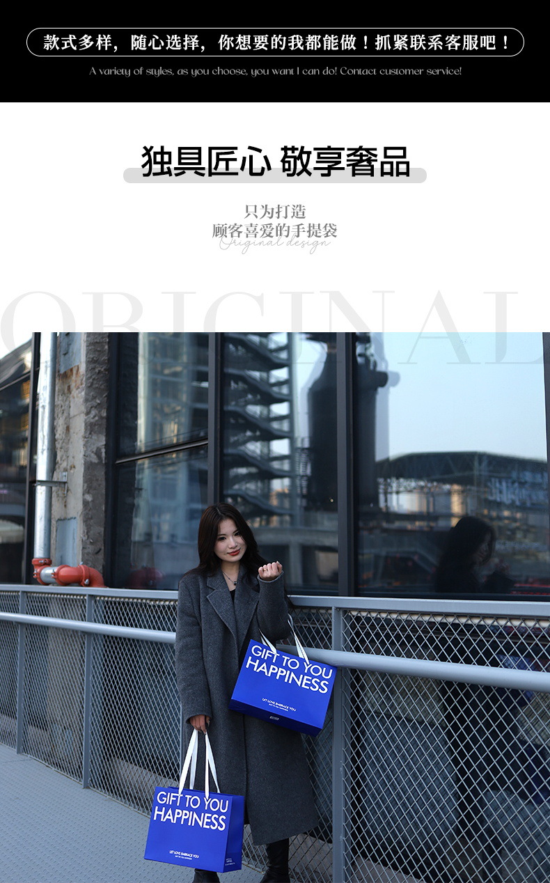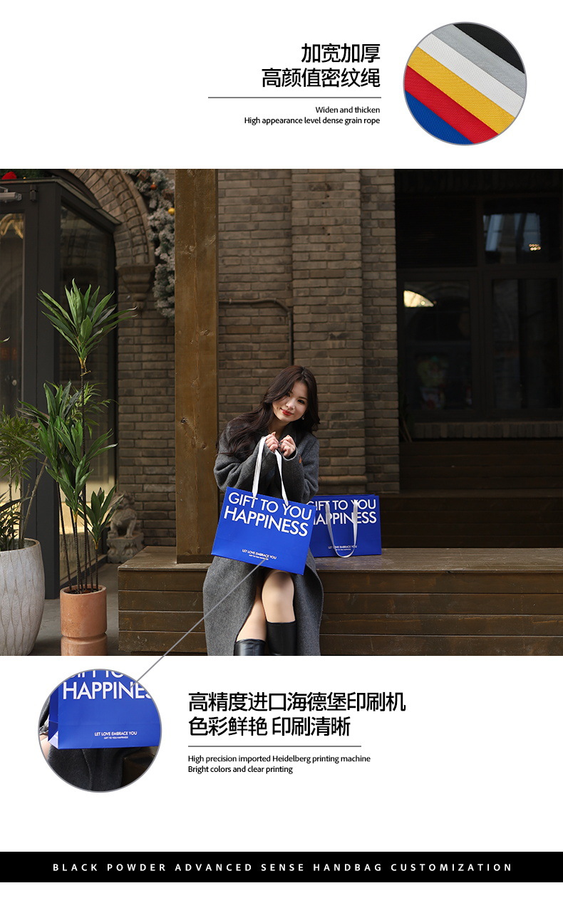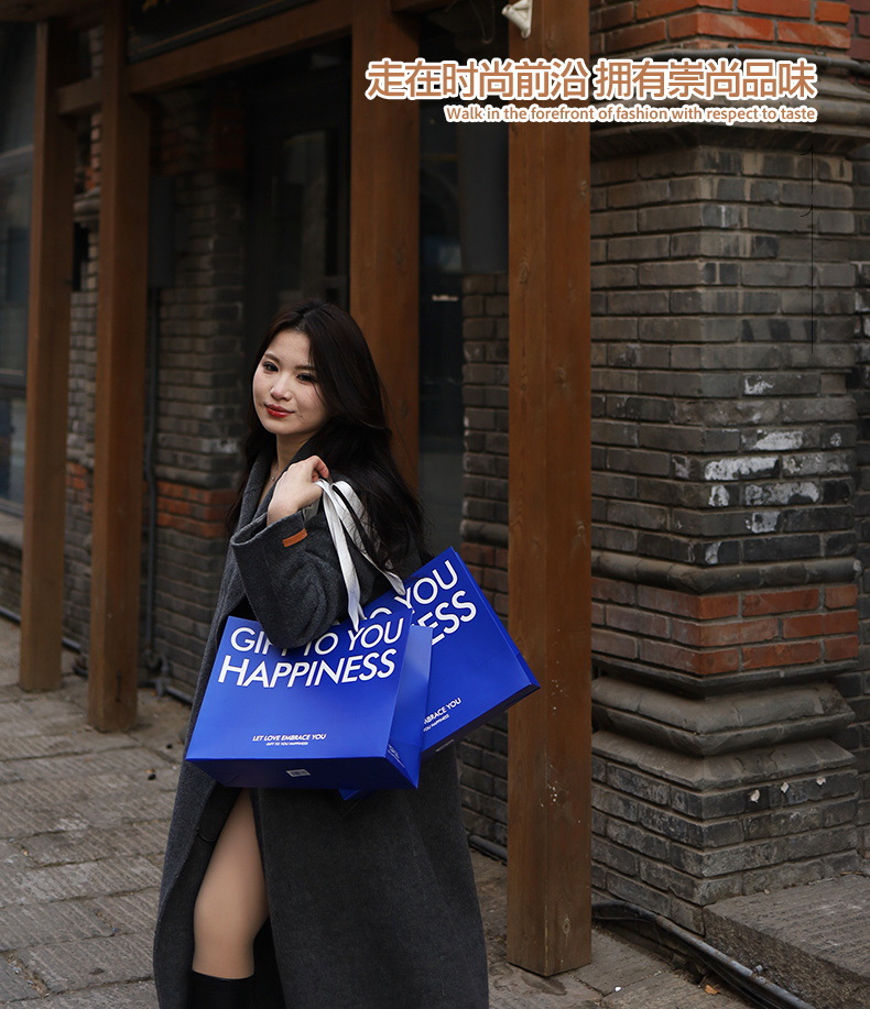 是否跨境出口专供货源: 是 风格: 轻奢 原产国/地区: 中国 适用送礼场合: 礼品袋 日生产量: 10000 产地: 河北 供货类型: 现货尺寸+可定制 加印LOGO: 可以 有可授权的自有品牌: 是 工艺: 彩色印刷 规格: 35*13*26cm横版 颜色: 蓝色字母款K-003 材质: 白卡纸 重量: 0.5 kg/个
