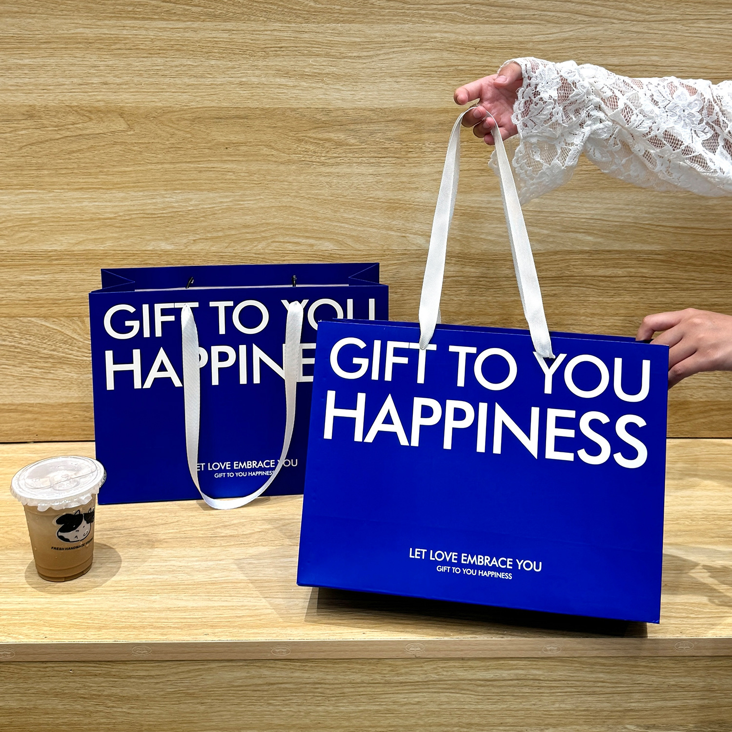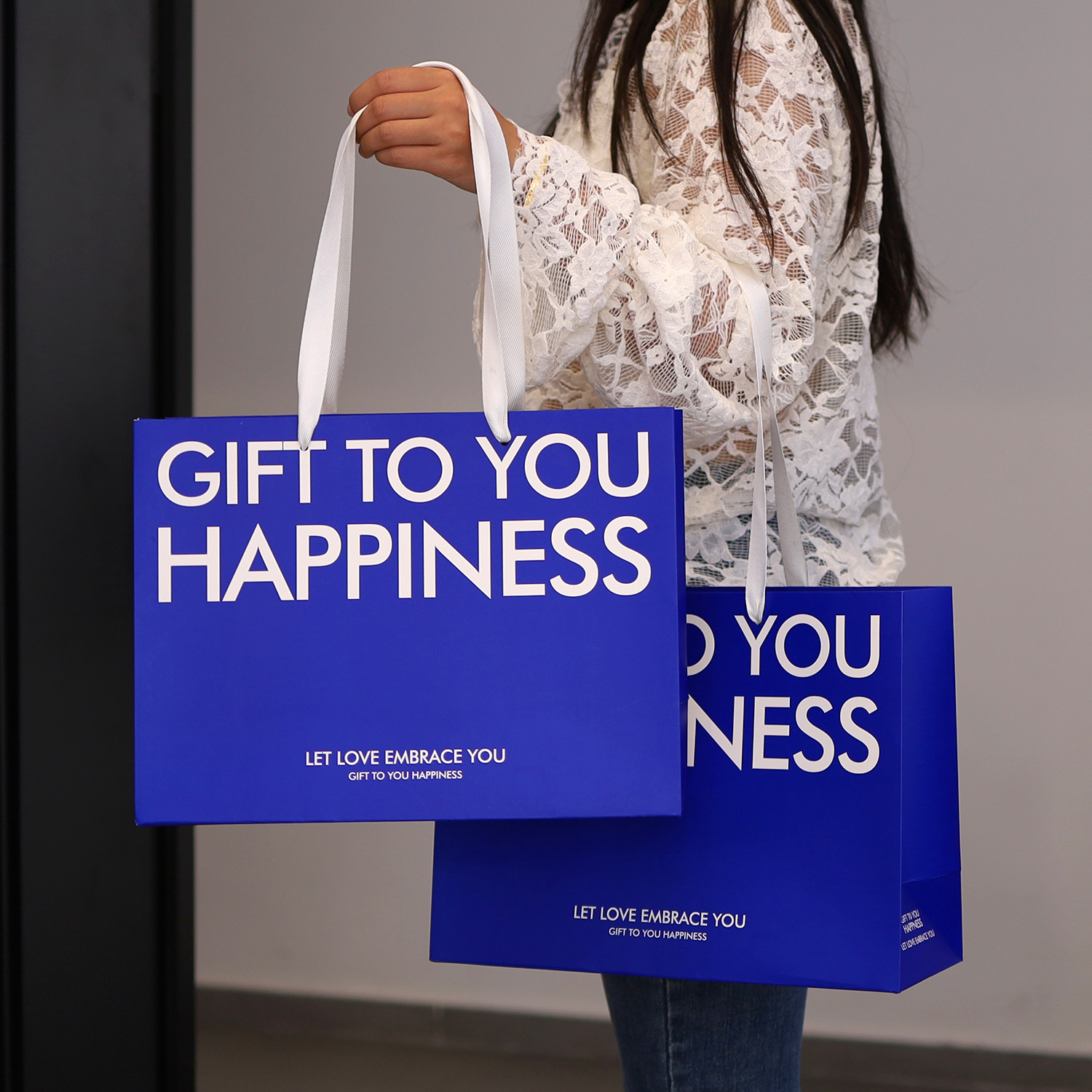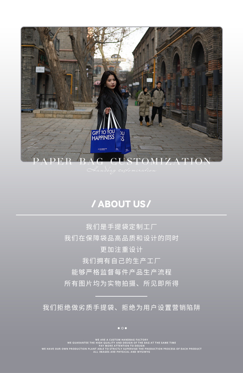 是否跨境出口专供货源: 是 风格: 轻奢 原产国/地区: 中国 适用送礼场合: 礼品袋 日生产量: 10000 产地: 河北 供货类型: 现货尺寸+可定制 加印LOGO: 可以 有可授权的自有品牌: 是 工艺: 彩色印刷 规格: 35*13*26cm横版 颜色: 蓝色字母款K-003 材质: 白卡纸 重量: 0.5 kg/个