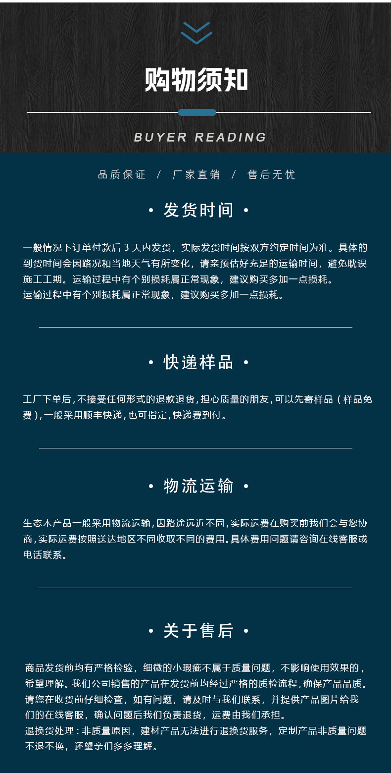 • 样品免费/义乌购重点推荐供应商!主营竹木纤维木饰面板墙板,户外塑木装饰地板墙板,室内外格栅板,UV大理石板、SPC地板等各类装饰装修建材,25年源头装修建材工厂,电话微信:15376053971