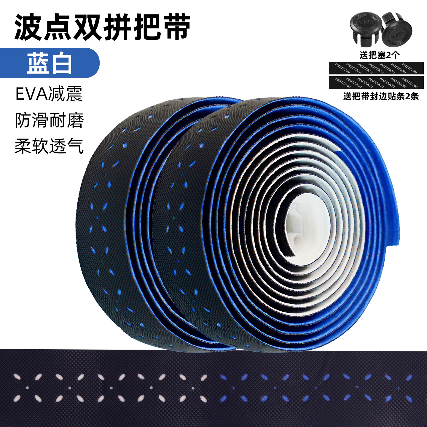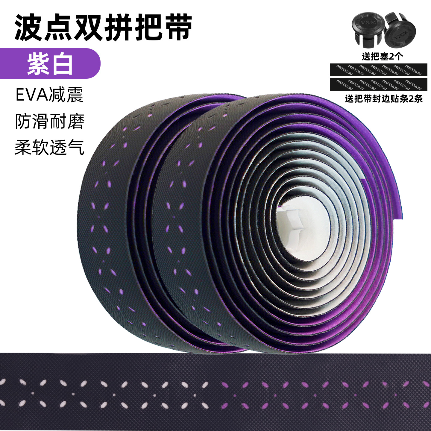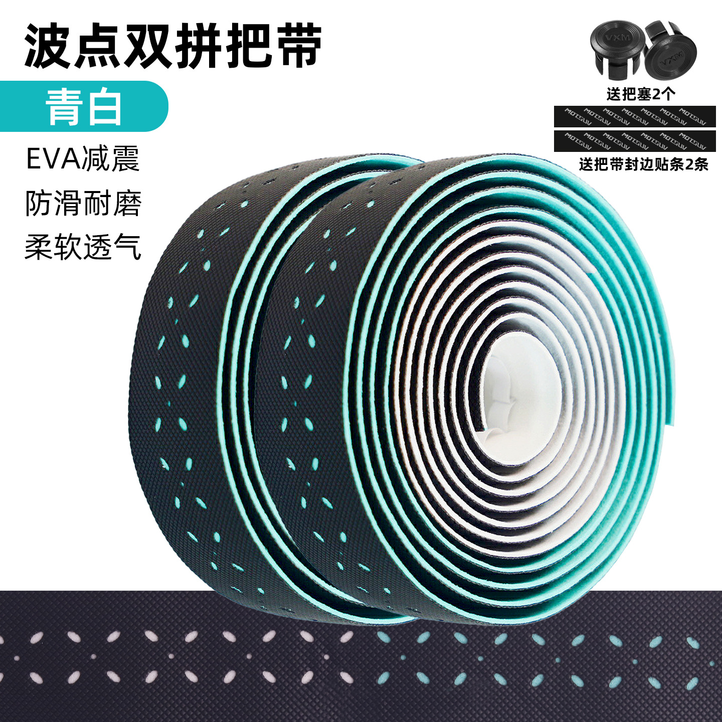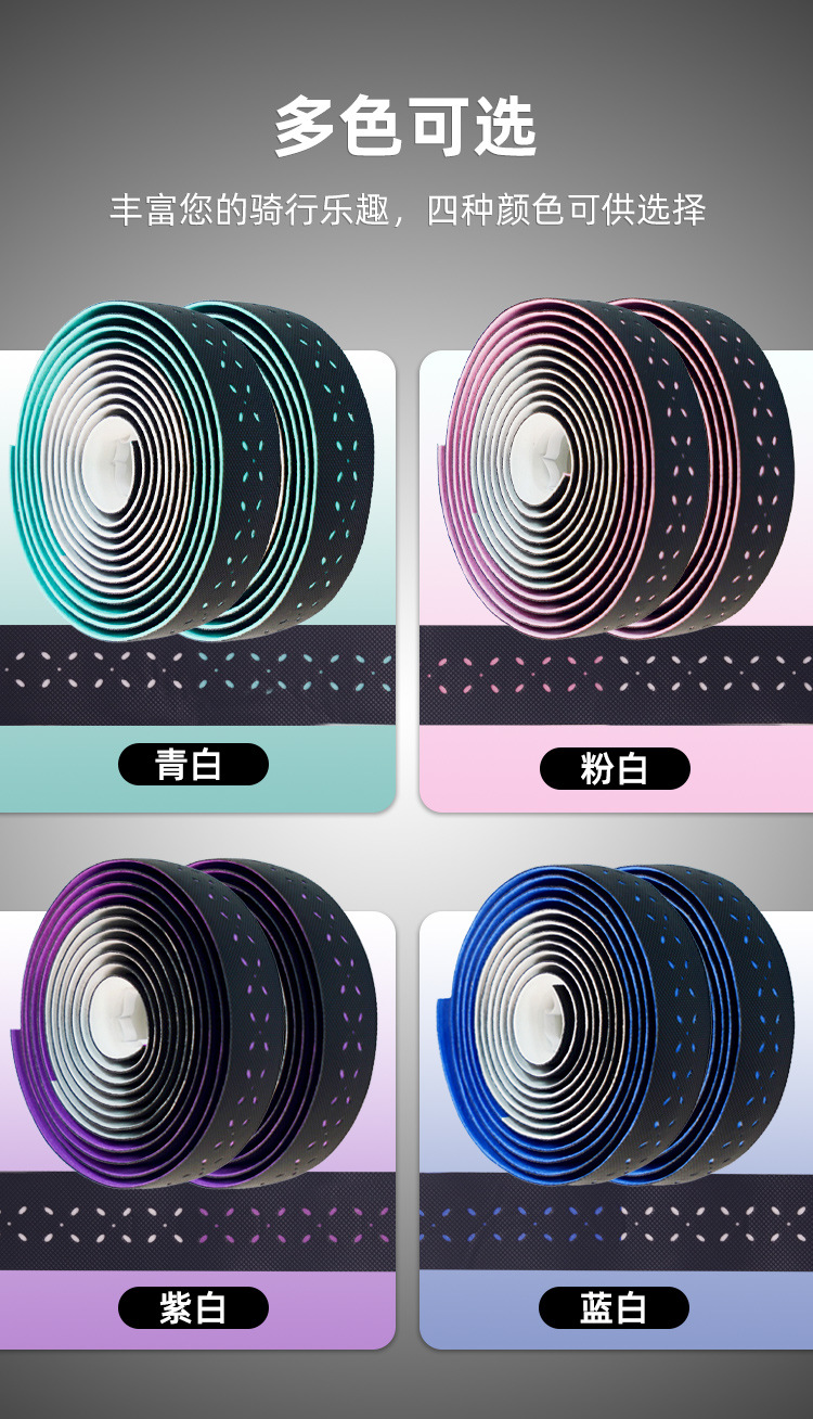 材质: EVA 产品编号: 公路自行车木乃伊把带 型号: 公路车波点砖面打孔双拼把带 是否进口: 否 颜色: 青白,紫白,粉白,蓝白 品牌: VXM 有可授权的自有品牌: 是 是否跨境出口专供货源: 是 专利类型: 无 外贸出口认证: 无 质检报告编号: 无 规格: 波点双拼绑带 重量: 0.5 kg/对