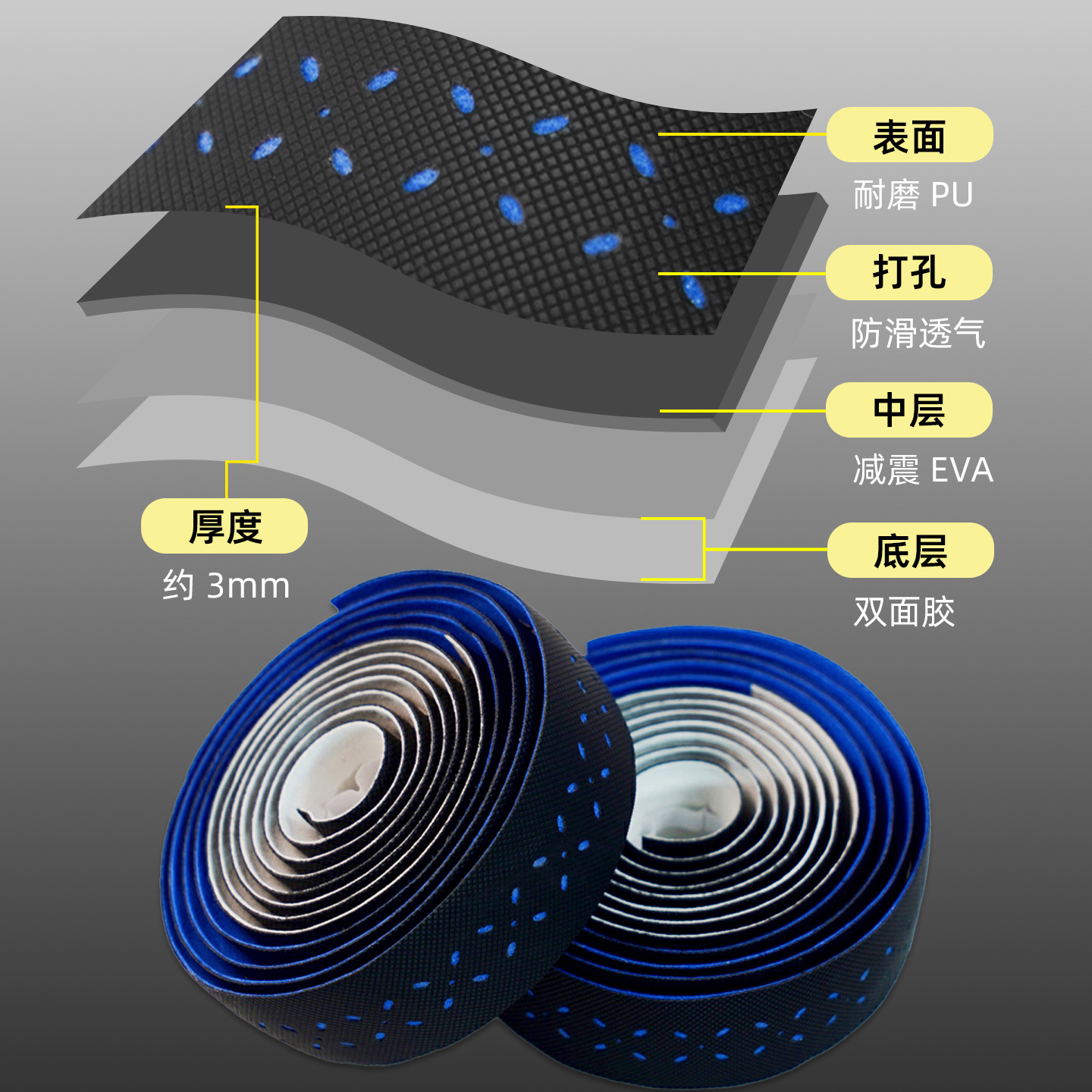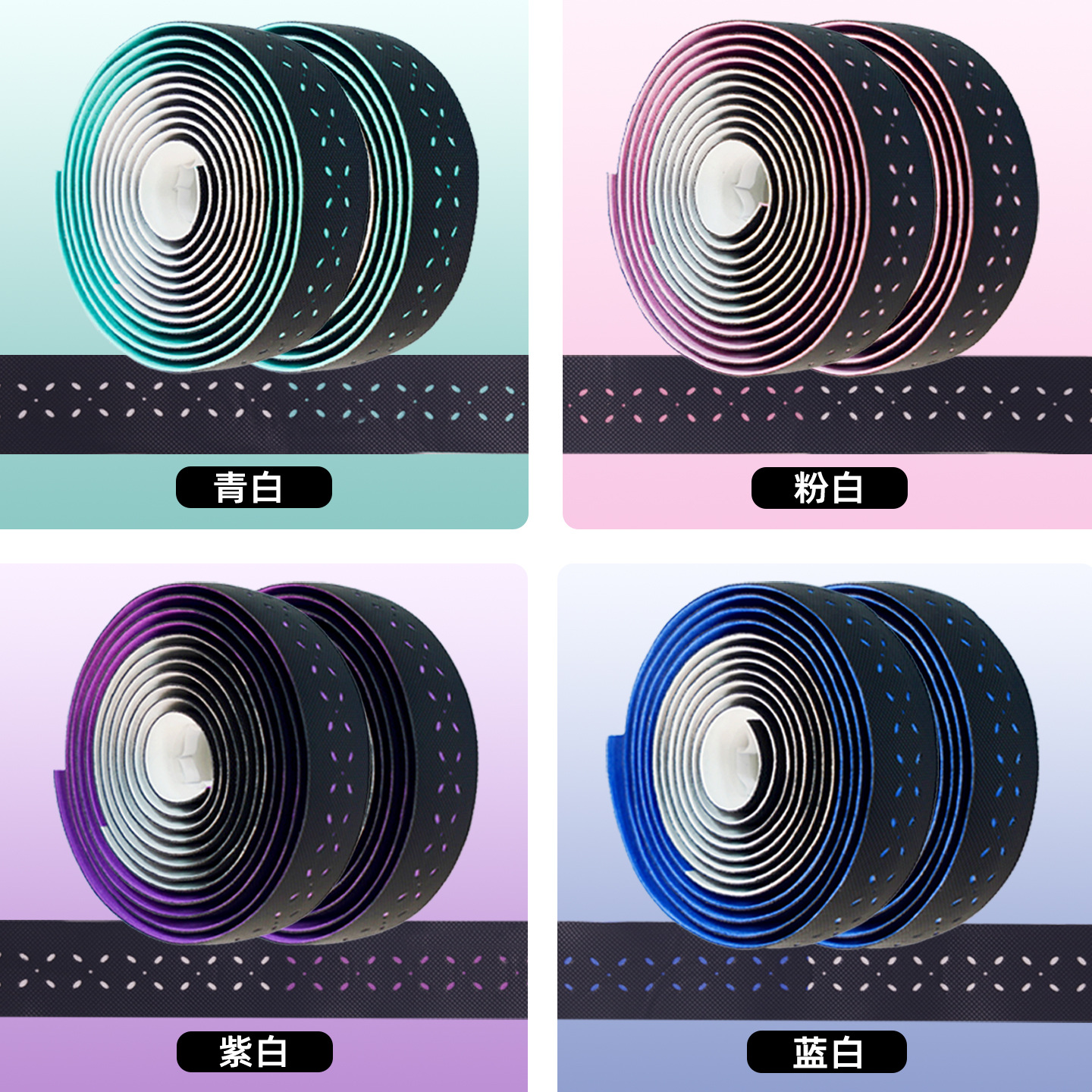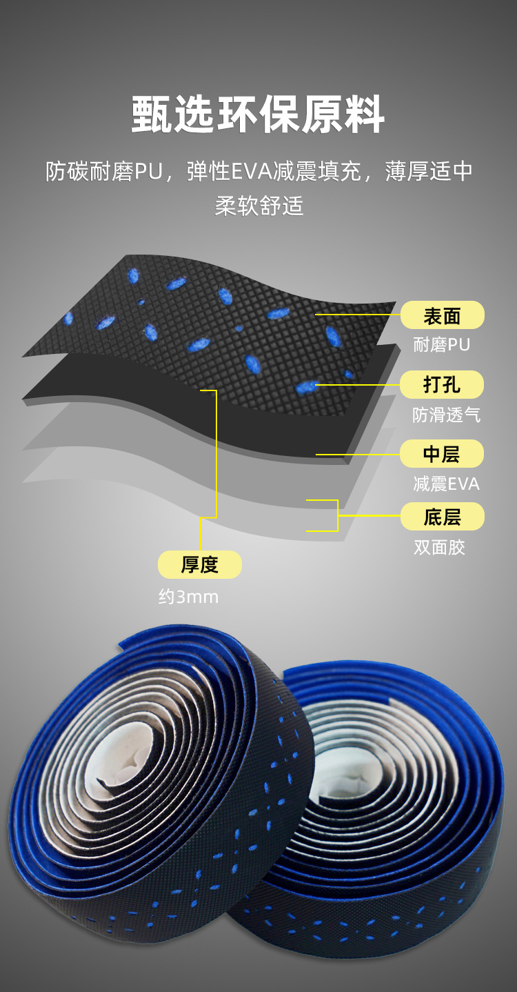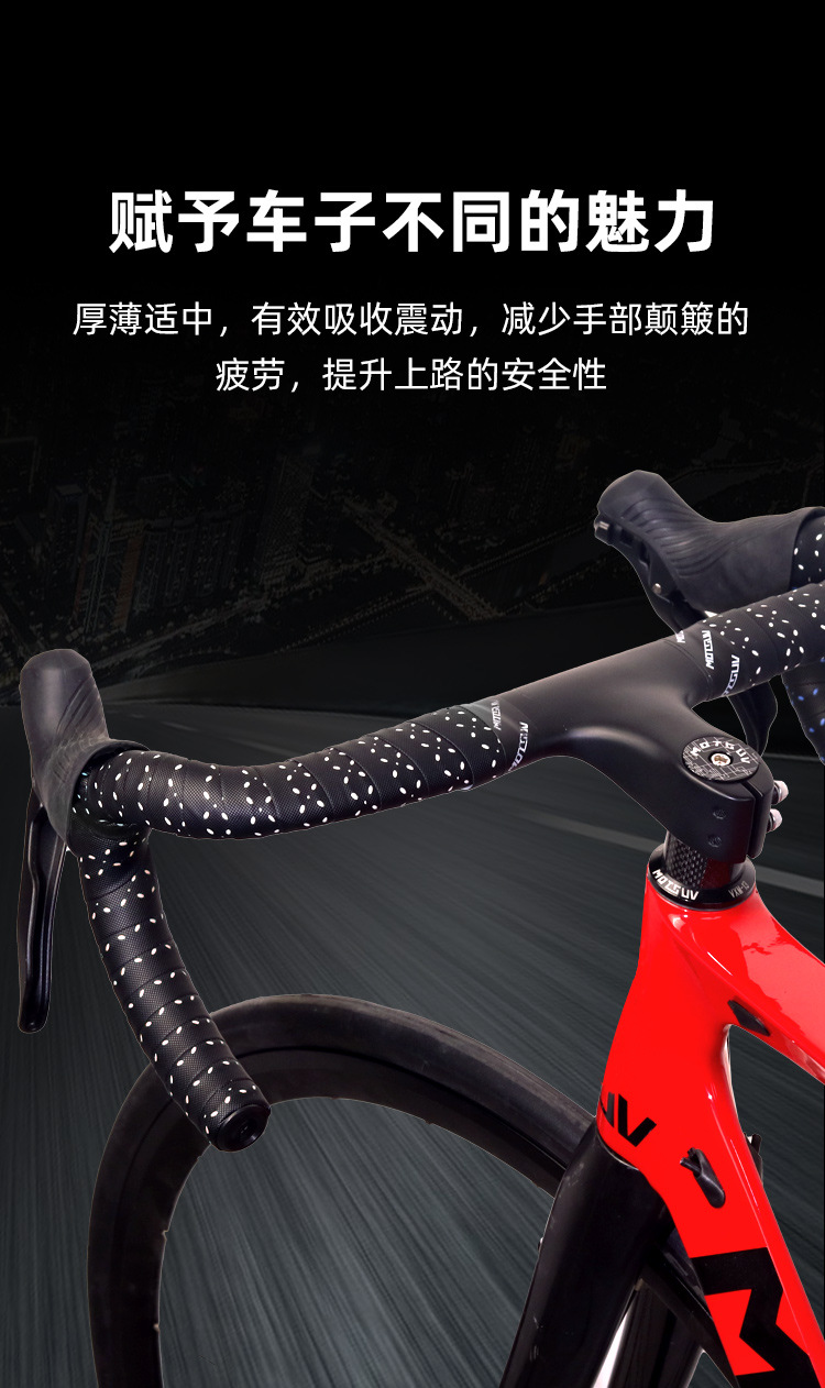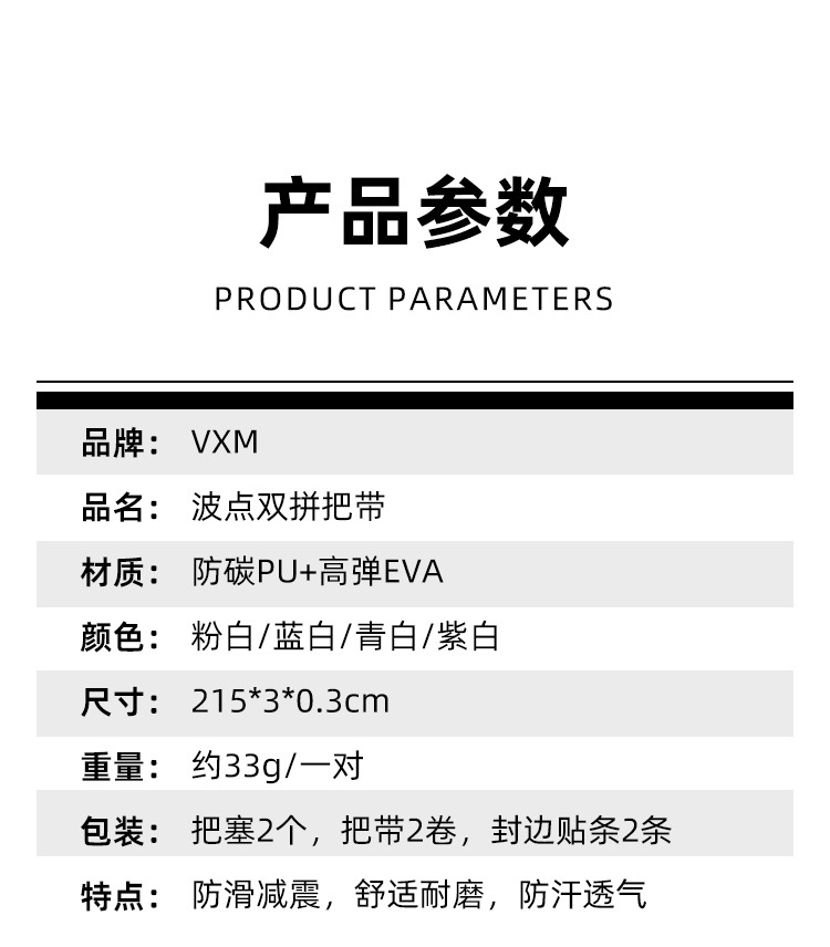 材质: EVA 产品编号: 公路自行车木乃伊把带 型号: 公路车波点砖面打孔双拼把带 是否进口: 否 颜色: 青白,紫白,粉白,蓝白 品牌: VXM 有可授权的自有品牌: 是 是否跨境出口专供货源: 是 专利类型: 无 外贸出口认证: 无 质检报告编号: 无 规格: 波点双拼绑带 重量: 0.5 kg/对