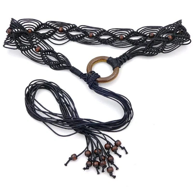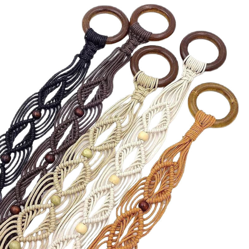 波西米亚腰带编织腰带复古民族风编织带咖色木珠蜡绳打结腰带男女