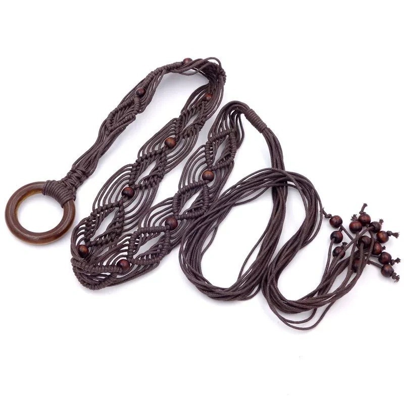 波西米亚腰带编织腰带复古民族风编织带咖色木珠蜡绳打结腰带男女 投诉