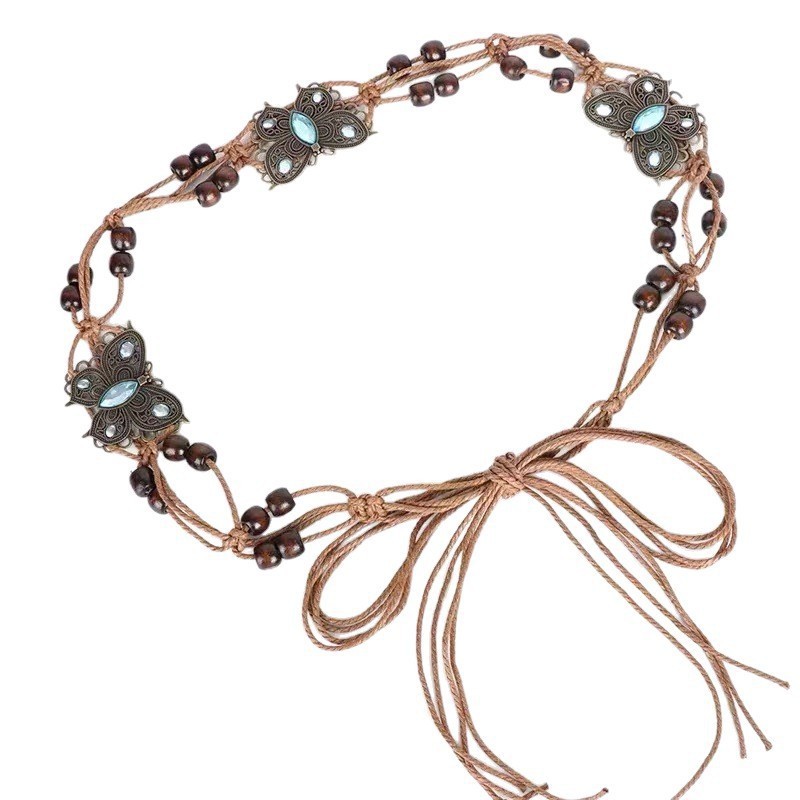 波西米亚风百搭编织腰带女民族风蝴蝶串珠腰链时尚高级感腰带腰饰