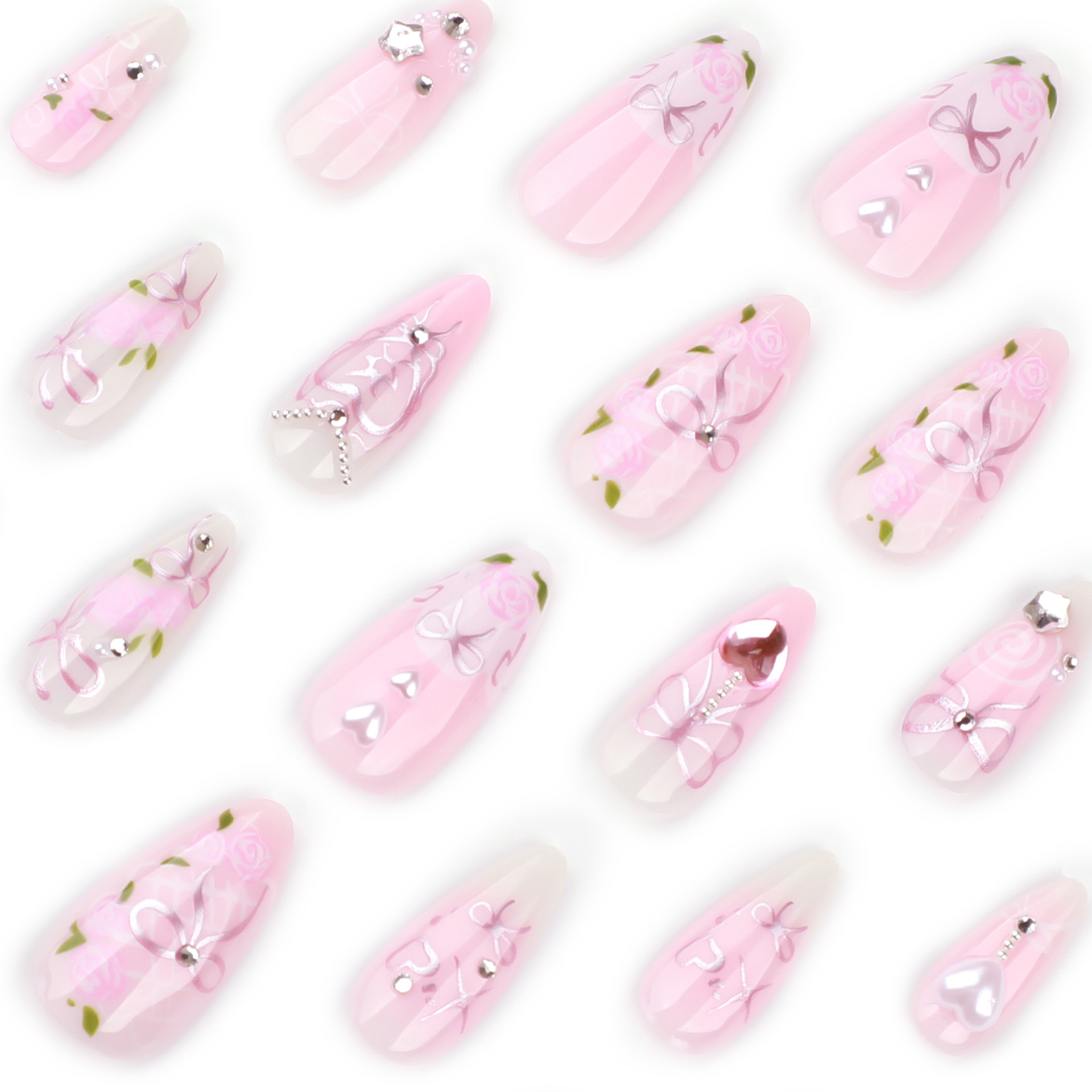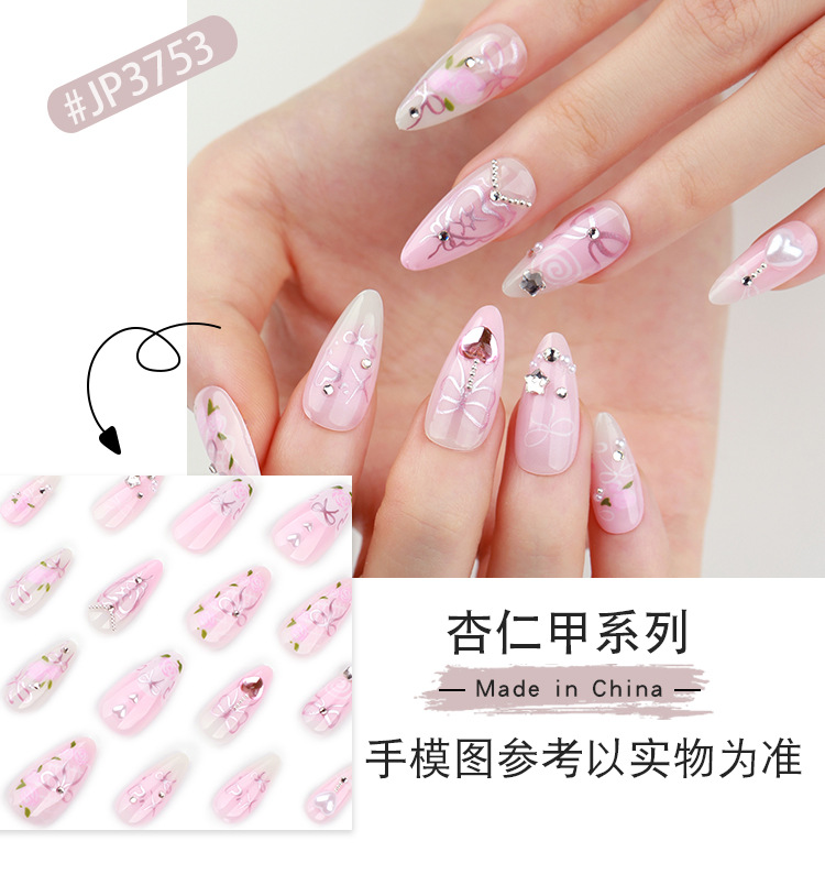 甜美粉色穿戴甲星星闪钻美甲假指甲短款杏仁穿戴式甲片成品批发