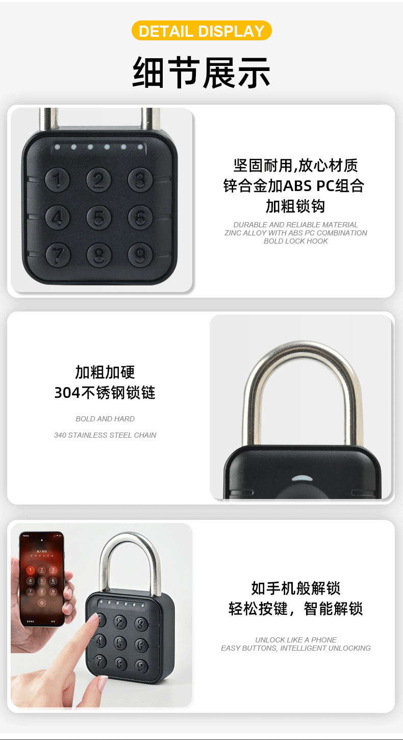 加工定制: 是 品牌: 包心 材质: 锌合金 型号: sy12 适用范围: 通用 规格: 指纹,数字,指纹+涂鸦APP,数字+涂鸦 类型: 指纹类 是否跨境出口专供货源: 是 主要下游平台: wish,速卖通,独立站,LAZADA, 主要销售地区: 南美,东南亚,北美,东北亚,中东,其他 有可授权的自有品牌: 是 风格: 现代简约 重量: 0.5 kg/个
